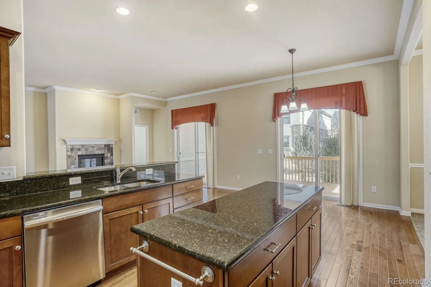The spacious living room is anchored by a cozy gas fireplace with tile surround, creating a warm and inviting atmosphere. The kitchen is well equipped with granite countertops, maple cabinetry with rollout drawers, a center island, pantry, stainless steel appliances, double oven, and gas cooktop—perfect for everyday living and hosting. Granite countertops extend into the bathrooms for a cohesive, upscale finish.