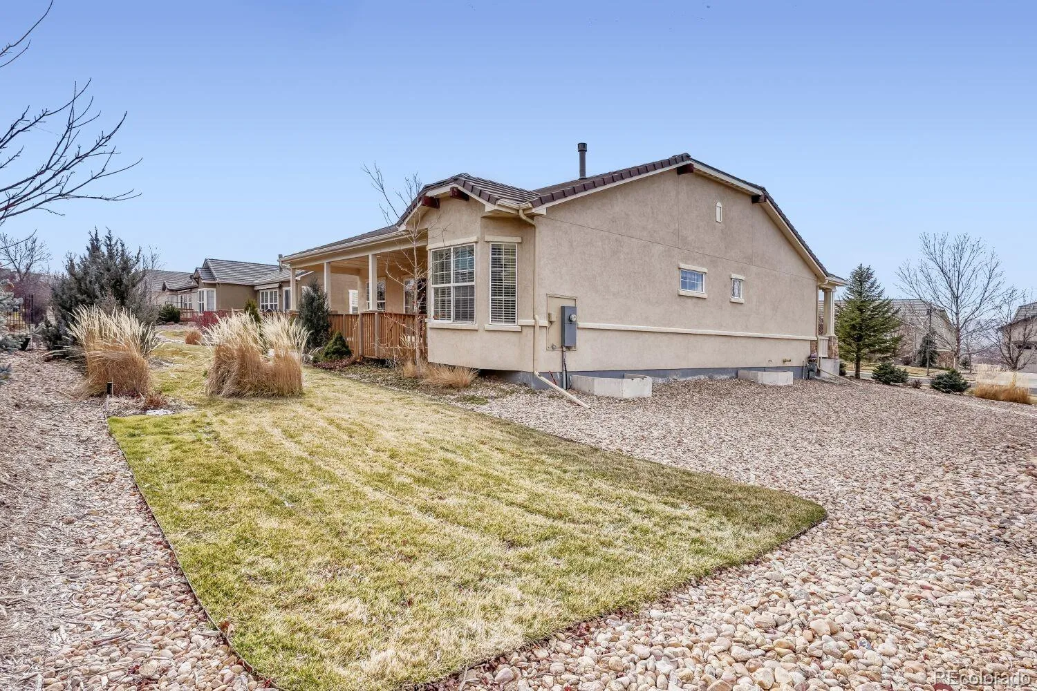 Outdoor living includes a large, covered, east-facing deck—ideal for enjoying cool Colorado evenings. The Mountain elevation adds curb appeal with enhanced stone accents and mature landscaping.