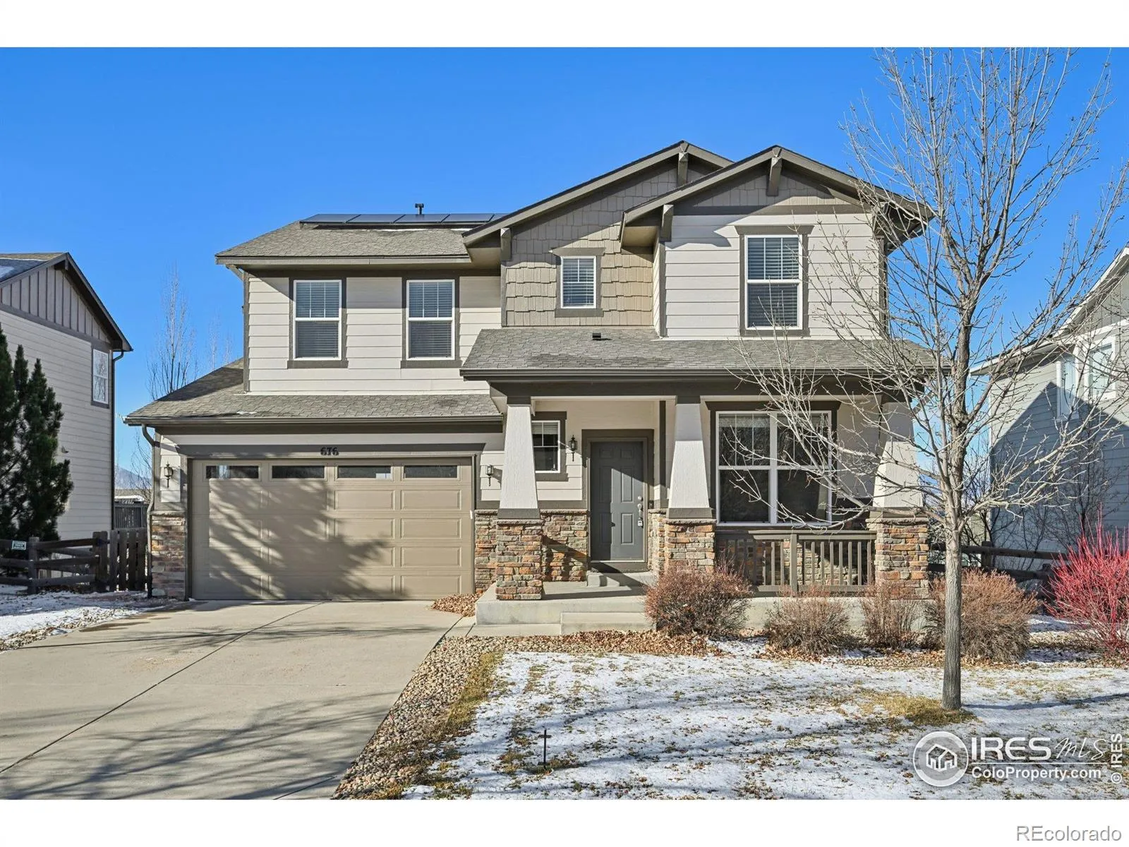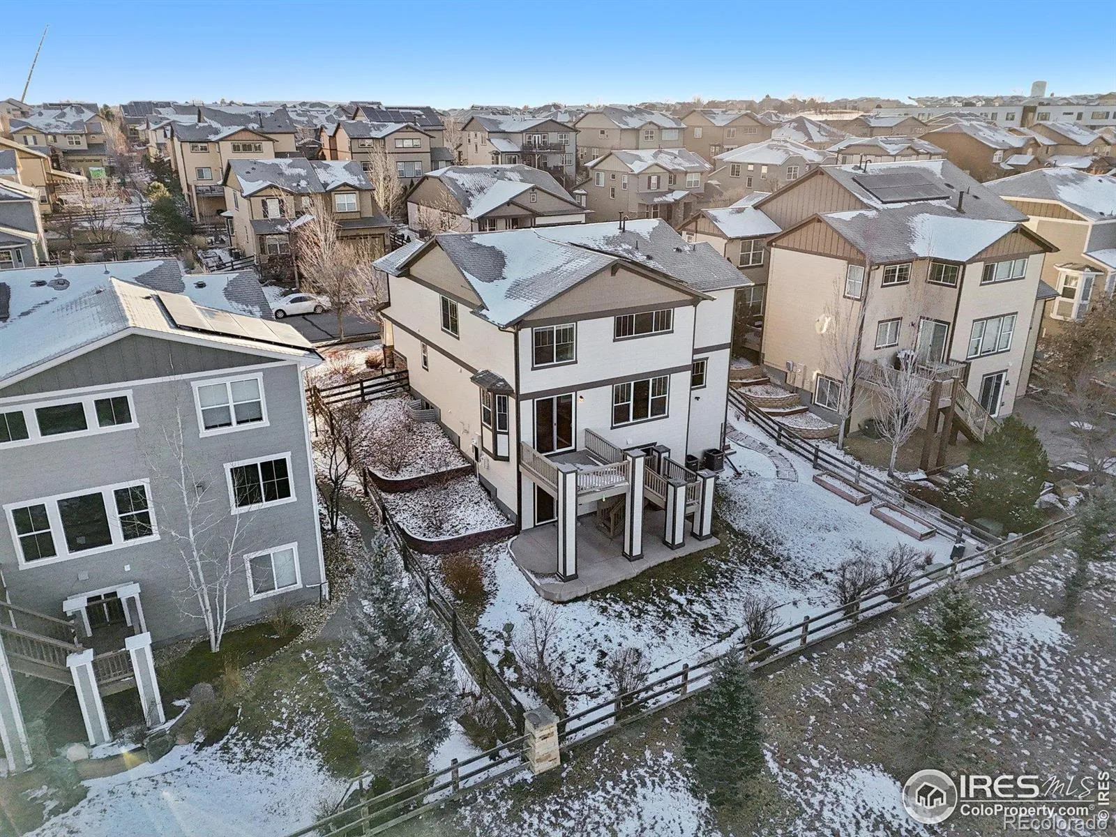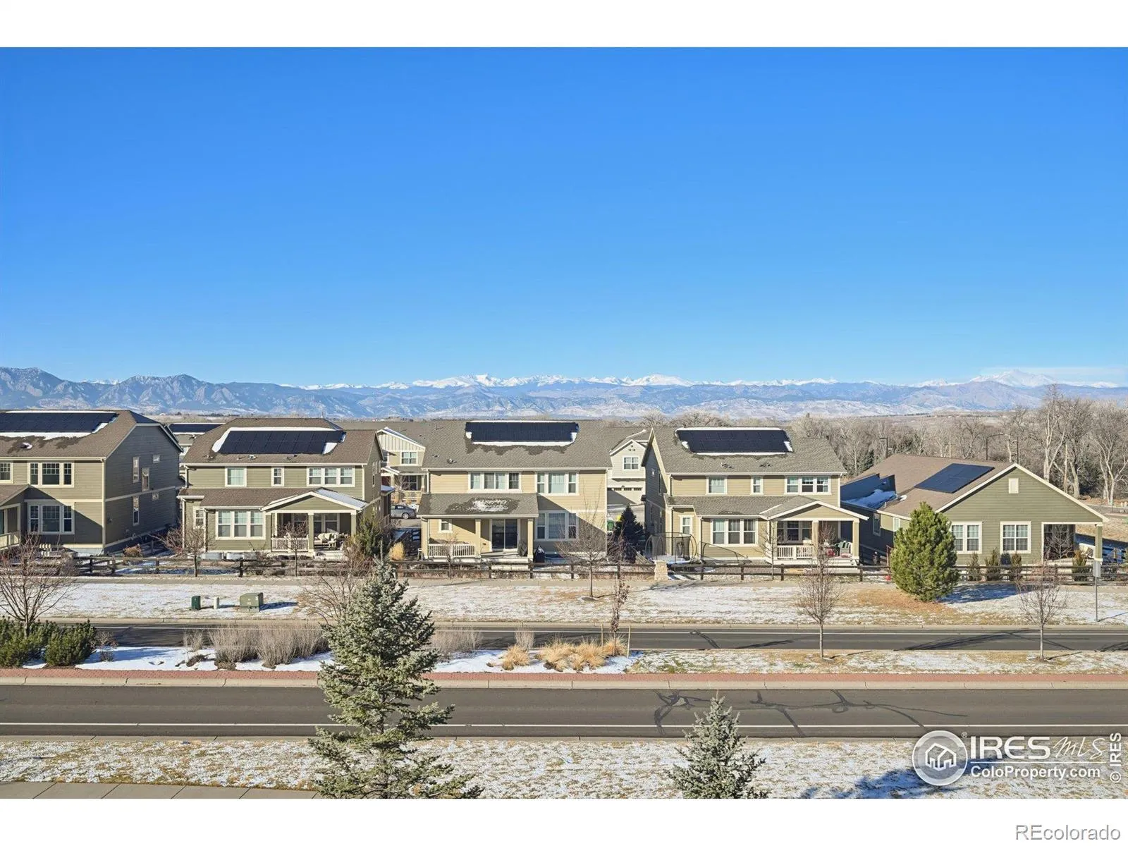 Exceptional 2 story in the desirable Flatiron Meadows community. Ideally set on a greenbelt lot, this gorgeous home blends timeless design, thoughtful upgrades and sweeping mountain views. Offering 4 beds, 4 baths, a finished walk-out basement and a 3 car garage, providing space and flexibility for today’s lifestyle. Striking curb appeal welcomes you with a stone accented facade, covered front porch and manicured landscaping. Inside, rich hickory hardwood flooring and a neutral palette create a warm, inviting feel. The bright 2 story great room features expansive windows showcasing stunning Front Range views and a stacked stone gas fireplace. Gourmet kitchen is a chef’s delight, designed for both daily living and entertaining, with slab granite countertops, large island with breakfast bar seating, 42″ cabinetry, mosaic tile backsplash, stainless steel appliances with a gas cooktop and double ovens and a generous pantry. The dining area with bay windows flows seamlessly to the deck, perfect for enjoying sunsets and snow capped mountain scenery. French glass doors off the foyer open to a private office. Upstairs, a versatile loft offers additional living space, along with 3 good sized bedrooms and a convenient laundry room with utility sink. The spacious primary suite features a raised tray ceiling, a 5-piece bath with soaking tub, walk-in shower, dual vanities and a custom walk-in closet. Finished walk-out basement expands your living options with a large family/rec room and access to a covered patio and landscaped backyard. With no neighbors directly behind, enjoy open space, privacy, and mountain views. Walk-out also includes a large bedroom, full bath and ample storage. Upgrades galore, owned solar panels, high-efficiency dual HVAC systems, and a drywalled 3 car tandem garage. Short walk to the elem. school, trails leading to parks and lakes. Only minutes to shopping, dining and retail. The ideal combination of location, lifestyle and views. See Virtual 3-D tour.