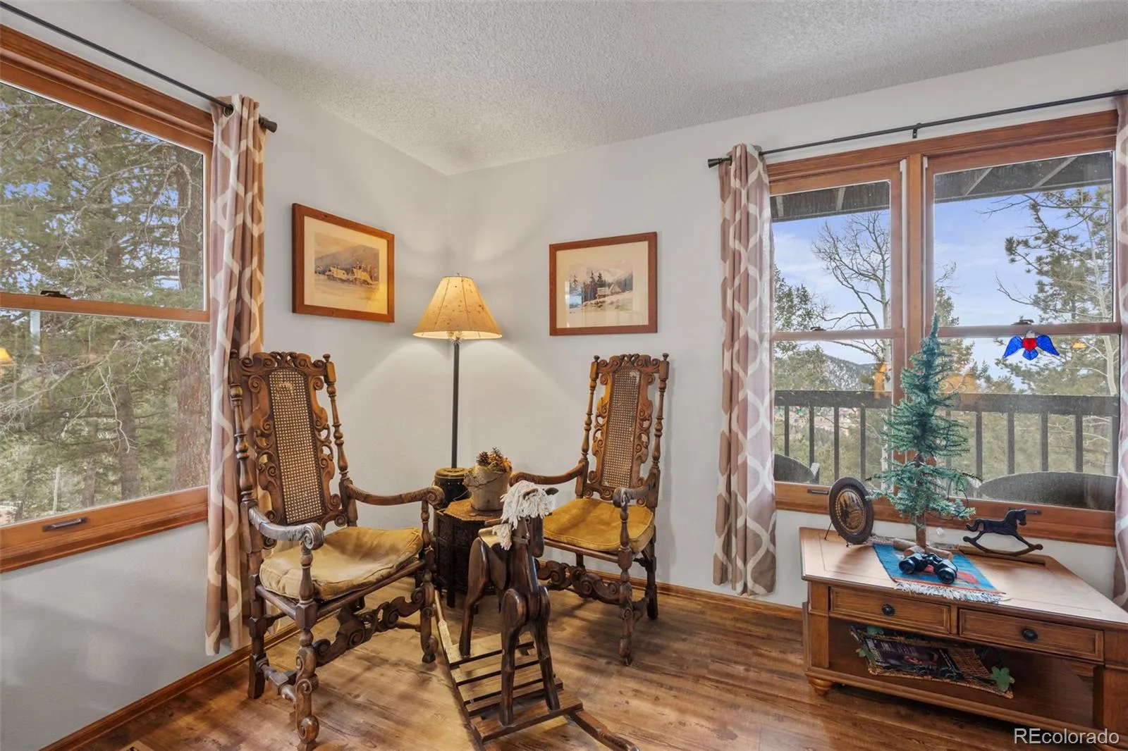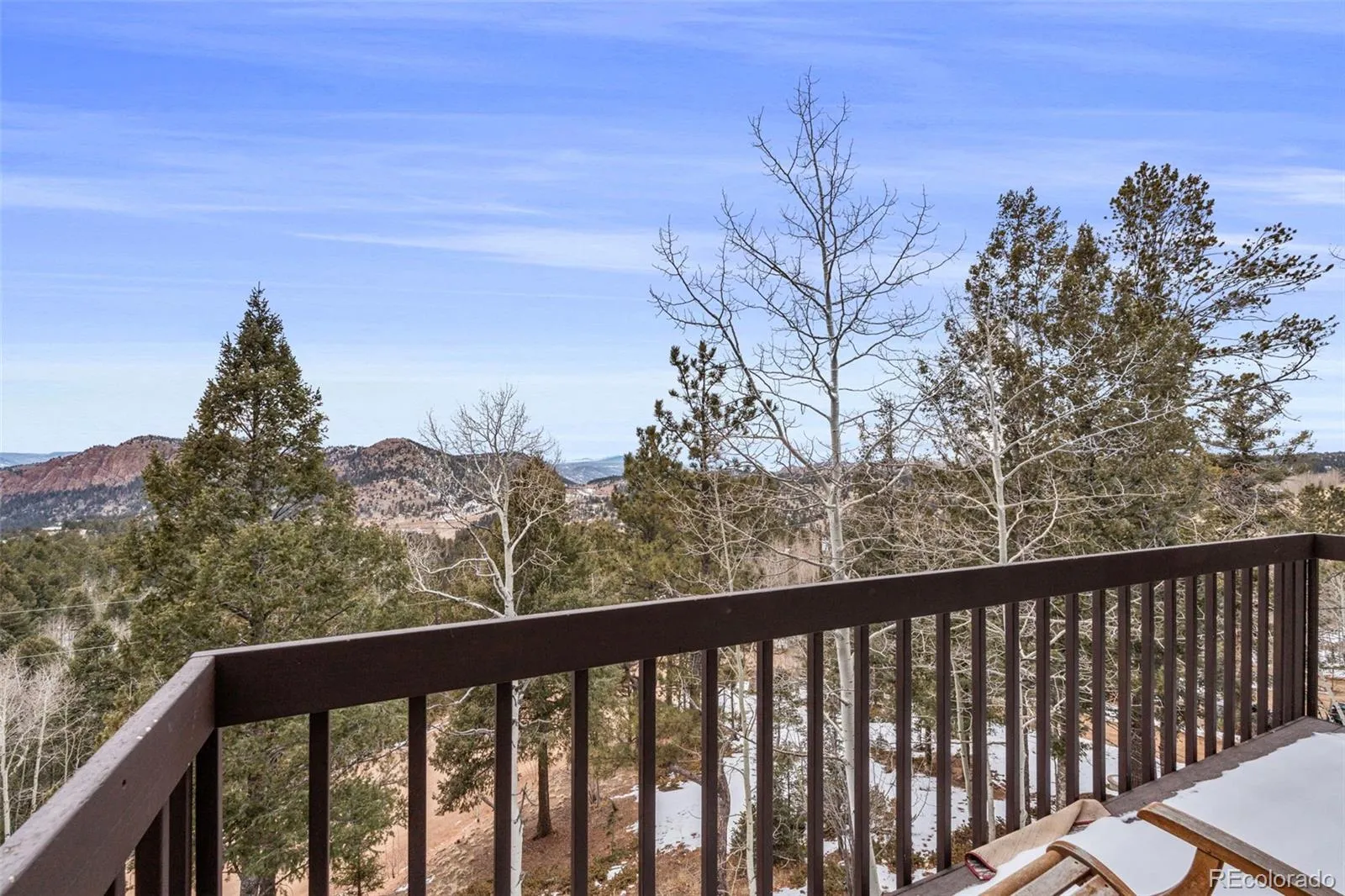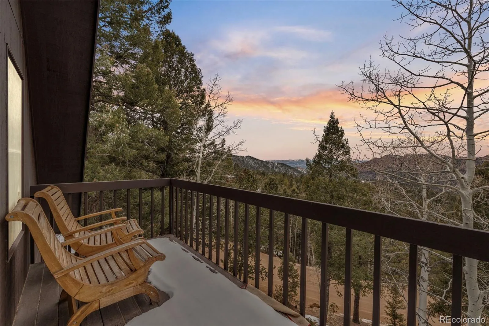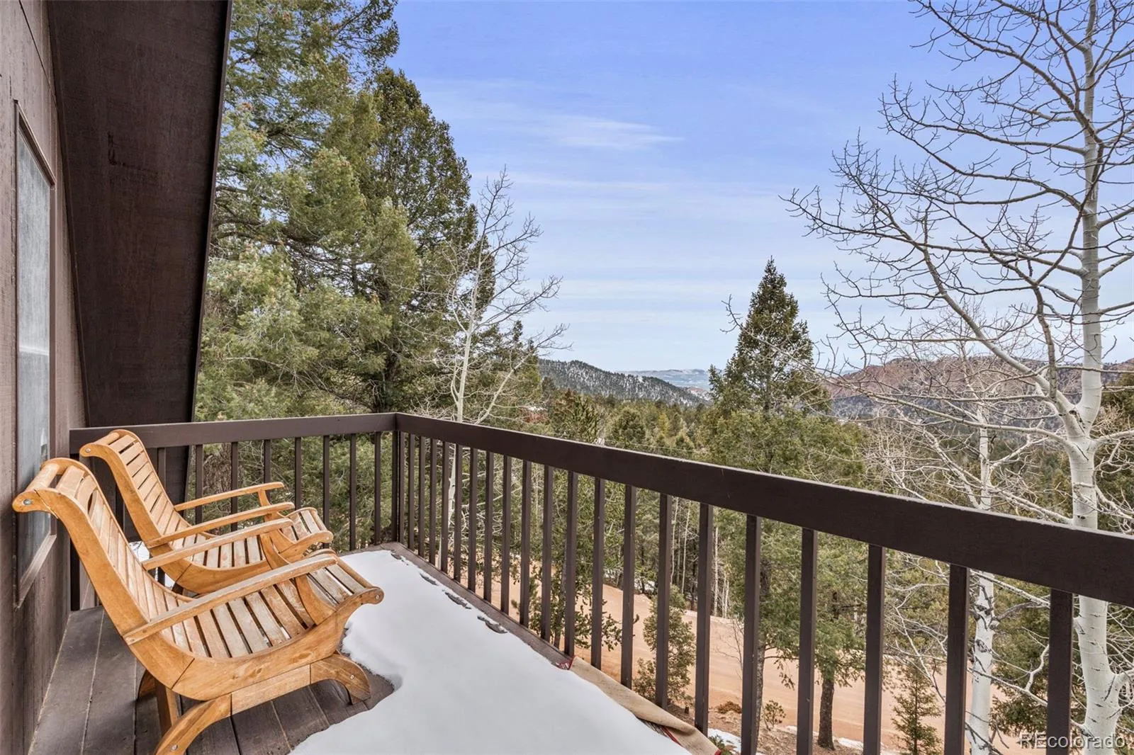 This classic mountain chalet has been lovingly maintained and updated. At 1.25 acres, the lot feels spacious and private tucked back in the conifers and aspen PLUS it borders 42 acres of community open space! The views from the deck and the balcony are spectacular. Inside you will find a spiffy and clean, open and efficient layout with lots of windows. Easy, main-level living is possible with its own bedroom, bathroom and laundry on this level. Upstairs is the spacious master with west-facing 6’X16′ balcony and double closets, another guest room and a full bath. Just a few steps out the kitchen door is the 400 sq ft detached garage with power. The HOA clubhouse features a heated indoor pool, 24-hour fitness center, game loft, playground, tennis/pickleball court, basketball court, 18-hole disc golf course, and picnic tables with grills. You’ll only be a few minutes from historic Cripple Creek with dining, gaming, gift shops, museums, theater and gas/groceries. The mountains are calling; here’s your chance to live in one of the most scenic communities in Teller county and be surrounded by all the best recreation the central Colorado mountains have to offer.