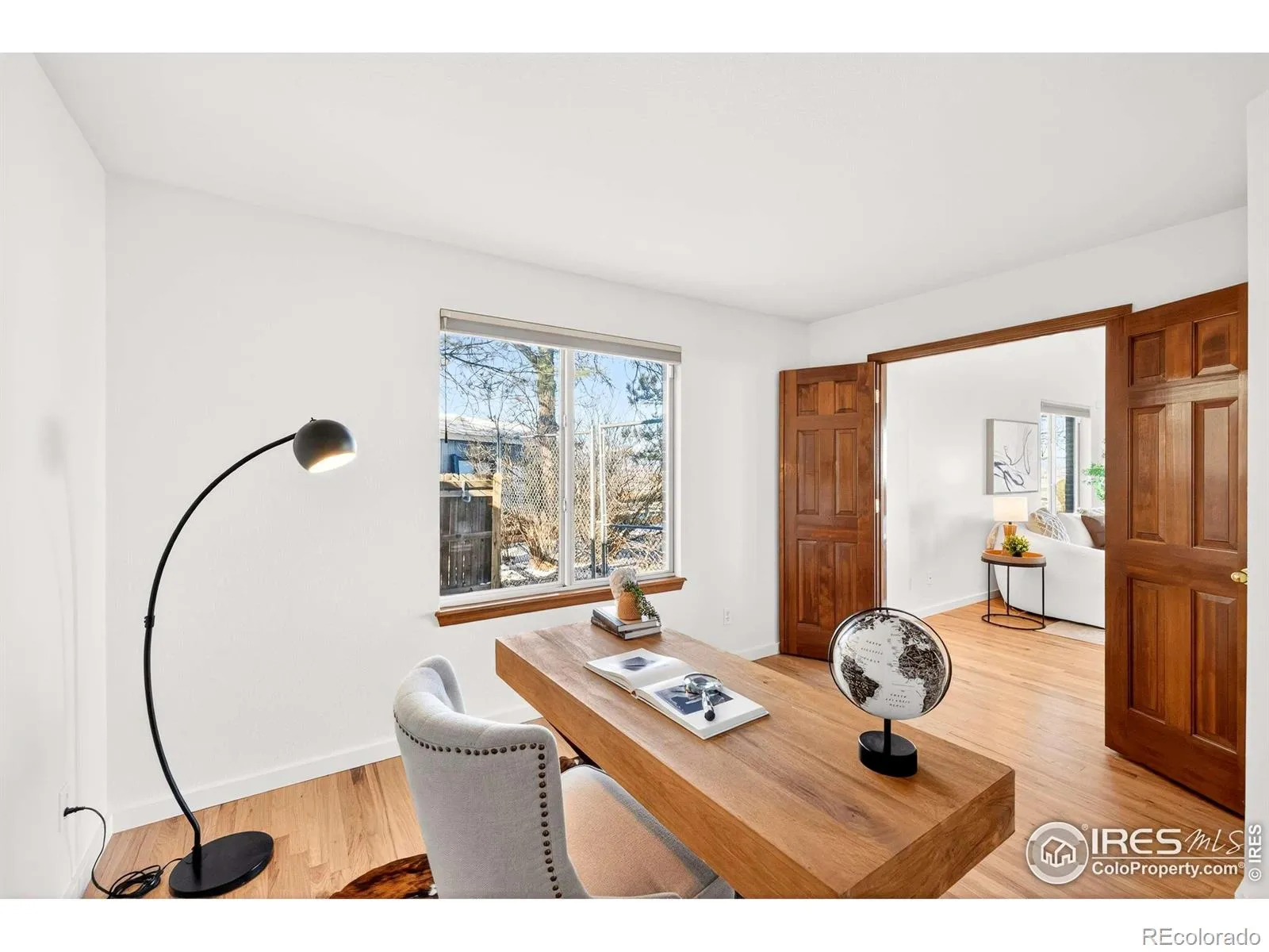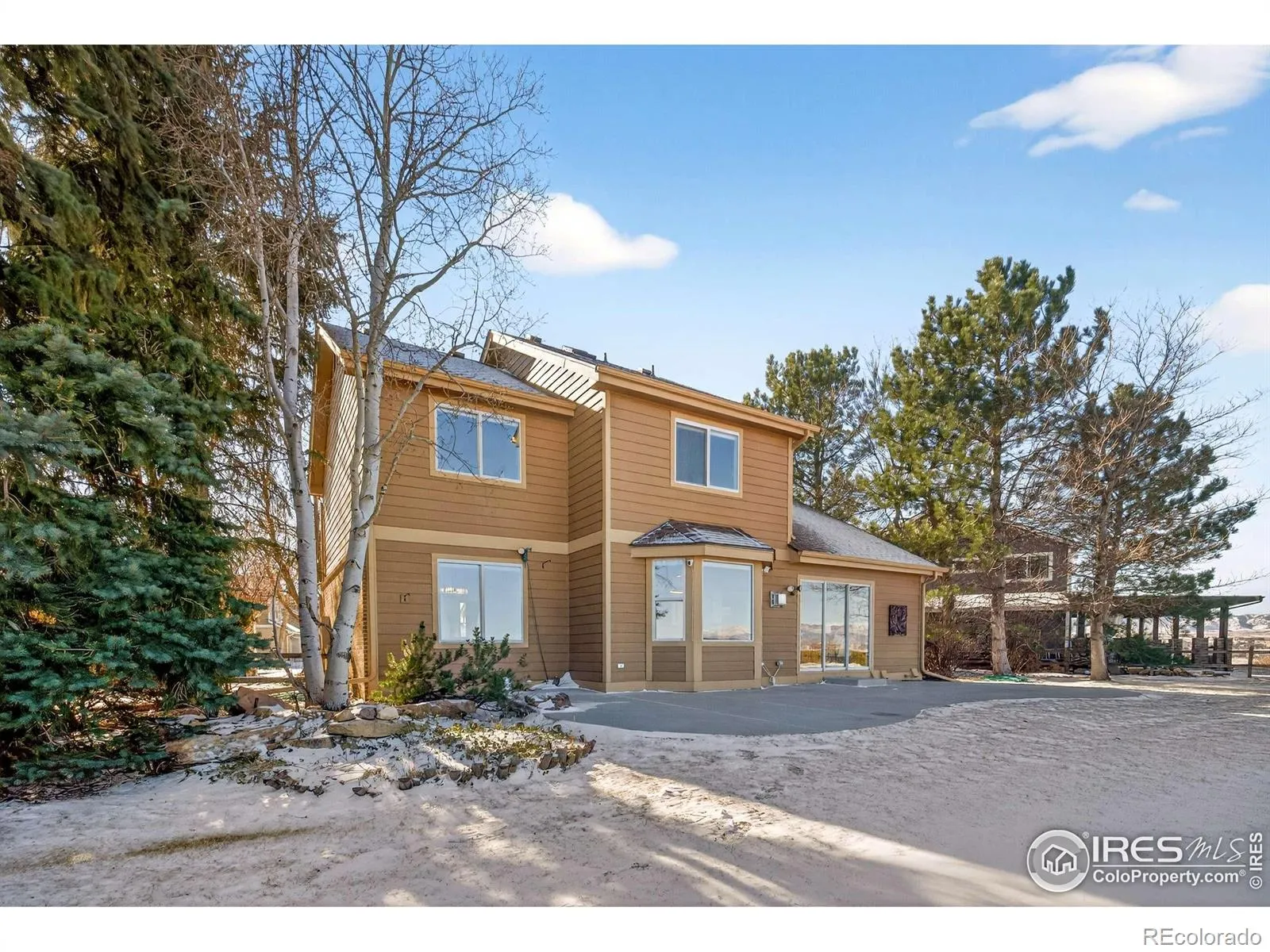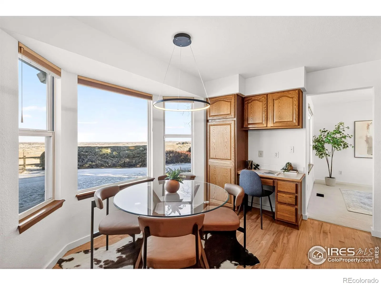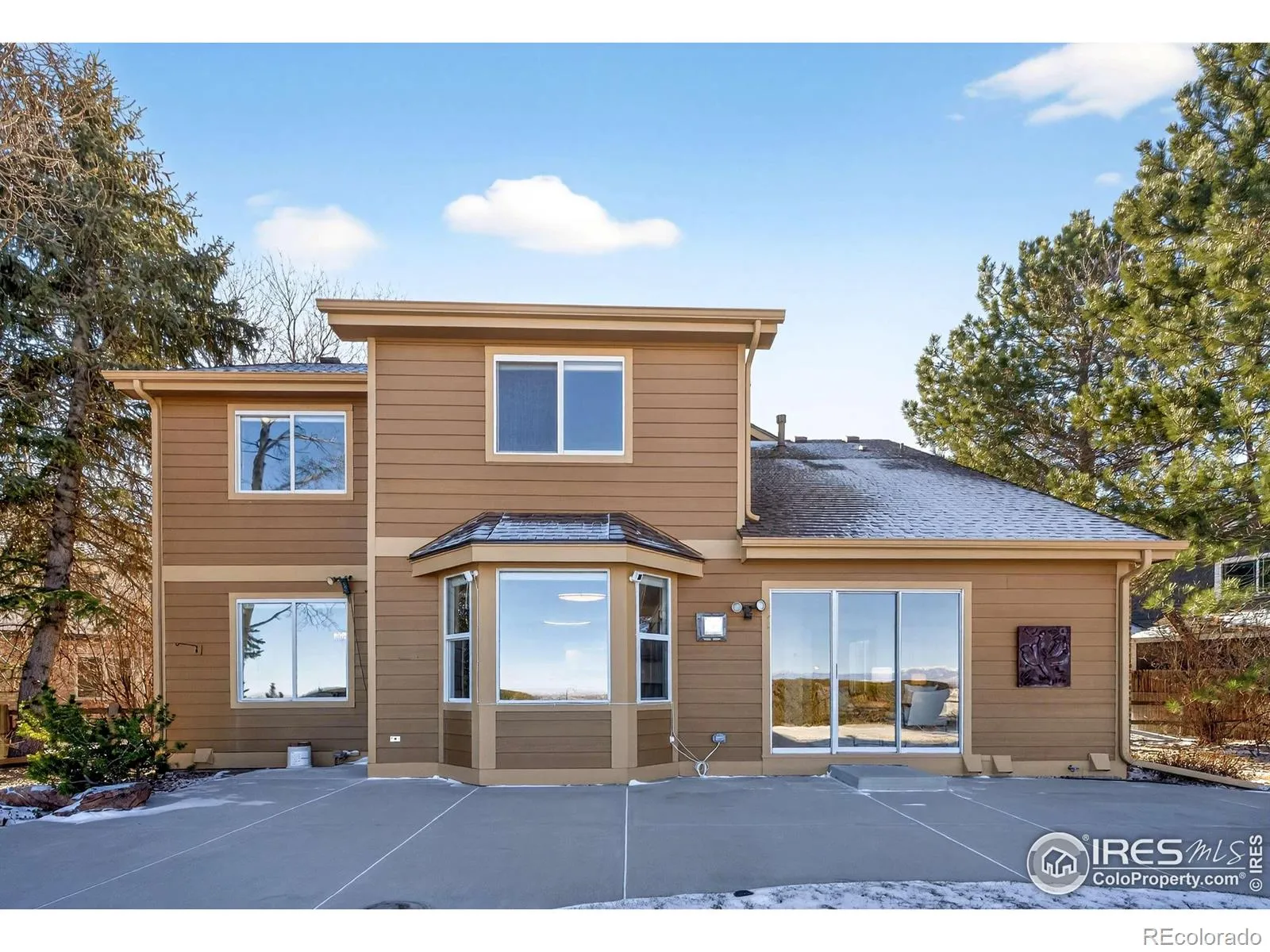 The View House. Unbeatable, unobstructed views stretch across protected open space to the foothills and white-capped Back Range mountains beyond. Tucked quietly at the end of a cul-de-sac, this home offers exceptional privacy, a spacious backyard with mature landscaping, and no HOA. Eye-catching wood floors span the main level, anchoring an open-concept family room and kitchen designed for everyday living and effortless entertaining. The kitchen features a prep island, a breakfast nook, an electric oven/stove, a built-in desk area, and expansive rear windows that frame the views. French doors open to a private home office, while formal living and dining rooms provide flexible gathering spaces. Upstairs, three secondary bedrooms are bright and generously sized with abundant closet storage, plus a conveniently located washer and dryer. The primary suite is filled with natural light from oversized windows and a vaulted ceiling, and includes a five-piece bath with soaking tub and a large walk-in closet. Meticulously maintained, with new lighting throughout, this thoughtfully updated and beautifully positioned home completes the picture.