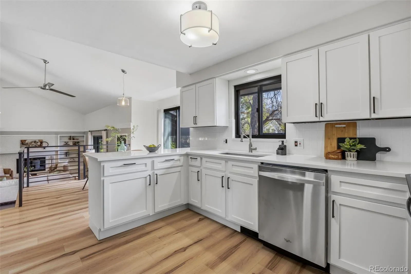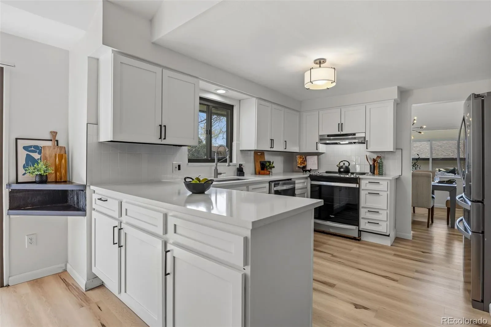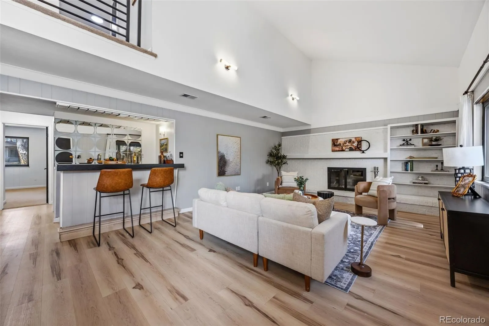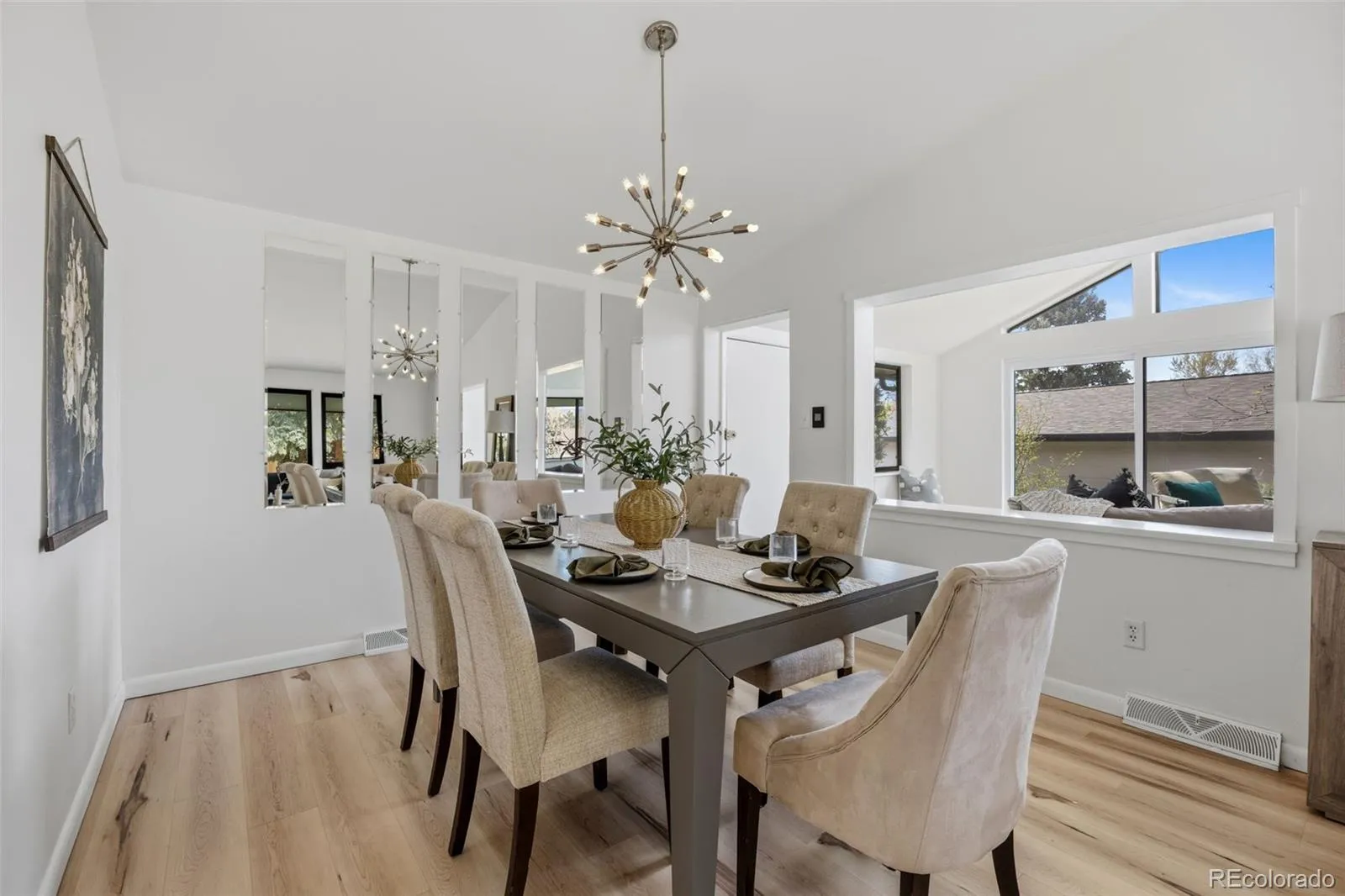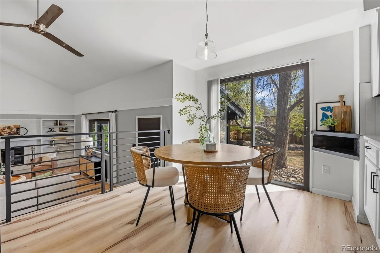 Modern luxury meets timeless design in this contemporary split-level residence with mid-century modern influences, ideally located in Columbine Knolls. Angled and vaulted ceilings, clean architectural lines, and beautiful wood flooring create a strong first impression. The open-concept main living areas include a formal living room anchored by a large picture window that fills the space with natural light, flowing seamlessly into the formal dining room and an enclosed sunroom with tile flooring and walls of windows—an inviting space with excellent versatility for an office, library, playroom and more. The newly updated kitchen features new cabinetry, quartz countertops, stainless steel appliances, and a breakfast nook with sliding doors that open up to the backyard. Overlooking the family room, this level is designed for both everyday living and entertaining, offering a statement brick wood-burning fireplace, retro wet bar, and direct access to the expansive back patio and landscaped yard. A bedroom and ¾ bath and laundry on this level provide an ideal guest suite or home office. Upstairs, the primary suite is a true retreat with a newly renovated four-piece en suite bath, three giant closets, and private deck access with mountain views. Two additional generously-sized bedrooms and an updated full bath complete the upper level. The basement offers flexible bonus space and excellent storage. A standout feature of this home is the oversized yard—perfect for children and pets. Mature trees and a covered patio create a private, tranquil setting, complemented by a convenient dog run and side yard. The home is completed by an attached two-car garage with a new modern door featuring slimline windows, enhancing the home’s architectural style and curb appeal. A rare blend of style, function, and location, this residence is thoughtfully designed for modern living.