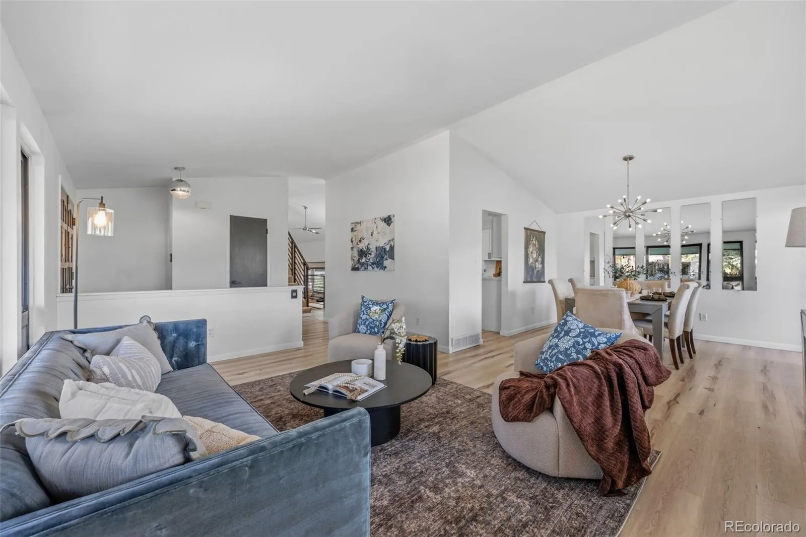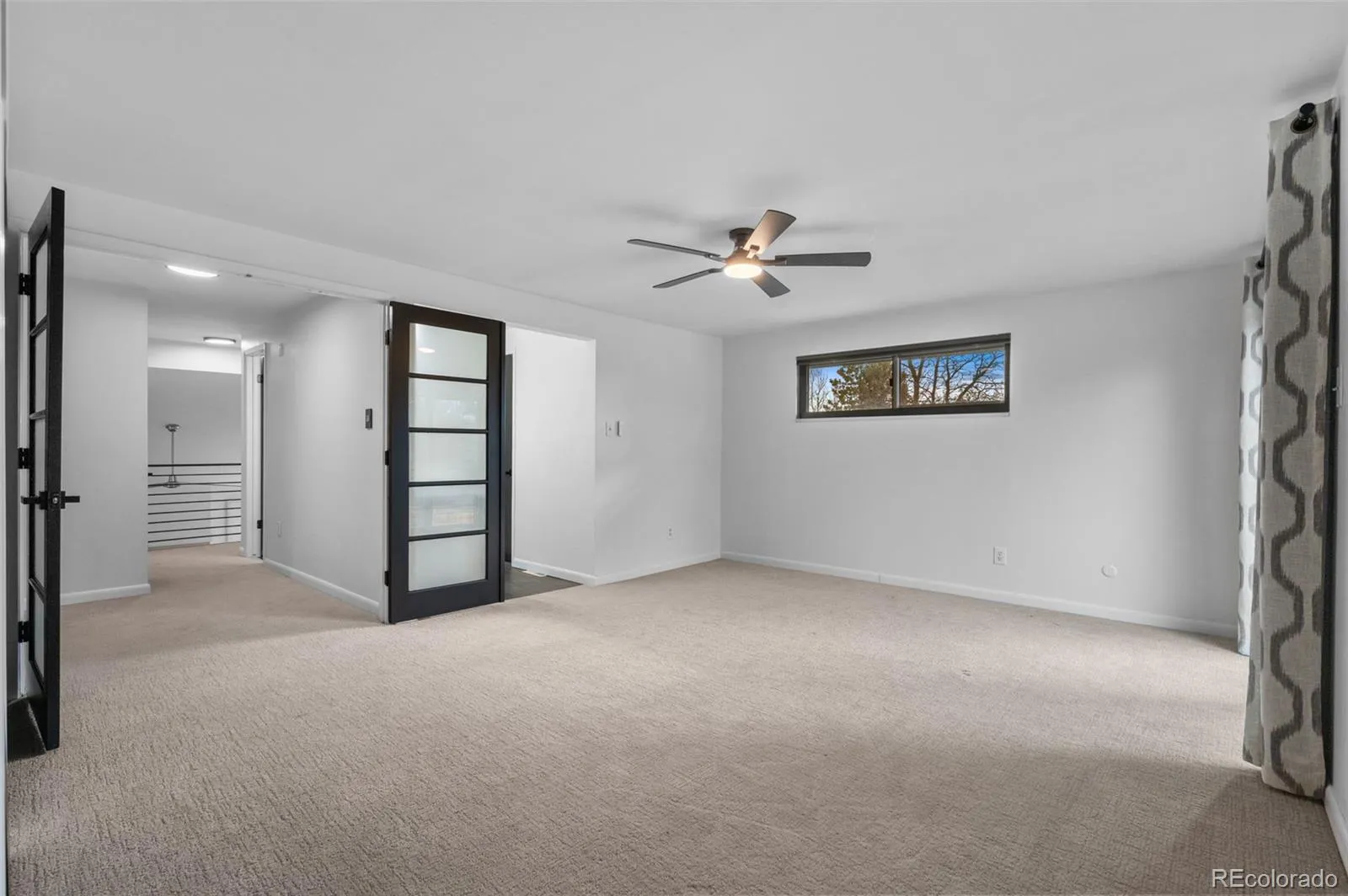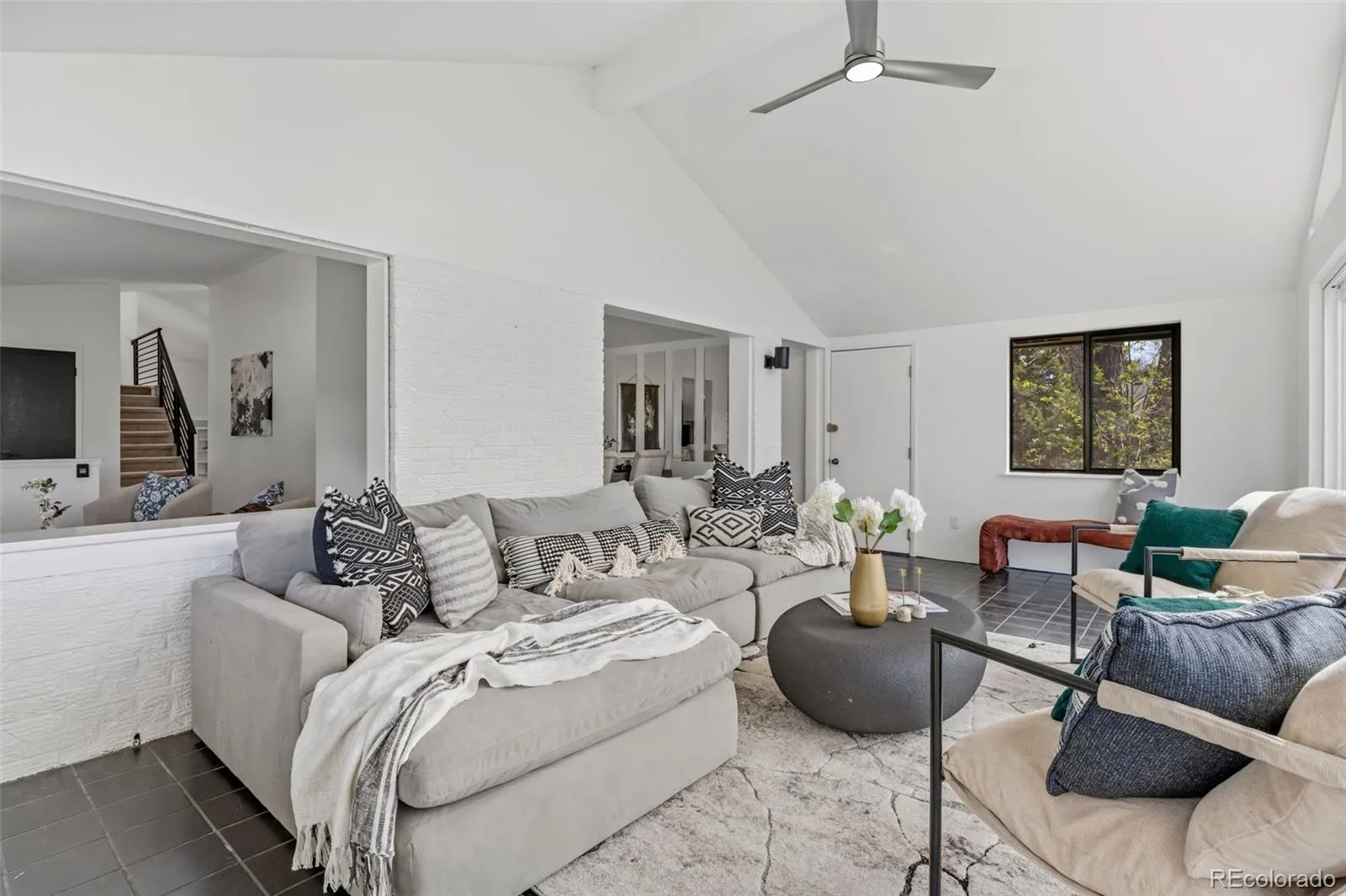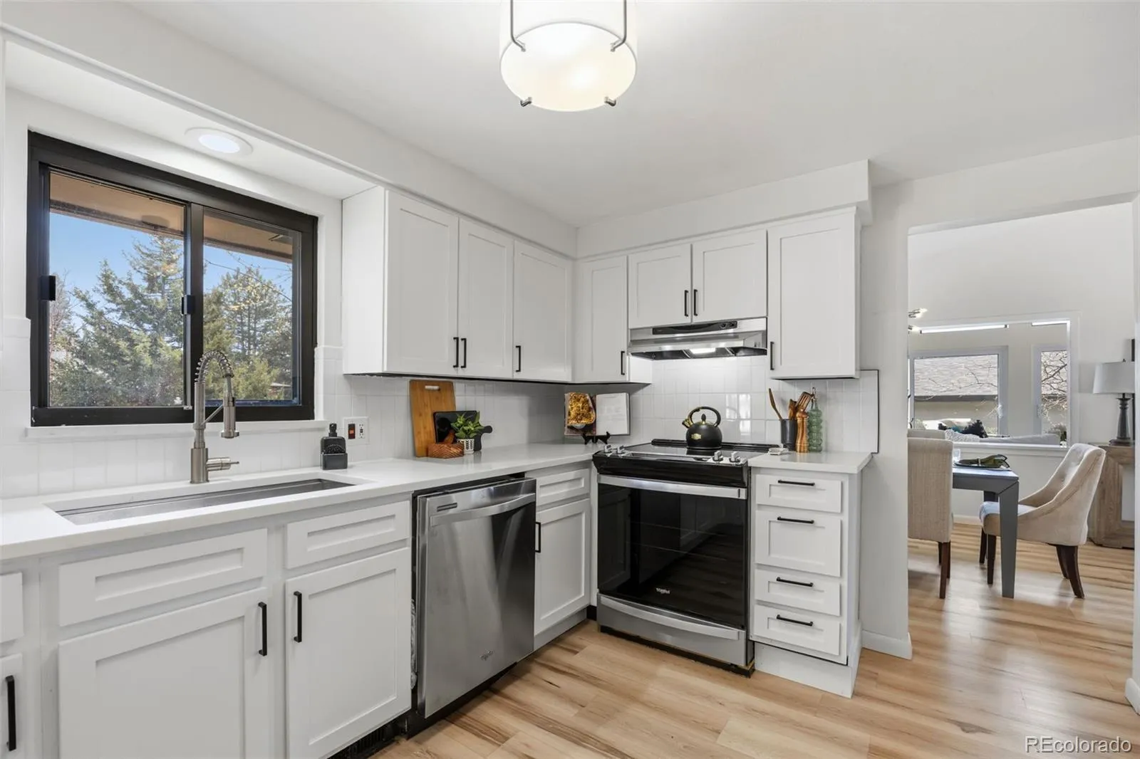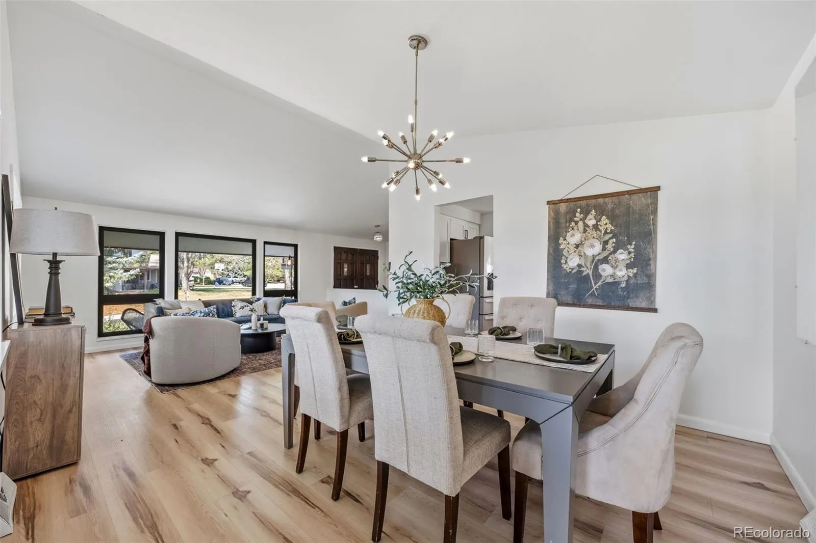 Modern luxury meets timeless design in this contemporary split-level residence with mid-century modern influences, ideally located in Columbine Knolls. Angled and vaulted ceilings, clean architectural lines, and beautiful wood flooring create a strong first impression. The open-concept main living areas include a formal living room anchored by a large picture window that fills the space with natural light, flowing seamlessly into the formal dining room and an enclosed sunroom with tile flooring and walls of windows—an inviting space with excellent versatility for an office, library, playroom and more. The newly updated kitchen features new cabinetry, quartz countertops, stainless steel appliances, and a breakfast nook with sliding doors that open up to the backyard. Overlooking the family room, this level is designed for both everyday living and entertaining, offering a statement brick wood-burning fireplace, retro wet bar, and direct access to the expansive back patio and landscaped yard. A bedroom and ¾ bath and laundry on this level provide an ideal guest suite or home office. Upstairs, the primary suite is a true retreat with a newly renovated four-piece en suite bath, three giant closets, and private deck access with mountain views. Two additional generously-sized bedrooms and an updated full bath complete the upper level. The basement offers flexible bonus space and excellent storage. A standout feature of this home is the oversized yard—perfect for children and pets. Mature trees and a covered patio create a private, tranquil setting, complemented by a convenient dog run and side yard. The home is completed by an attached two-car garage with a new modern door featuring slimline windows, enhancing the home’s architectural style and curb appeal. A rare blend of style, function, and location, this residence is thoughtfully designed for modern living.