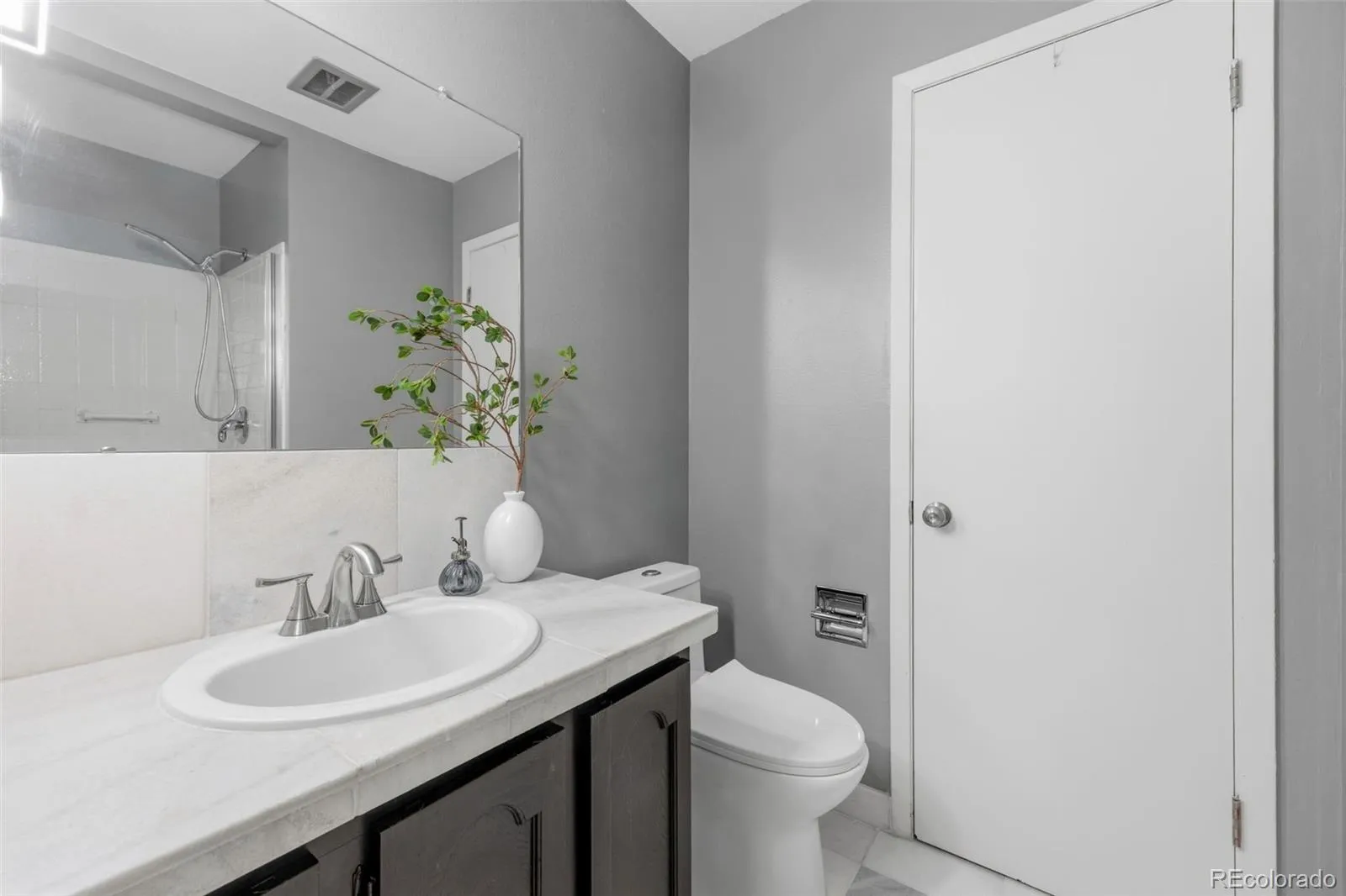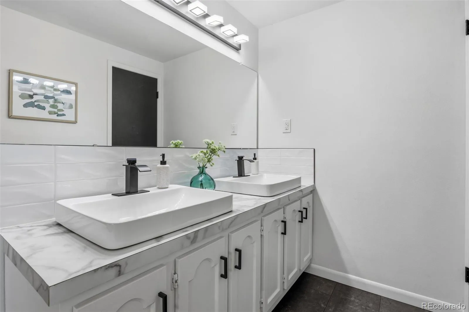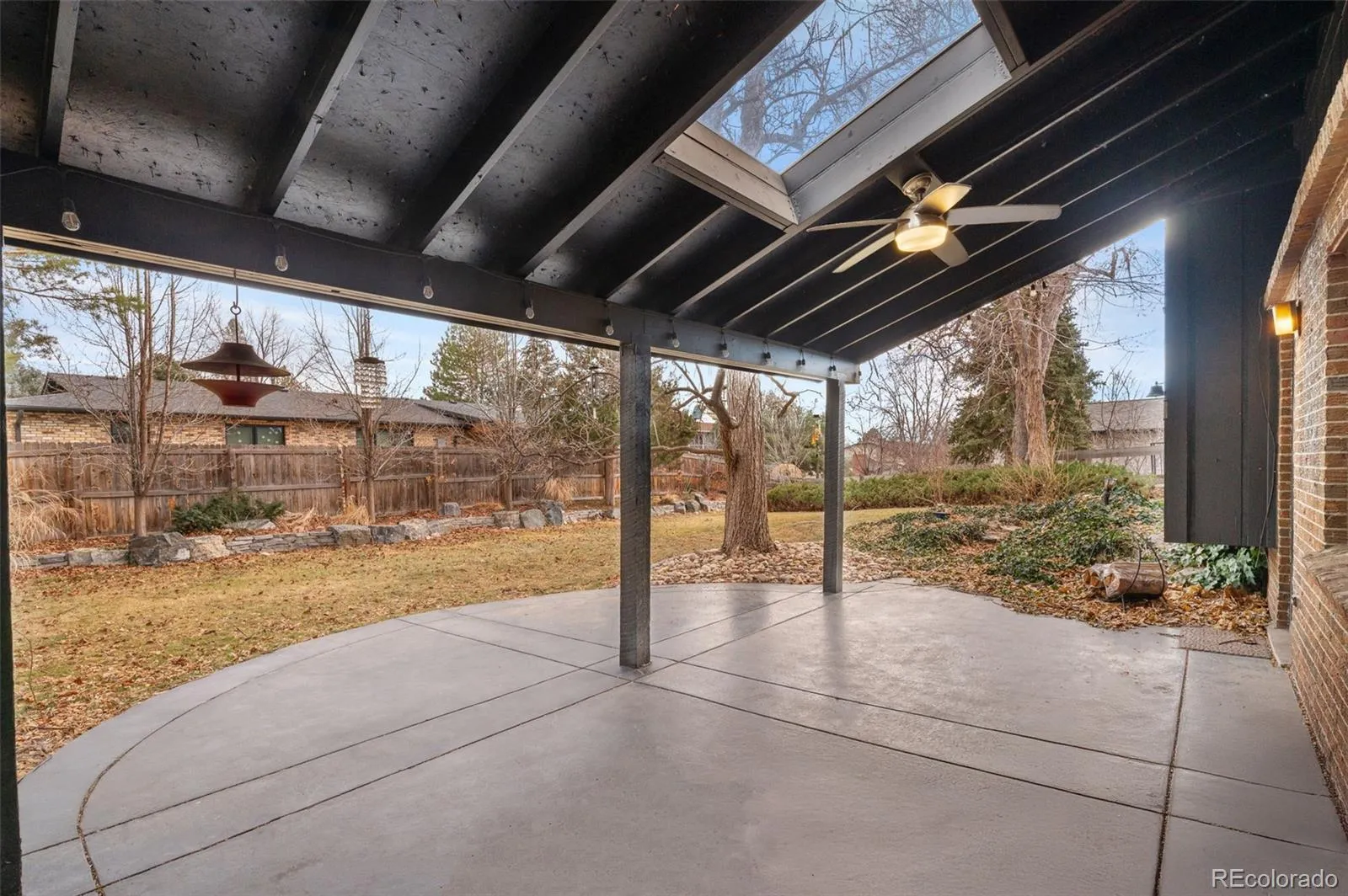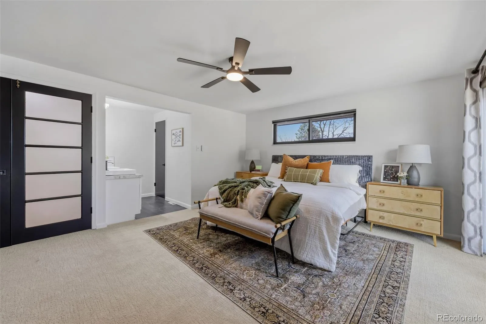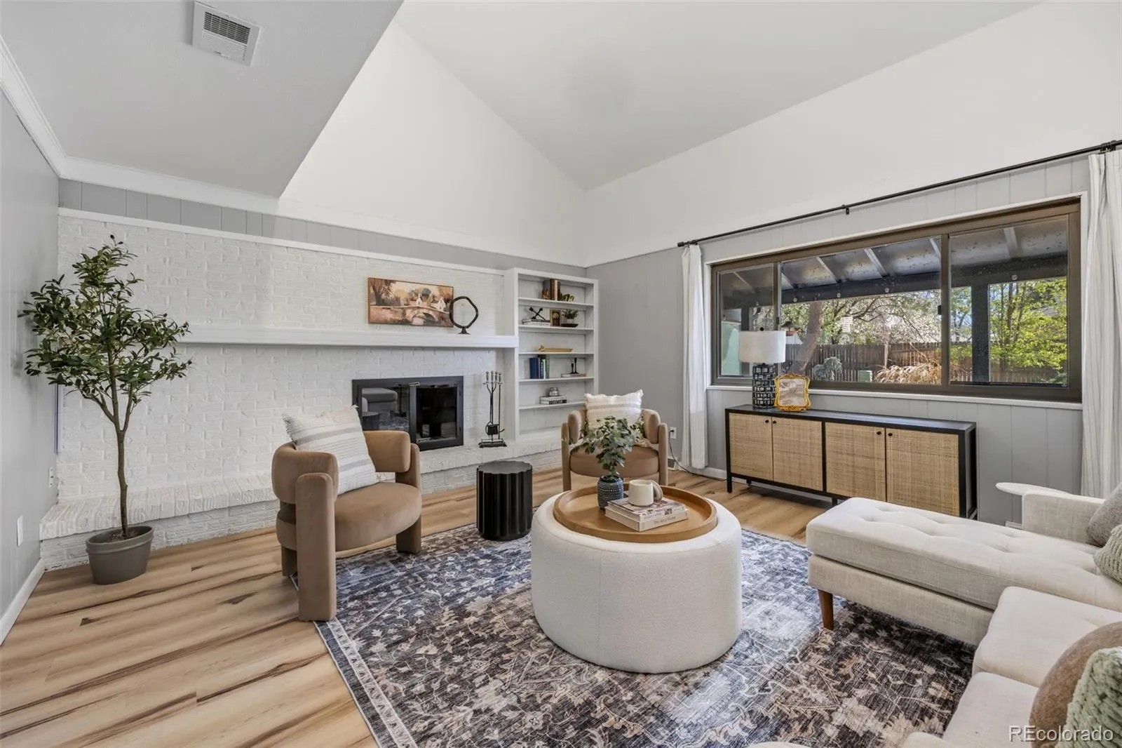 Modern luxury meets timeless design in this contemporary split-level residence with mid-century modern influences, ideally located in Columbine Knolls. Angled and vaulted ceilings, clean architectural lines, and beautiful wood flooring create a strong first impression. The open-concept main living areas include a formal living room anchored by a large picture window that fills the space with natural light, flowing seamlessly into the formal dining room and an enclosed sunroom with tile flooring and walls of windows—an inviting space with excellent versatility for an office, library, playroom and more. The newly updated kitchen features new cabinetry, quartz countertops, stainless steel appliances, and a breakfast nook with sliding doors that open up to the backyard. Overlooking the family room, this level is designed for both everyday living and entertaining, offering a statement brick wood-burning fireplace, retro wet bar, and direct access to the expansive back patio and landscaped yard. A bedroom and ¾ bath and laundry on this level provide an ideal guest suite or home office. Upstairs, the primary suite is a true retreat with a newly renovated four-piece en suite bath, three giant closets, and private deck access with mountain views. Two additional generously-sized bedrooms and an updated full bath complete the upper level. The basement offers flexible bonus space and excellent storage. A standout feature of this home is the oversized yard—perfect for children and pets. Mature trees and a covered patio create a private, tranquil setting, complemented by a convenient dog run and side yard. The home is completed by an attached two-car garage with a new modern door featuring slimline windows, enhancing the home’s architectural style and curb appeal. A rare blend of style, function, and location, this residence is thoughtfully designed for modern living.