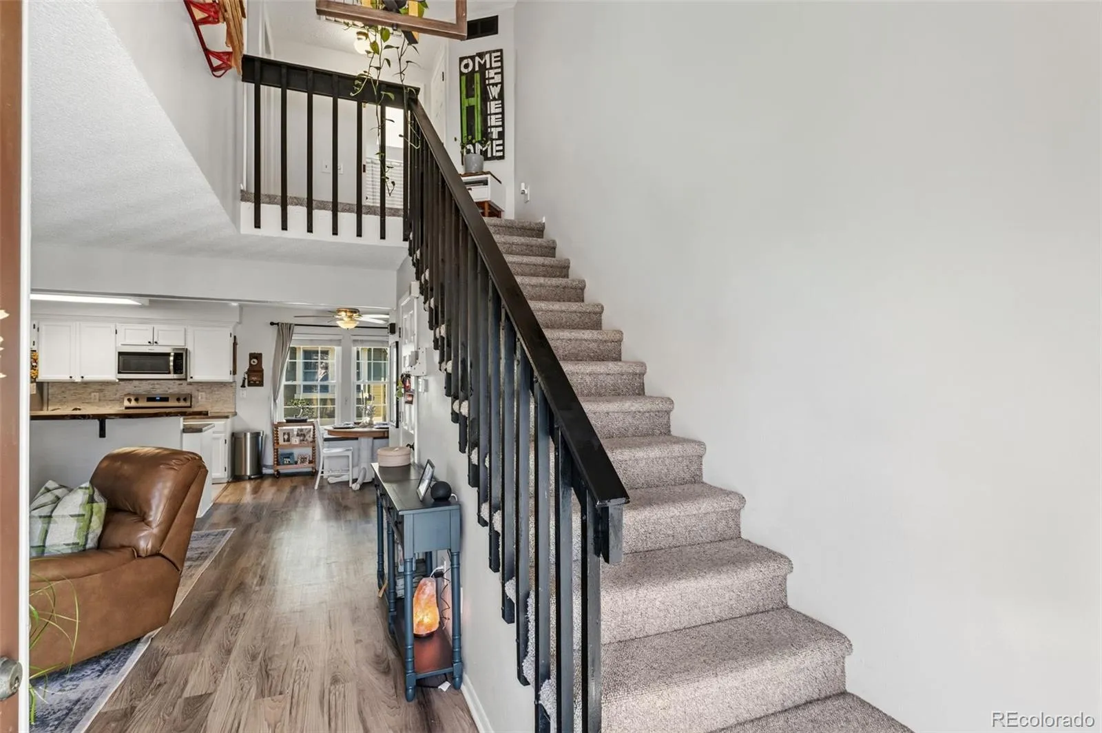 Do not miss this charming 2 bedroom town home with a 2 car attached garage! This beautifully updated home offers over 1500 square feet of living space. The open and inviting main living area boasts a rustic wood burning brick fireplace, durable LVP flooring and a beautifully updated kitchen with reclaimed wood accents, a built in breakfast nook with storage and newer stainless steel appliances. The upper level features a spacious primary with en-suite bathroom and a well-sized secondary bedroom. The basement provides access to the attached 2 car garage and a dedicated laundry room which not only adds convenience but also doubles as a perfect mudroom. The storage closet on main level can be simply converted to accommodate stackable laundry as well. A gated front porch provides a serene space to relax outdoors. Conveniently located in the desirable Chambers Ridge community, this home is only a few steps from the community pool and clubhouse, and is near restaurants, public transit, grocery stores, schools and shopping. This home combines charm and comfort while also offering unbeatable convenience.
