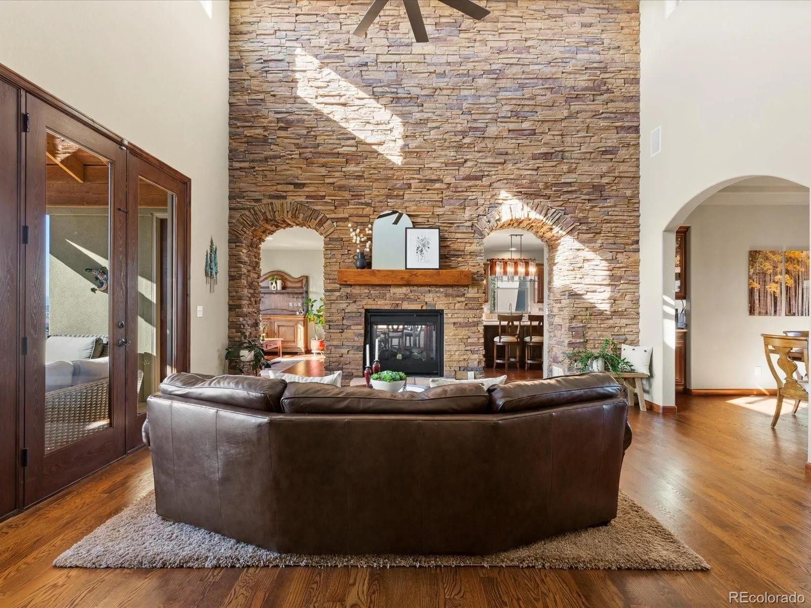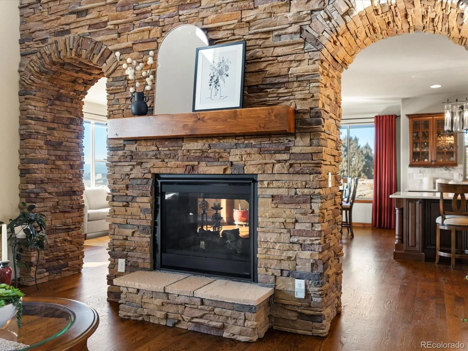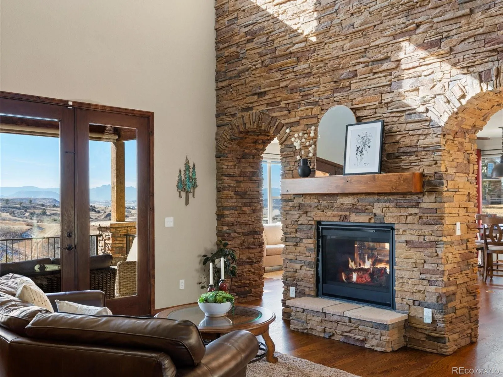 Exceptional custom ranch style home on a picturesque 1.3-acre lot with sweeping mountain views! A stone-accented façade adorned by tremendous stone accents around the home, grassy front yard, & 3-car garage create striking curb appeal. Inside, you’ll find slate stone & wood flooring, vaulted ceilings, arched doorways, & abundant natural light. The formal dining room features access to the front patio, while the living room impresses with soaring ceilings, clerestory windows, a fireplace, a dramatic stone-accented wall, & French doors to the deck. A cozy family room provides an additional space to relax! Immaculate remodeled eat-in kitchen has a breakfast bar island, wood cabinets, SS appliances, tile backsplash, pot filler, stylish quartz counters, & a pantry. Tranquil main-floor retreat includes direct deck access & private bathroom showcasing a glass-enclosed walk-in shower, dual vanities, a soaking tub, & a walk-in closet. The main level includes 1 additional bedroom and a professional office with built-ins. Secondary bedrooms downstairs are thoughtfully designed with a shared Jack-&-Jill bathroom, soft carpet, & abundant natural light. The partially finished basement offers walk-out access, a wet/wine bar, a 3rd fireplace, an unfinished workshop/storage, an unfinished utility room, & an included hot tub. The laundry room upstairs is well-equipped with a sink & cabinets. Enjoy a charming covered deck with incredible views plus a built-in and plumbed fire pit & a grassy backyard with a firepit area, lovely pavers, an adorable fountain, & a covered patio. Don’t miss as you tour the included A/V system wired throughout, home security system, and the radiant heat in the master bath and basement. Make this remarkable property yours!