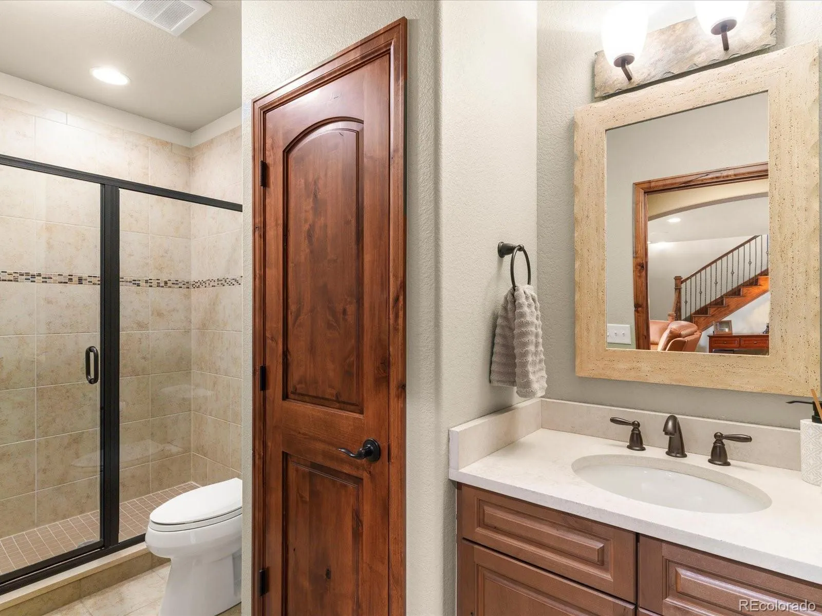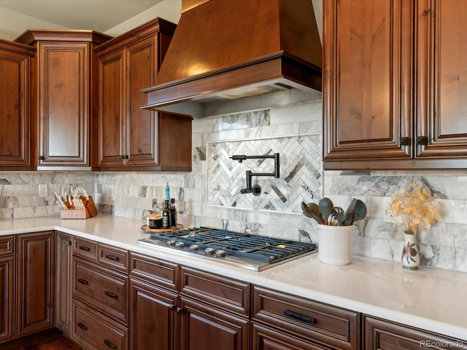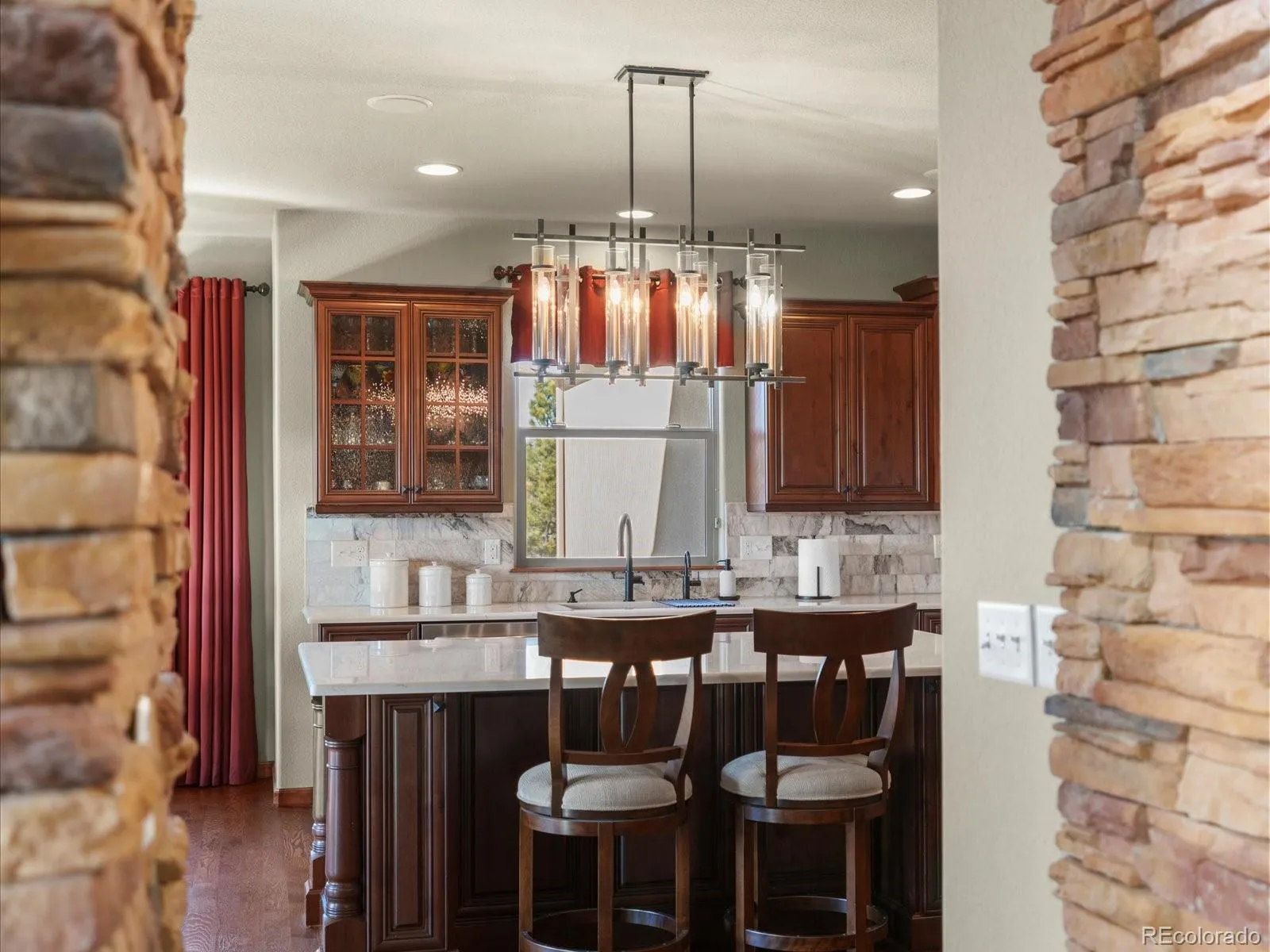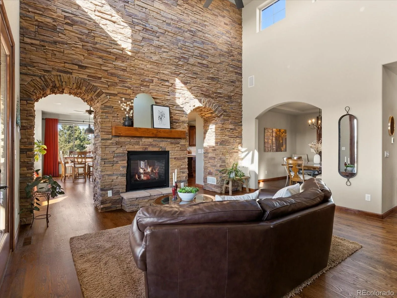 Exceptional custom ranch style home on a picturesque 1.3-acre lot with sweeping mountain views! A stone-accented façade adorned by tremendous stone accents around the home, grassy front yard, & 3-car garage create striking curb appeal. Inside, you’ll find slate stone & wood flooring, vaulted ceilings, arched doorways, & abundant natural light. The formal dining room features access to the front patio, while the living room impresses with soaring ceilings, clerestory windows, a fireplace, a dramatic stone-accented wall, & French doors to the deck. A cozy family room provides an additional space to relax! Immaculate remodeled eat-in kitchen has a breakfast bar island, wood cabinets, SS appliances, tile backsplash, pot filler, stylish quartz counters, & a pantry. Tranquil main-floor retreat includes direct deck access & private bathroom showcasing a glass-enclosed walk-in shower, dual vanities, a soaking tub, & a walk-in closet. The main level includes 1 additional bedroom and a professional office with built-ins. Secondary bedrooms downstairs are thoughtfully designed with a shared Jack-&-Jill bathroom, soft carpet, & abundant natural light. The partially finished basement offers walk-out access, a wet/wine bar, a 3rd fireplace, an unfinished workshop/storage, an unfinished utility room, & an included hot tub. The laundry room upstairs is well-equipped with a sink & cabinets. Enjoy a charming covered deck with incredible views plus a built-in and plumbed fire pit & a grassy backyard with a firepit area, lovely pavers, an adorable fountain, & a covered patio. Don’t miss as you tour the included A/V system wired throughout, home security system, and the radiant heat in the master bath and basement. Make this remarkable property yours!