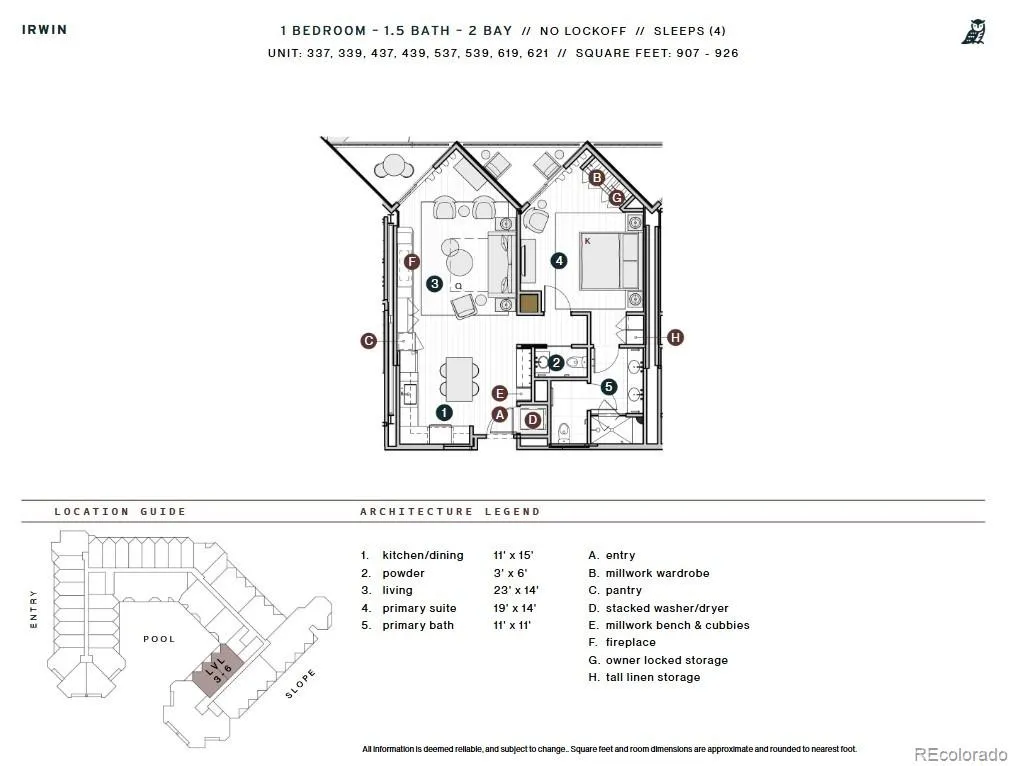To-be-built Beckwith Residence 437 of the Irwin floor plan spans 907 square feet and features one bedroom, one bathroom, a powder room, and two private balconies. This residence is located just steps from the elevator for easy access. Positioned to capture afternoon light, this residence features beautiful balconies overlooking the resort’s hot tub and courtyard, with southwest facing windows offering dynamic views of the surrounding mountain peaks, including Mt. Emmons and the iconic Red Lady Bowl. Whether you’re watching the sun dip below the ridge or enjoying the vibrant energy below, the broad sky exposure and lively setting make this a breathtaking mountain perch. Inside, earthy neutrals, warm wood tones, and layered natural textures create a sense of ease and sophistication, while unexpected design moments reflect the adventurous, creative soul of Crested Butte. A sleek electric fireplace anchors the living space, complemented by wide-plank wood flooring and expansive windows that fill the home with natural light. The gourmet kitchen features stone countertops, high-end appliances, a generous pantry, and a custom millwork entry bench with cubbies— blending beauty and functionality for everyday mountain life. The primary suite is a peaceful retreat with a private balcony, custom wardrobe, and a spa-inspired en-suite bath with Kohler fixtures. A well-appointed powder room, in-unit laundry with stacked washer and dryer, and a secure owner’s storage locker add everyday ease and thoughtful detail. The Beckwith is the only ski-in, ski-out resort in the heart of Crested Butte’s base area, with world-class amenities including a four-star, community-inspired hotel, seamless ski valet, luxurious spa, adventure concierge, and private mountain & social community, Club Beck. A multi-phased reimaging of Elevation Hotel & Spa will transform almost every space at the resort, with residences anticipated for completion in the Winter 26-27 ski season.
