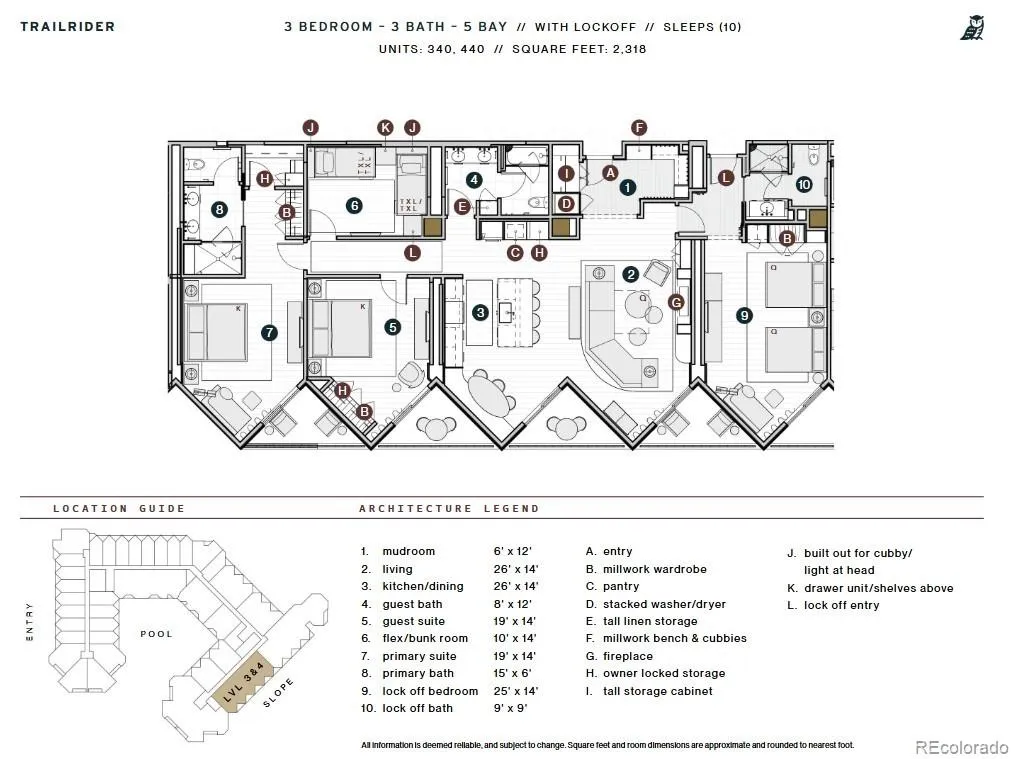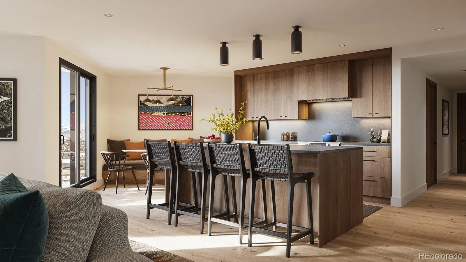 Set on the 4th floor with immediate elevator access, Beckwith Residence 440 offers an elevated take on alpine luxury, combining a spacious and flexible layout with unmatched ski slope views. The Trailrider floor plan spans 2,318 square feet, featuring three bedrooms, three full baths, a bunkroom, mudroom, and a lockoff suite. This slopeside residence delivers five private balconies that immerse you in the energy of the mountain. Enjoy panoramic views of the Red Lady and Silver Queen chairlifts. Inside, discover light-filled and airy interiors bathed in soft earthy neutrals, warm wood tones, and natural textures that echo the alpine meadows of Crested Butte. The open-concept design flows effortlessly from a gourmet kitchen— complete with natural stone countertops, top-tier appliances, and ample storage—into a welcoming living and dining space framed by oversized windows and balcony access. A custom millwork bench and cubbies in the mudroom keep gear and clutter out of sight, so you’re always ready for the next adventure. The primary suite is a peaceful escape, featuring a private balcony, millwork wardrobe, and a spa-inspired en-suite bath with Kohler fixtures and radiant finishes. The flex/bunk room adds additional space for extra guests. The lockoff suite, with its own private entrance and en-suite bath, delivers additional flexibility and privacy. With no compromise on location, layout, or light, Residence 440 is a standout residence for those who crave direct access to the slopes, versatile living, and jaw-dropping views. The Beckwith is the only ski-in, ski-out resort in the heart of Crested Butte’s base area, with world-class amenities including a four-star, community-inspired hotel, seamless ski valet, luxurious spa, adventure concierge, and private mountain & social community, Club Beck. A multi-phased reimaging of Elevation Hotel & Spa will transform almost every space at the resort, with residences anticipated for completion in the Winter 26-27 ski season.