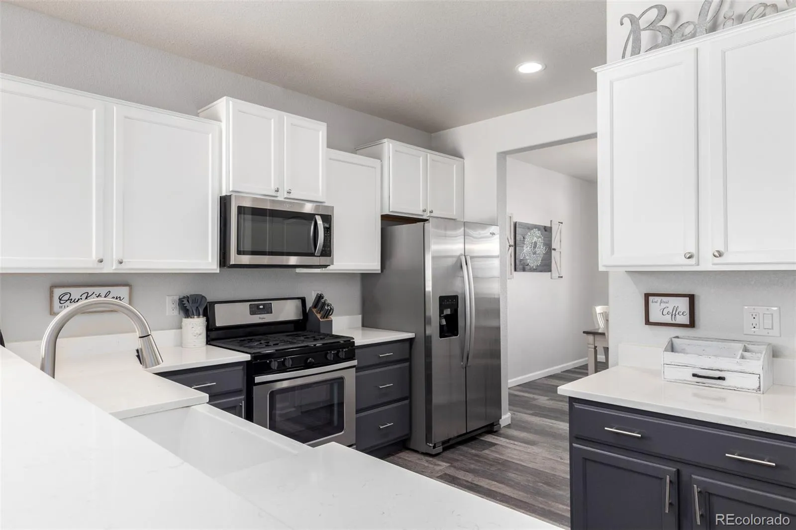 the heart of the home is a striking kitchen equipped with a gas range, stainless steel appliances, custom quartz