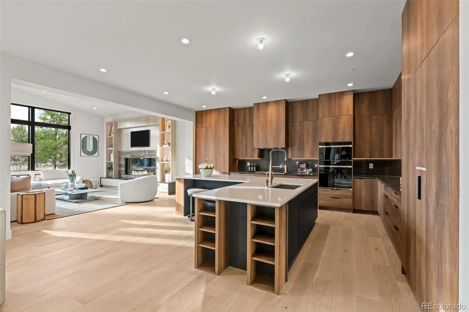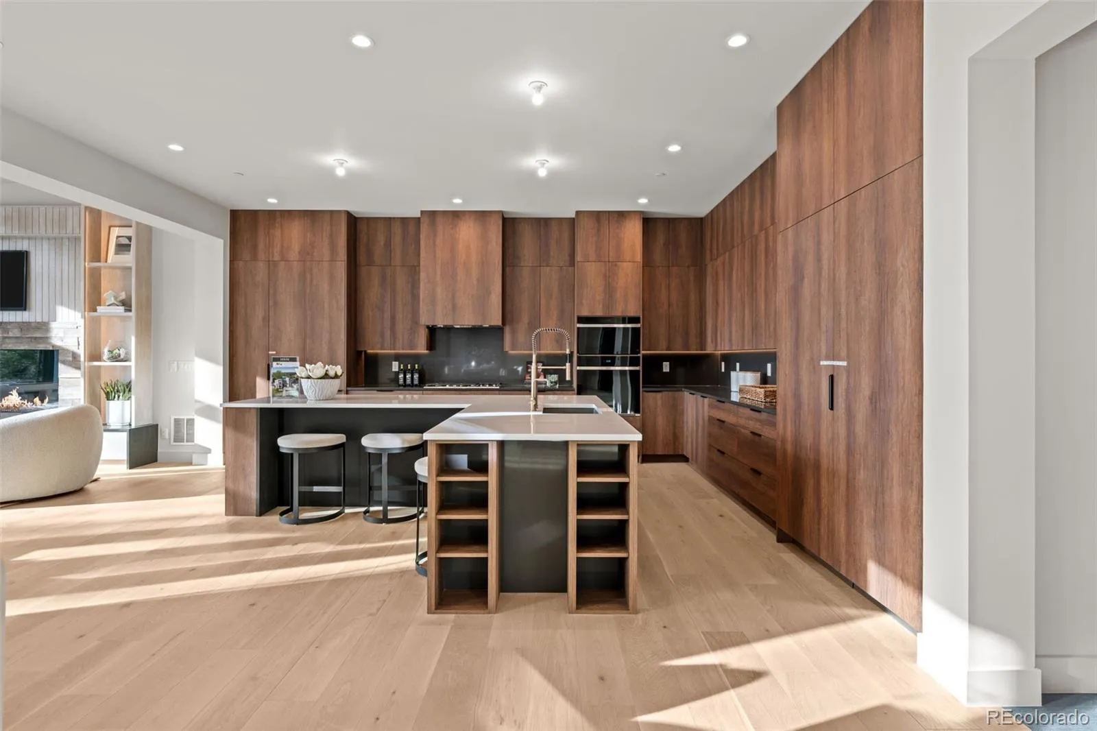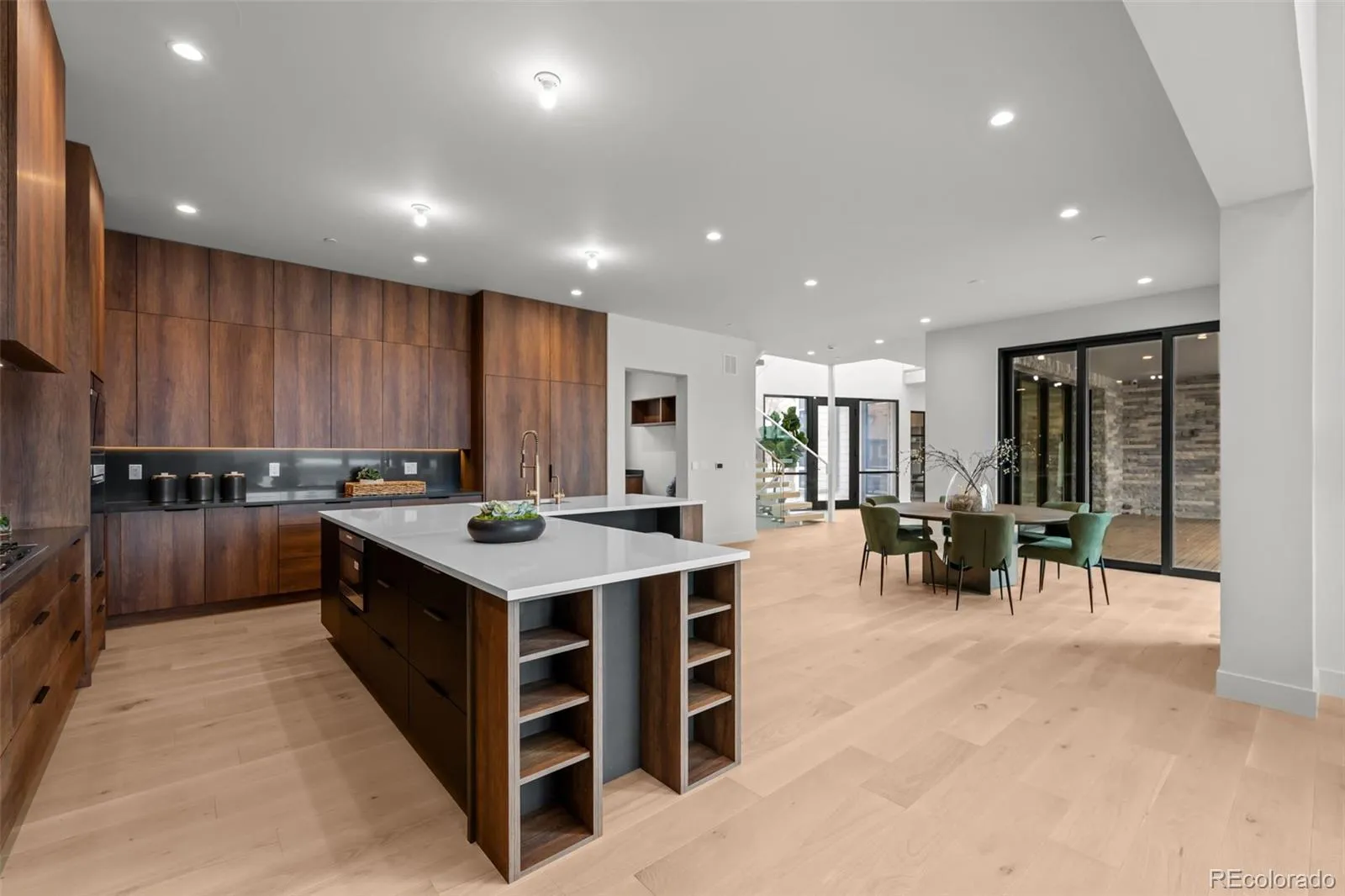 The home features a stunning chef’s kitchen that faces a set of stacking doors that blur the lines between indoor and outdoor living. The kitchen is highlighted by floor-to-ceiling sleek walnut-hued cabinetry, top-of-the-line quartz countertops and backsplash, brushed gold designer plumbing, Thermador & Wolf appliances, a hidden walk-in pantry, island seating, and a spacious mudroom off the 4-car garage complete the space.