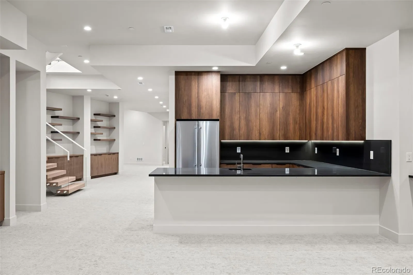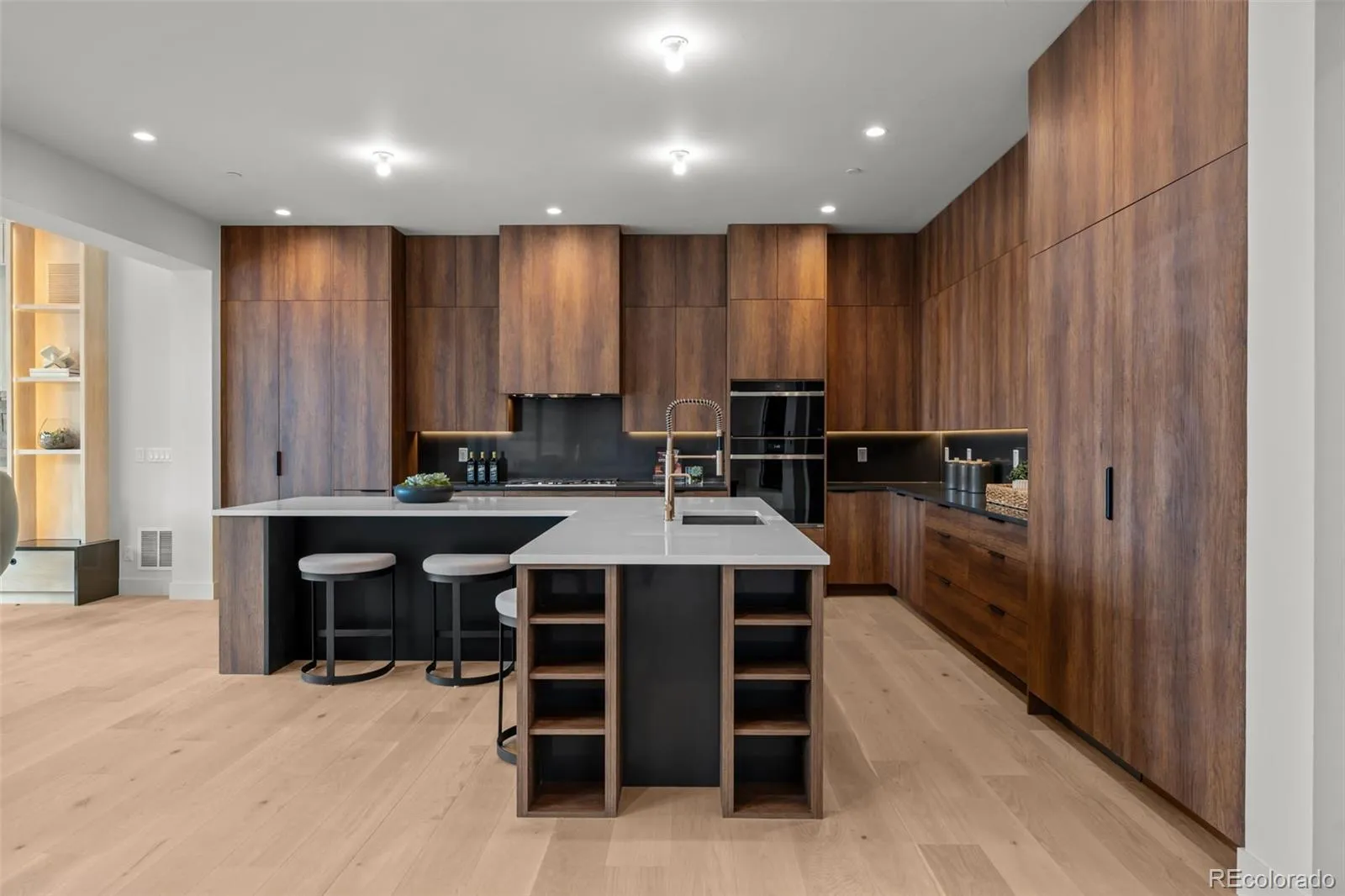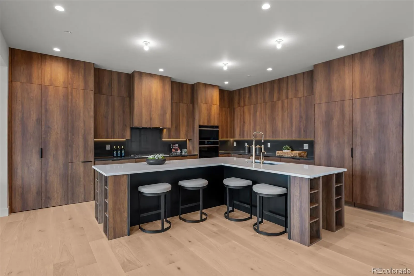 The home features a stunning chef’s kitchen that faces a set of stacking doors that blur the lines between indoor and outdoor living. The kitchen is highlighted by floor-to-ceiling sleek walnut-hued cabinetry, top-of-the-line quartz countertops and backsplash, brushed gold designer plumbing, Thermador & Wolf appliances, a hidden walk-in pantry, island seating, and a spacious mudroom off the 4-car garage complete the space.