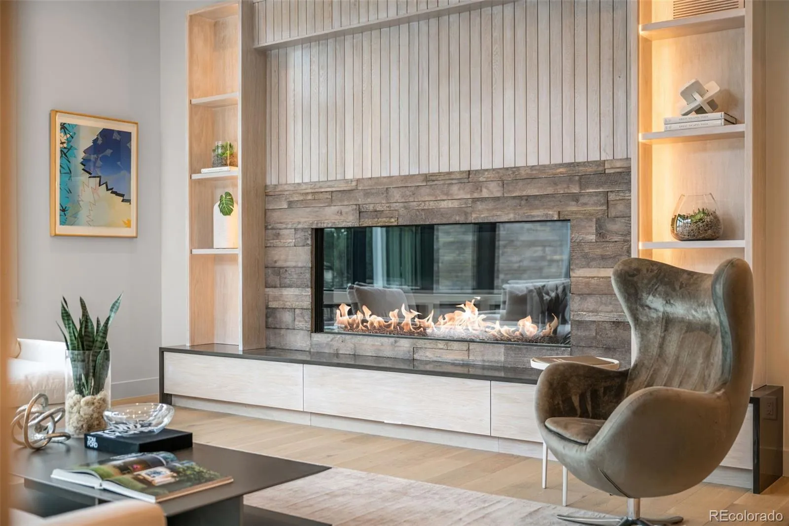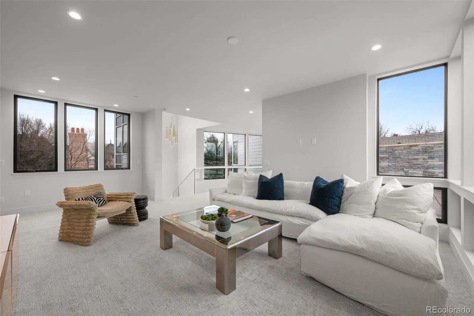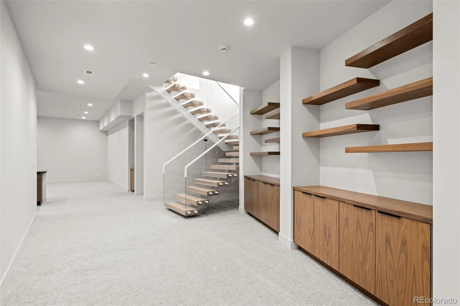 A dramatic two-story entry with floor-to-ceiling Marvin windows and expansive sliding glass doors create a stunning first impression. High-end finishes abound including custom wide-plank engineered flooring, a mono-stringer staircase with glass side panels, and electronic privacy film at the front door for enhanced security.