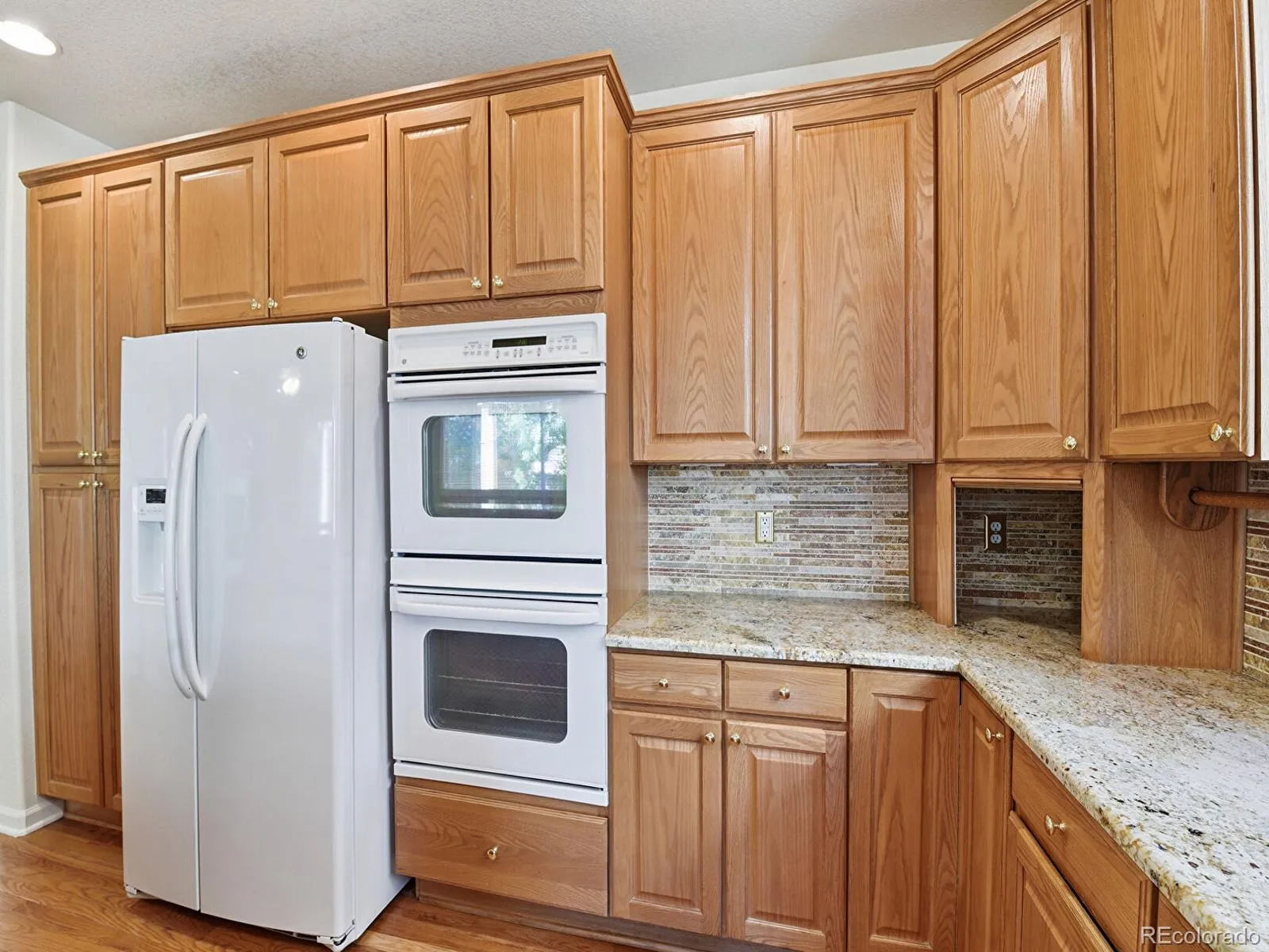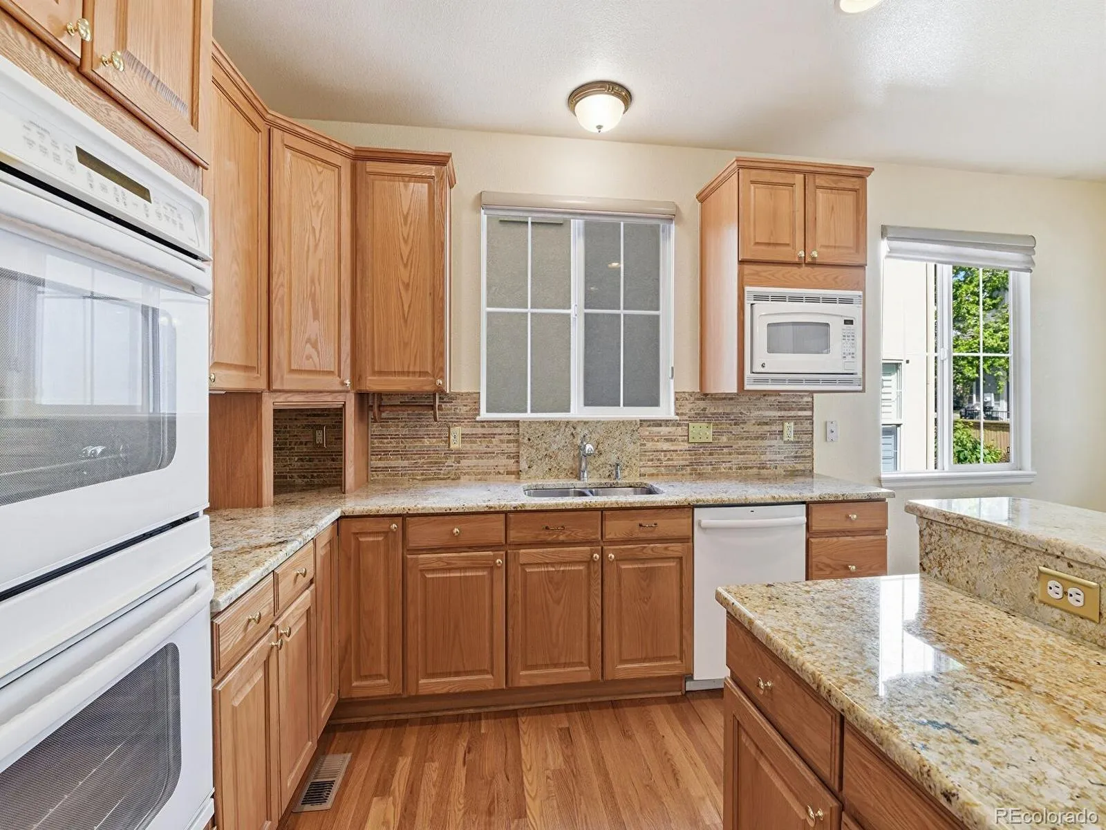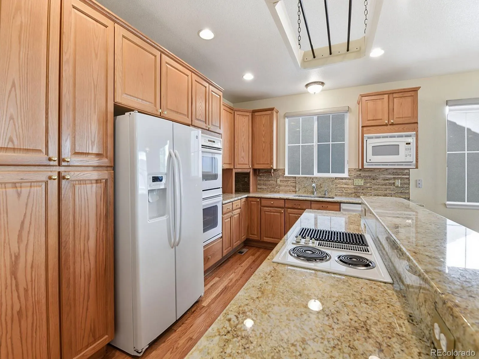 Open-concept main level with large kitchen including slab granite countertops, electric cooktop, double oven, ample cabinetry, and eat-in dining area