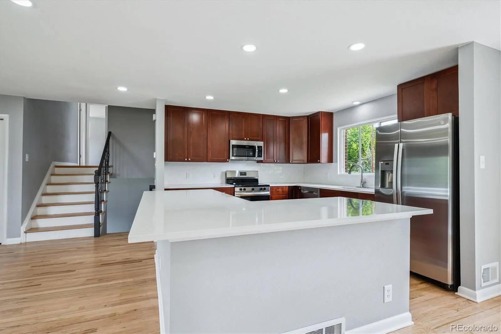 Southglenn Stunner at an Amazing Price! Fully Remodeled, Move-In Ready! Every inch of this 3-bed, 3-bath home has been redone and it shows. Refinished hardwood floors, fresh paint, and a kitchen that stops you at the door with an oversized L-shaped island, quartz countertops, soft-close cabinetry, and new stainless appliances. This isn’t just a cosmetic flip. The open main floor flows from living to dining to kitchen without walls getting in the way, great for hosting and better for everyday life. Upstairs, the primary suite delivers a double closet and a remodeled 3/4 bath with a walk-in shower, oversized vanity, and clean contemporary tile. Two more bedrooms and a fully updated full bath round out the upper level. The lower level adds a bright walk-out family room, a remodeled half bath, and a laundry room with utility sink. Functional space that actually gets used. Out back: fully fenced yard, patio, and a storage shed. One-car attached garage. Littleton Public Schools. C-470 minutes away. DTC, the mountains, and The Streets at Southglenn all within easy reach.
