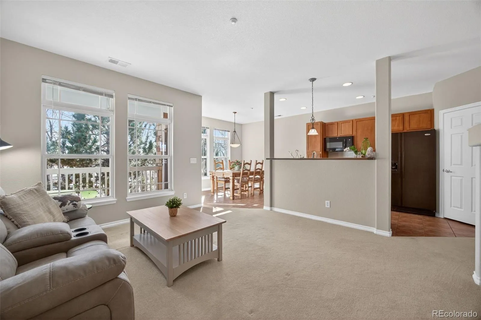 Welcome to this serene and sun-filled condo in The Village at Broadlands, where comfort, privacy, and nature come together. This spacious two-bedroom, two-bath home offers a rare layout with no neighbors above or below, creating a quiet and peaceful living experience. The large living room features a cozy fireplace and flows seamlessly into the dining area and kitchen, complete with a breakfast bar—perfect for everyday living or relaxed entertaining. A dedicated laundry room with washer and dryer adds convenience, while large picture windows throughout the home invite in an abundance of natural light and tranquil views. Step outside onto the private balcony and take in sweeping views of the 11th hole of the Broadlands Golf Course, surrounding trails, and open green space. It’s a perfect spot to unwind, enjoy the sounds of nature, and even spot the neighborhood owl that visits most evenings from a nearby tree. The home is accessed through a well-kept, quiet courtyard that adds to the peaceful atmosphere. Residents of The Broadlands community enjoy access to a clubhouse and outdoor pool, along with miles of nearby trails ideal for walking, biking, and outdoor enjoyment. Conveniently located close to shopping and dining, with Safeway just a short 0.2-mile walk across Lowell Blvd, this condo offers the perfect balance of tranquility and accessibility. A truly special home with a calm, restorative feel—ideal for those seeking space, light, and a connection to nature.