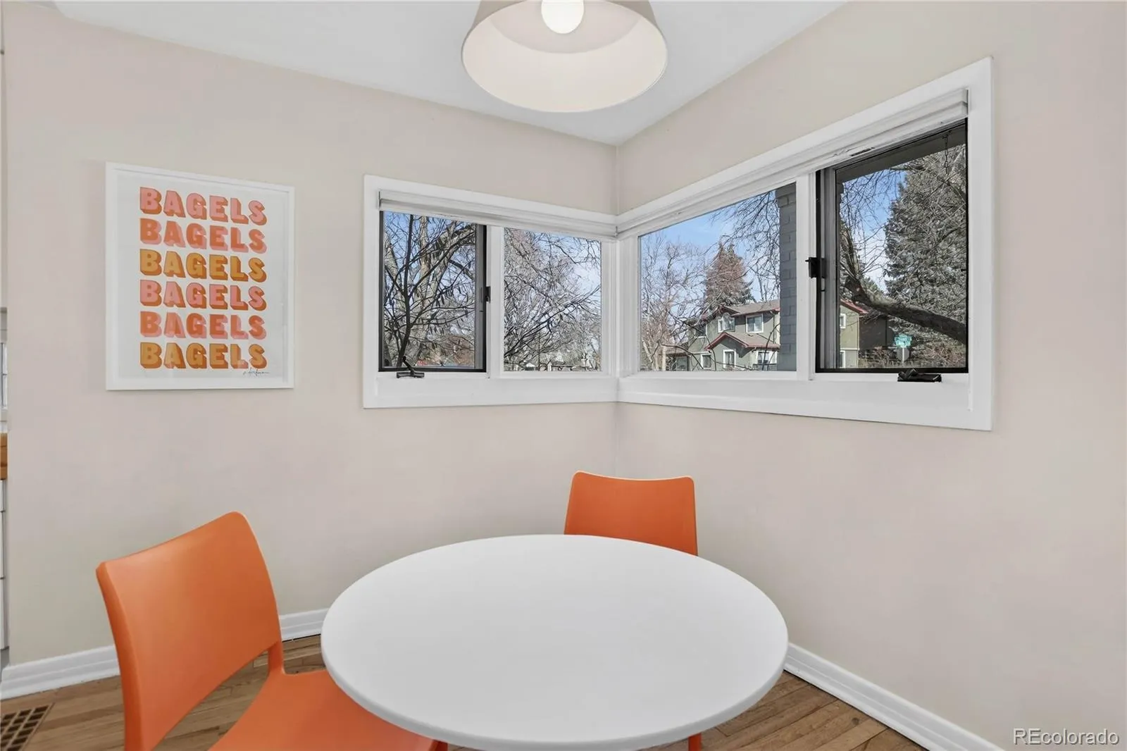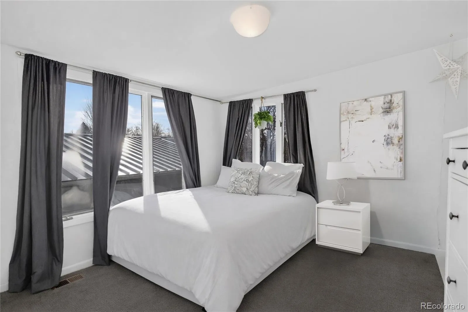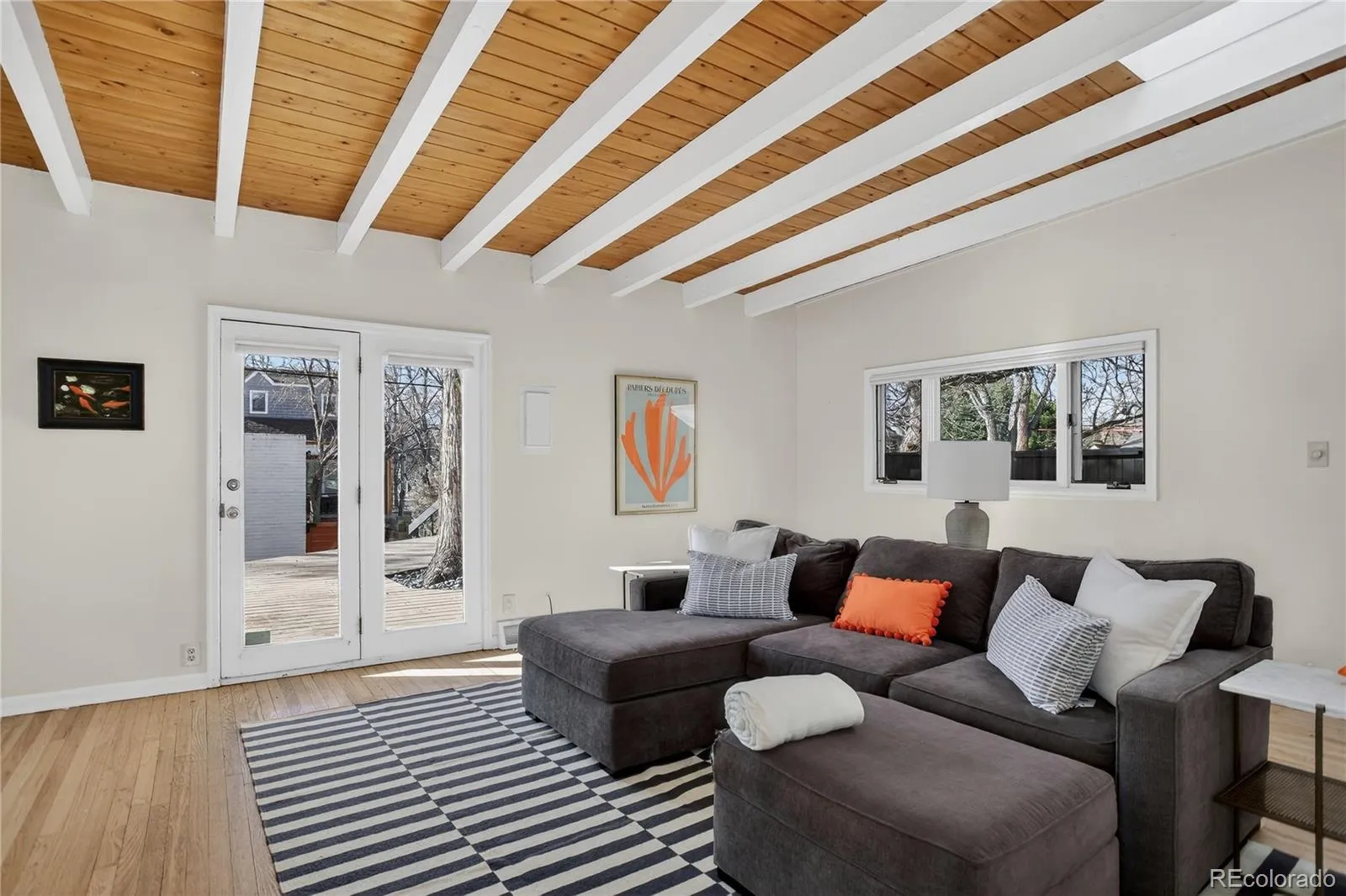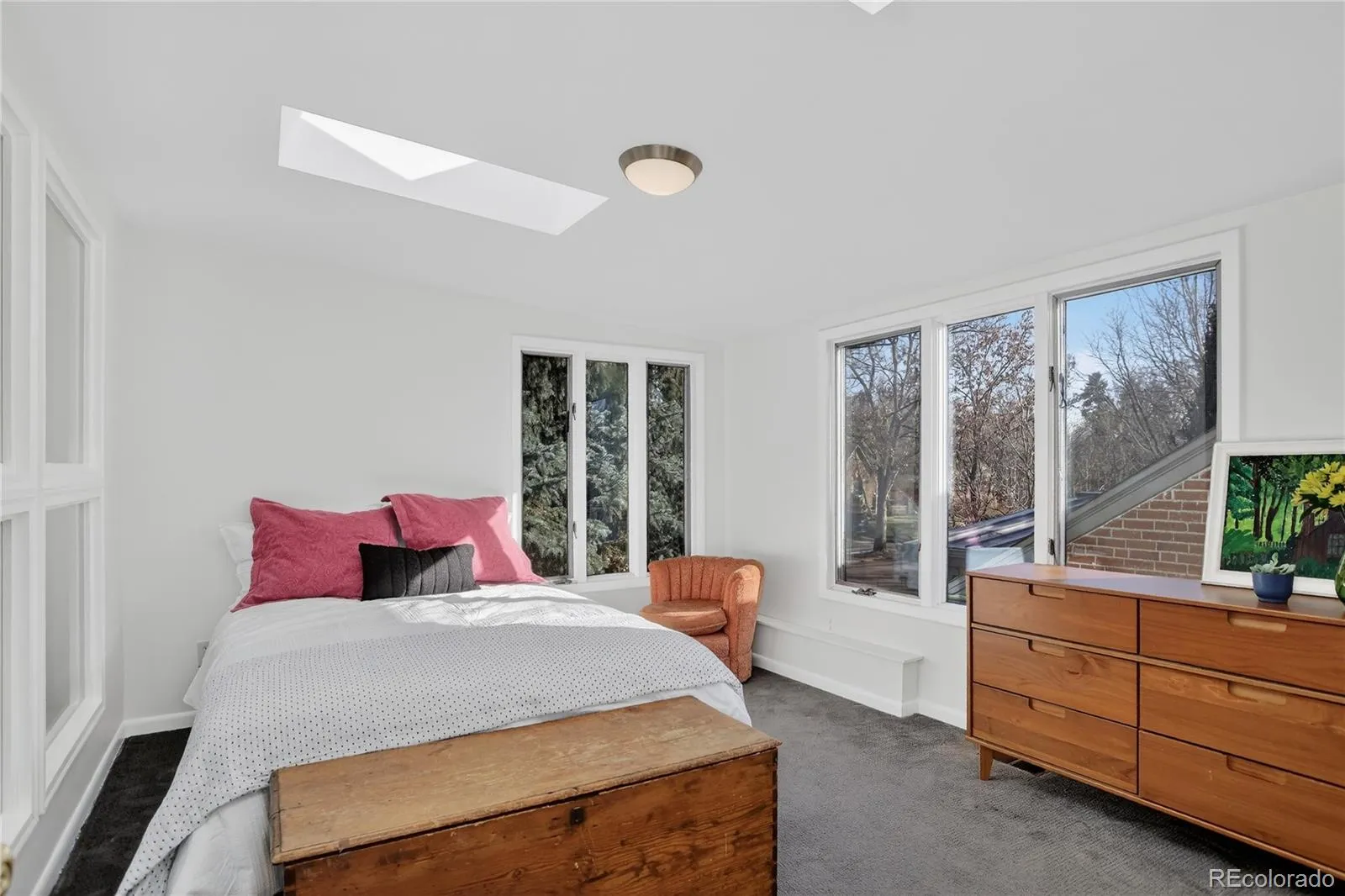 Showings start Saturday, 1/31. Open house 11:00-2:00. Located in the heart of Bonnie Brae, this striking 4-bedroom, 3-bath, 3,027-square-foot International Style brick home is a rare architectural gem built in 1941. Defined by its flat roof, asymmetrical lines, and glass-block windows, the home offers a timeless vintage-modern aesthetic on a spacious corner lot. Upon entry, soaring 20-foot ceilings and glass-block windows frame a floating staircase leading to the second floor. The main level features an open floor plan highlighted by a great room with high ceilings, exposed wood beams, and hardwood floors throughout. Additional main-level spaces include a bedroom, large dining room, and a living room with a wood-burning fireplace. Upstairs, the expansive primary suite offers an en-suite bath and a generous walk-in closet. Two additional large bedrooms and a full bath complete the second level. The finished basement includes a bonus recreation room with a second fireplace, providing flexible living and entertaining space. Multiple skylights and oversized windows fill the home with natural light throughout. Outside, enjoy a private backyard oasis featuring a 700-square-foot deck, full fencing, mature trees and professional landscaping throughout the property. Bonnie Brae Park is located just around the corner. The house has walkable access to Gaylord Street, Washington Park, and minutes to Cherry Creek North. Easy access to Downtown Denver and the DTC. A rare blend of architectural significance, modern livability, and an unbeatable Bonnie Brae location—this home offers timeless design and exceptional space in one of Denver’s most coveted neighborhoods.