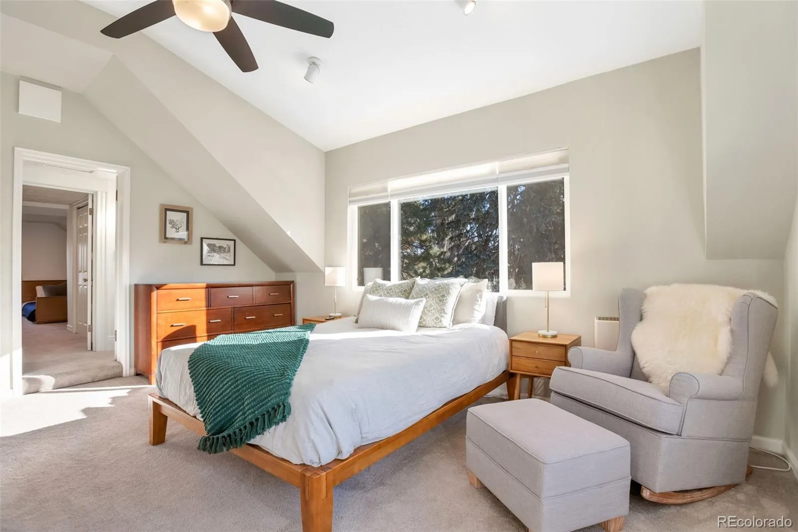Upstairs, you’ll find two seriously spacious bedrooms. The front bedroom features a sweet nook tucked under the eaves—perfect for reading, relaxing, or creative play. The back bedroom is the dreamy primary suite, complete with vaulted ceilings, a wall of windows framed by trees, a walk-in closet, and a truly gorgeous en-suite bath.