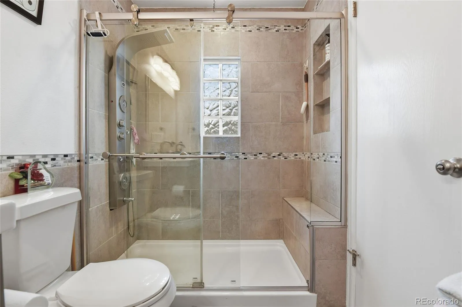 The upper bath stuns with custom tile, dual shower heads, and a double vanity. The primary bedroom includes a walk-in closet plus a second upper-level bedroom. The lower level offers a spacious family room with fireplace, a third bedroom, additional bath, and laundry.