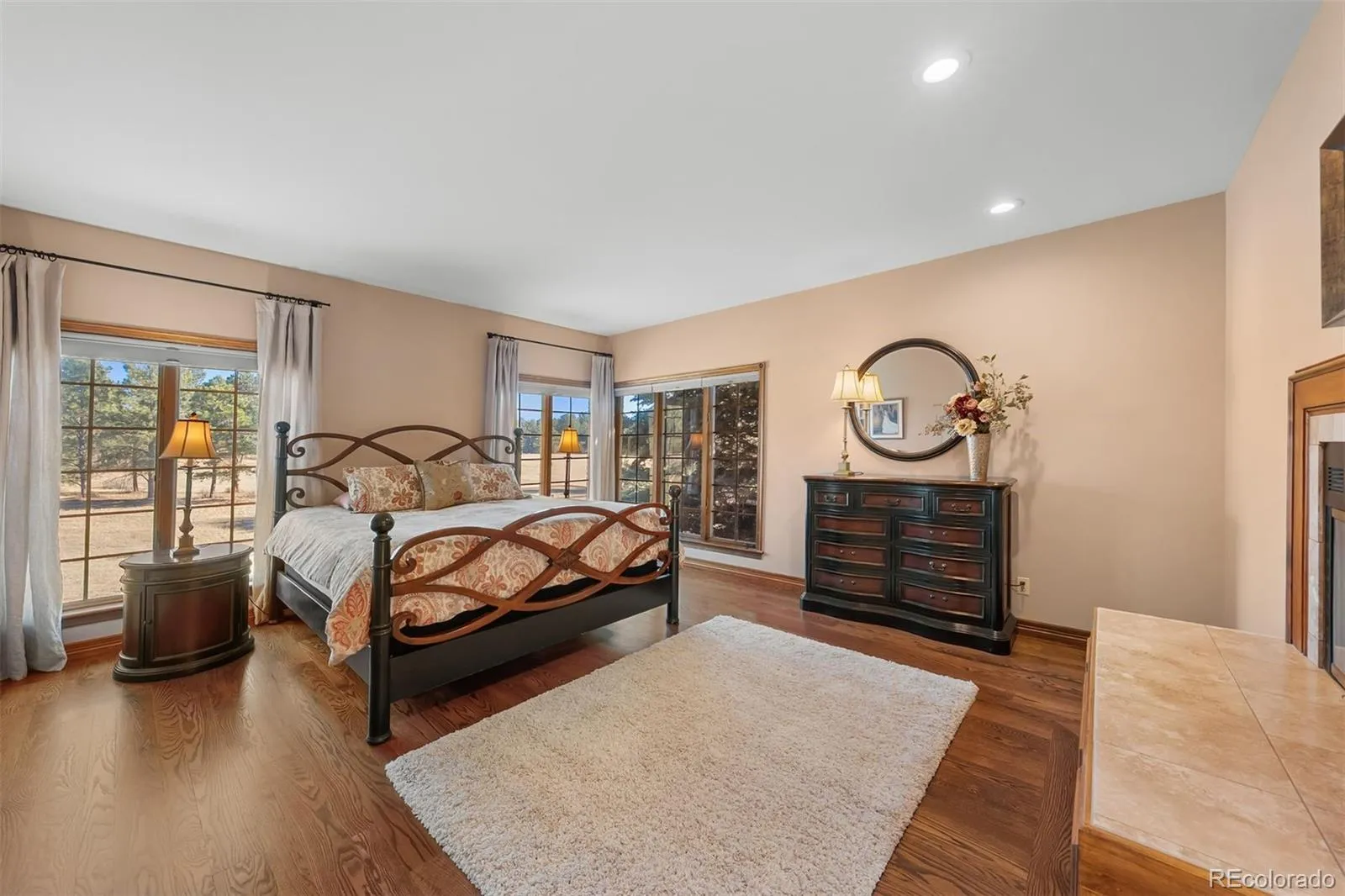 The main level offers an open great room centered on a two-sided brick fireplace. Vaulted ceilings, expansive windows, and mountain views fill the space with light, while a wet bar elevates every gathering. The remodeled kitchen features generous cabinetry, a large center island, granite countertops, Bosch appliances, and seamless flow to two dining areas, ideal for both casual living and elegant entertaining.
