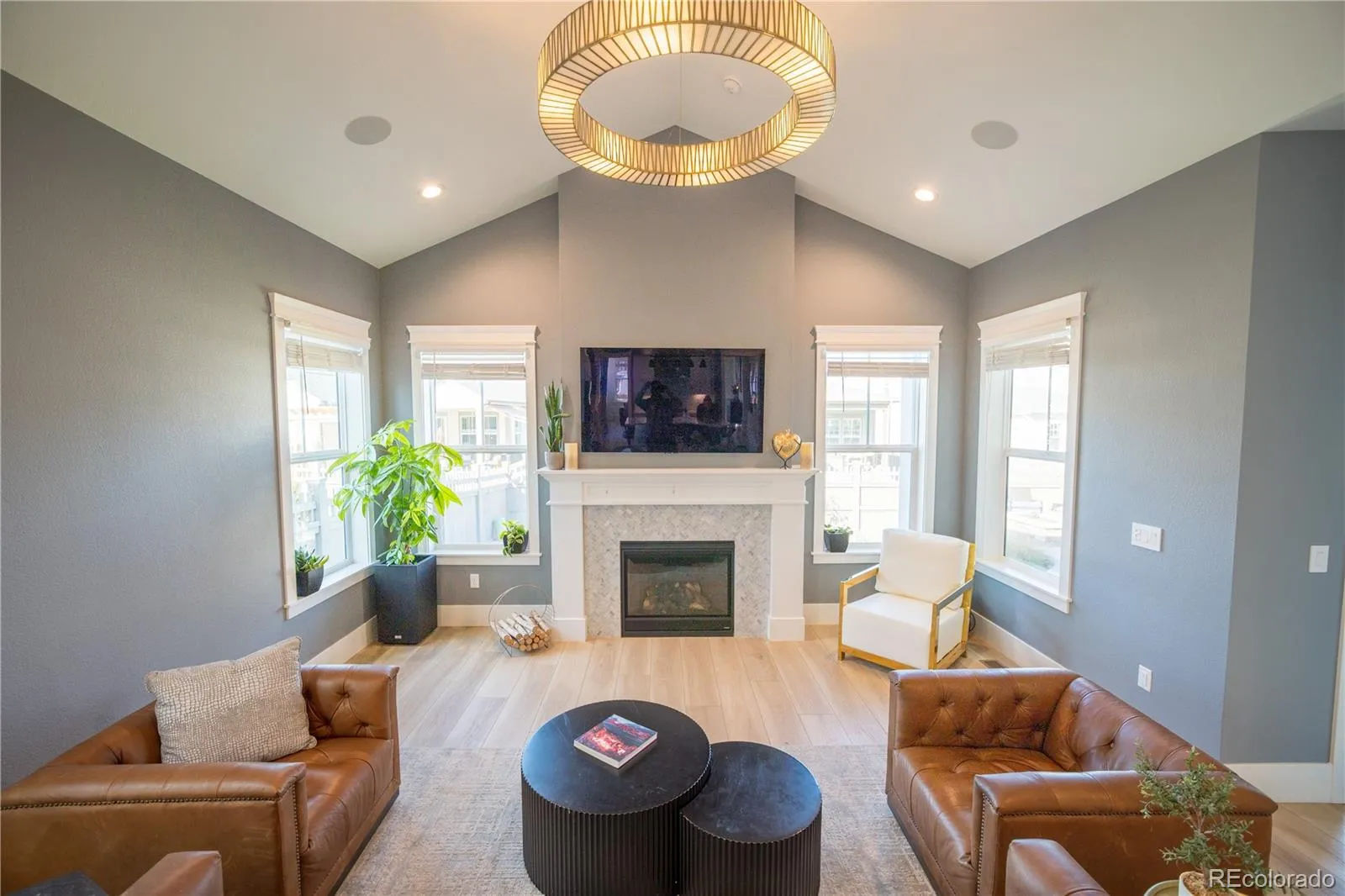 Get ready to be wowed by custom lighting fixtures throughout accompanied by thoughtfully painted spaces, vaulted primary, finished garage with reclaimed barn wood accents and a silent wall-mounted opener.
