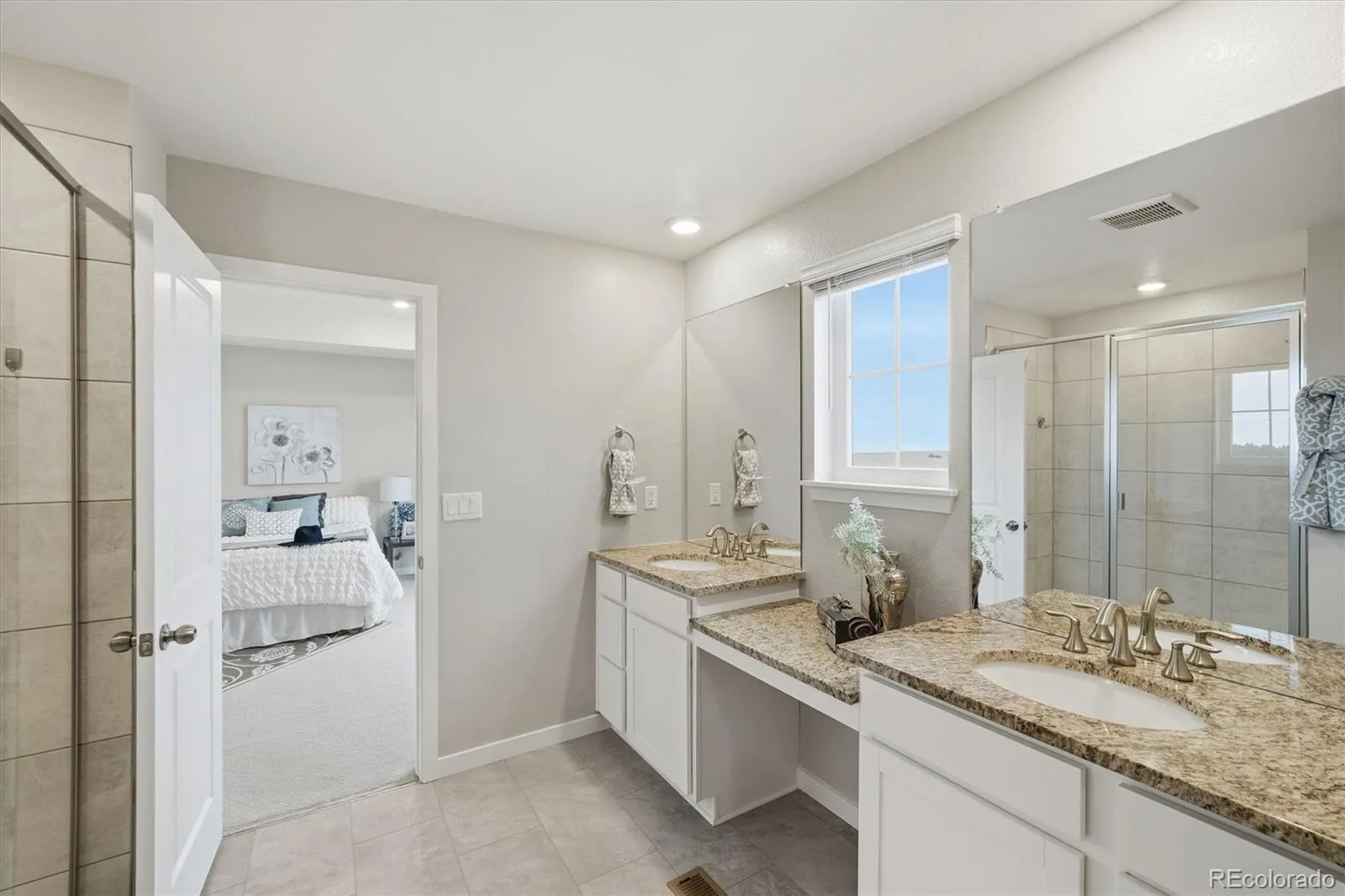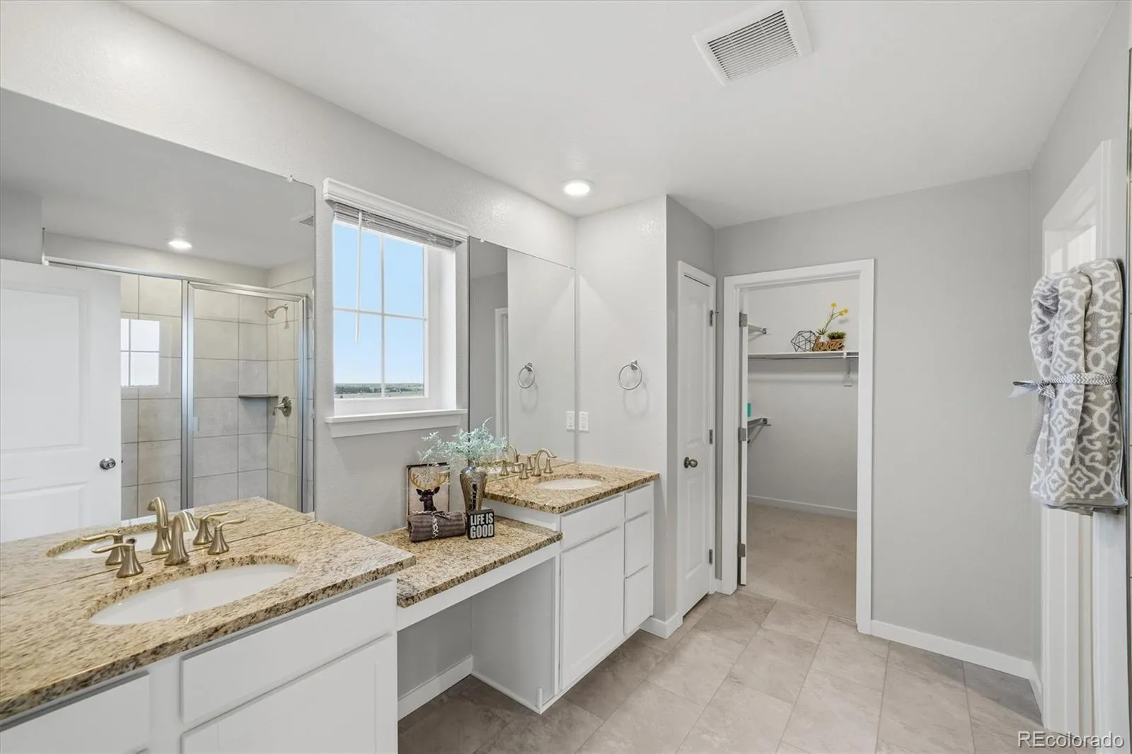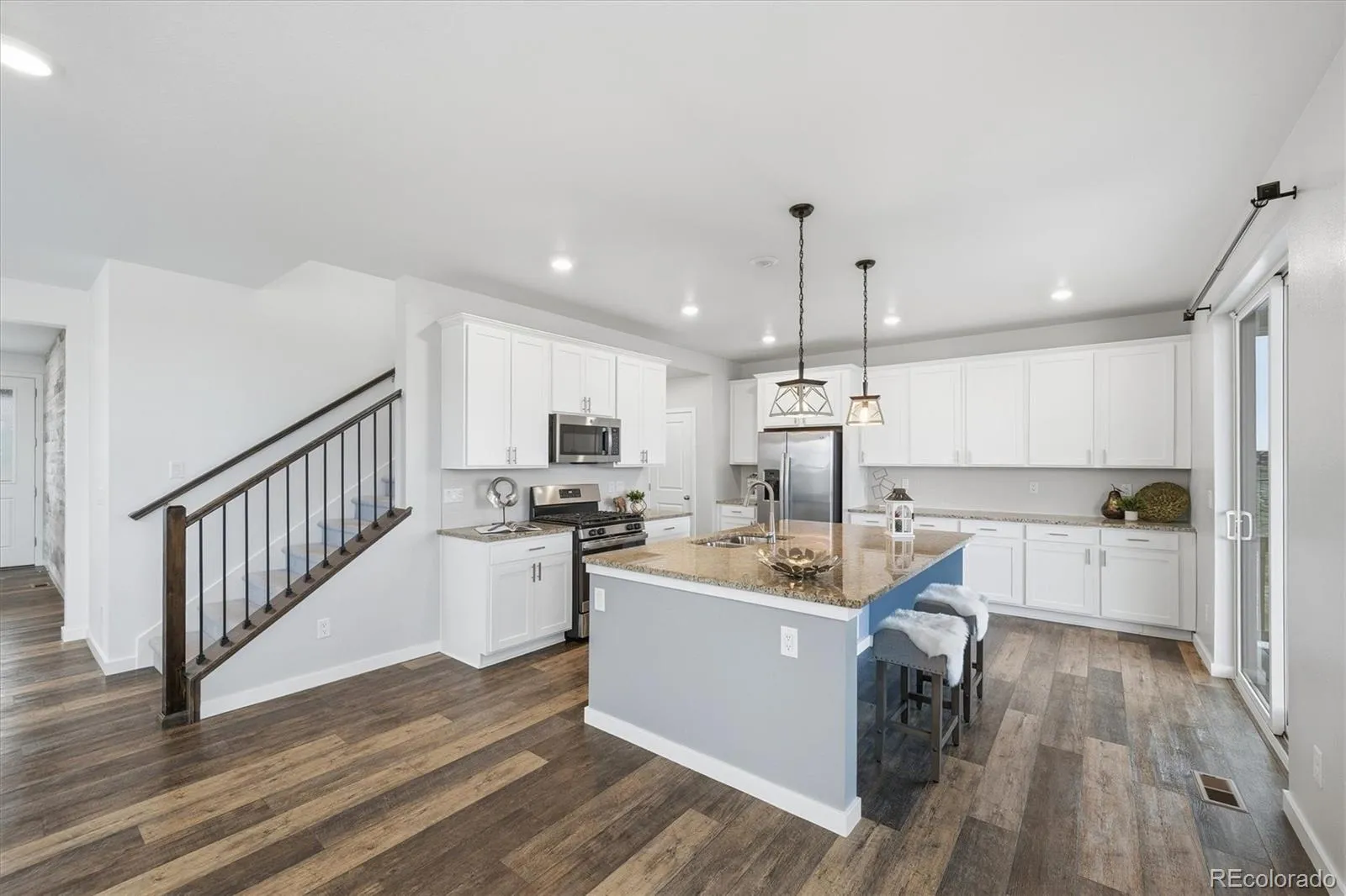 The kitchen features white cabinetry, slab granite counters, stainless appliances, and a large island with seating. A main-floor office and dining room offer flexible living space. Upstairs includes four spacious bedrooms, laundry, and a primary suite with open-space views, walk-in shower, granite counters, and custom wood closet built-ins.