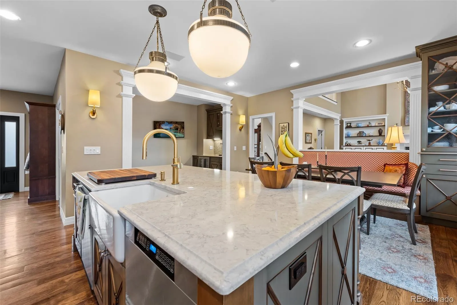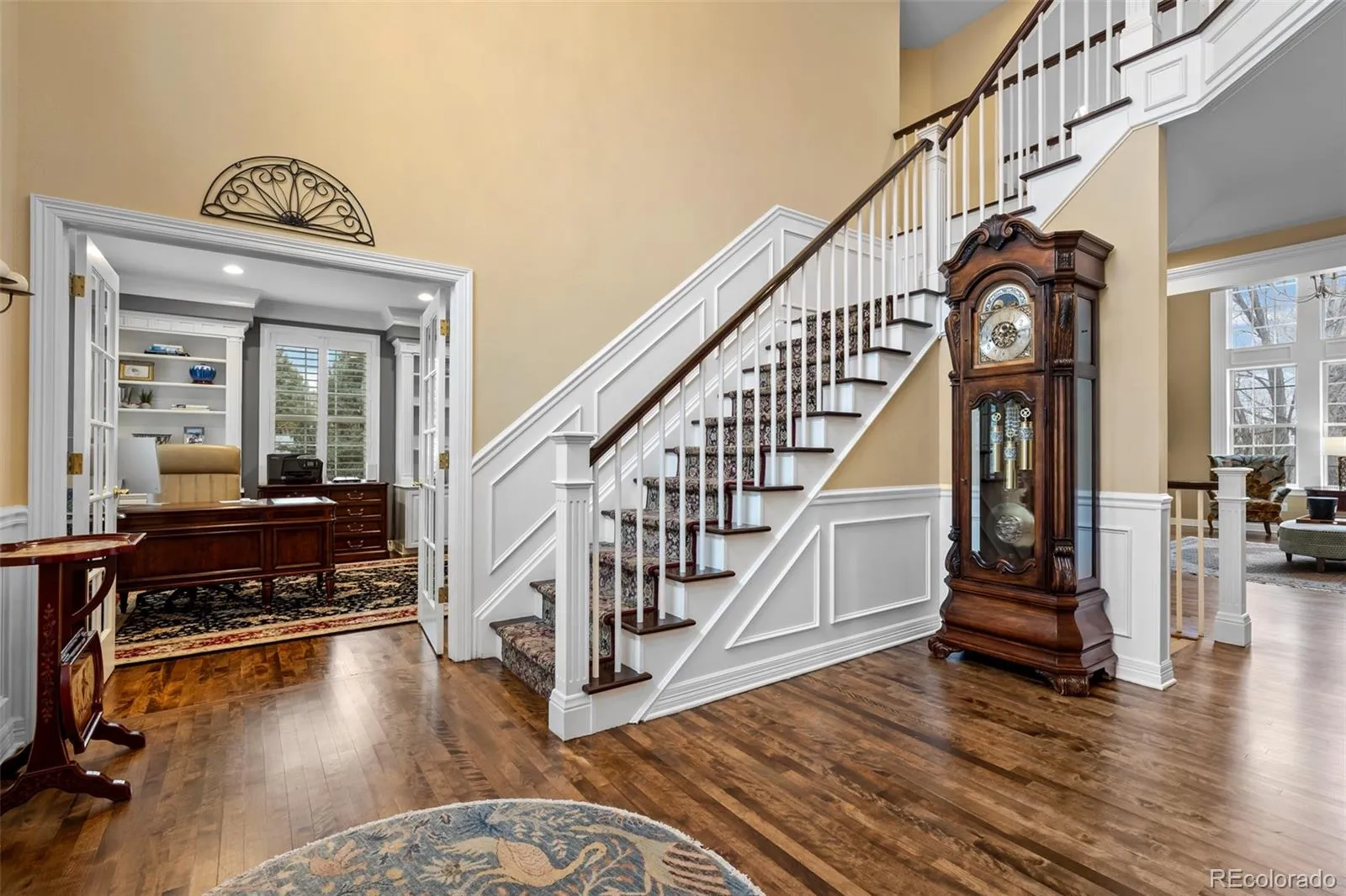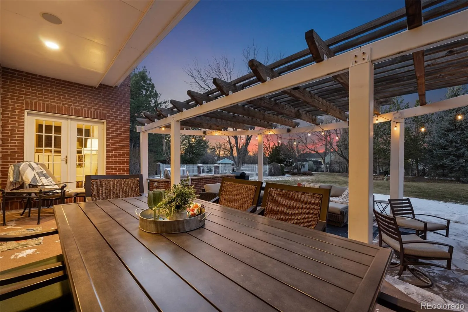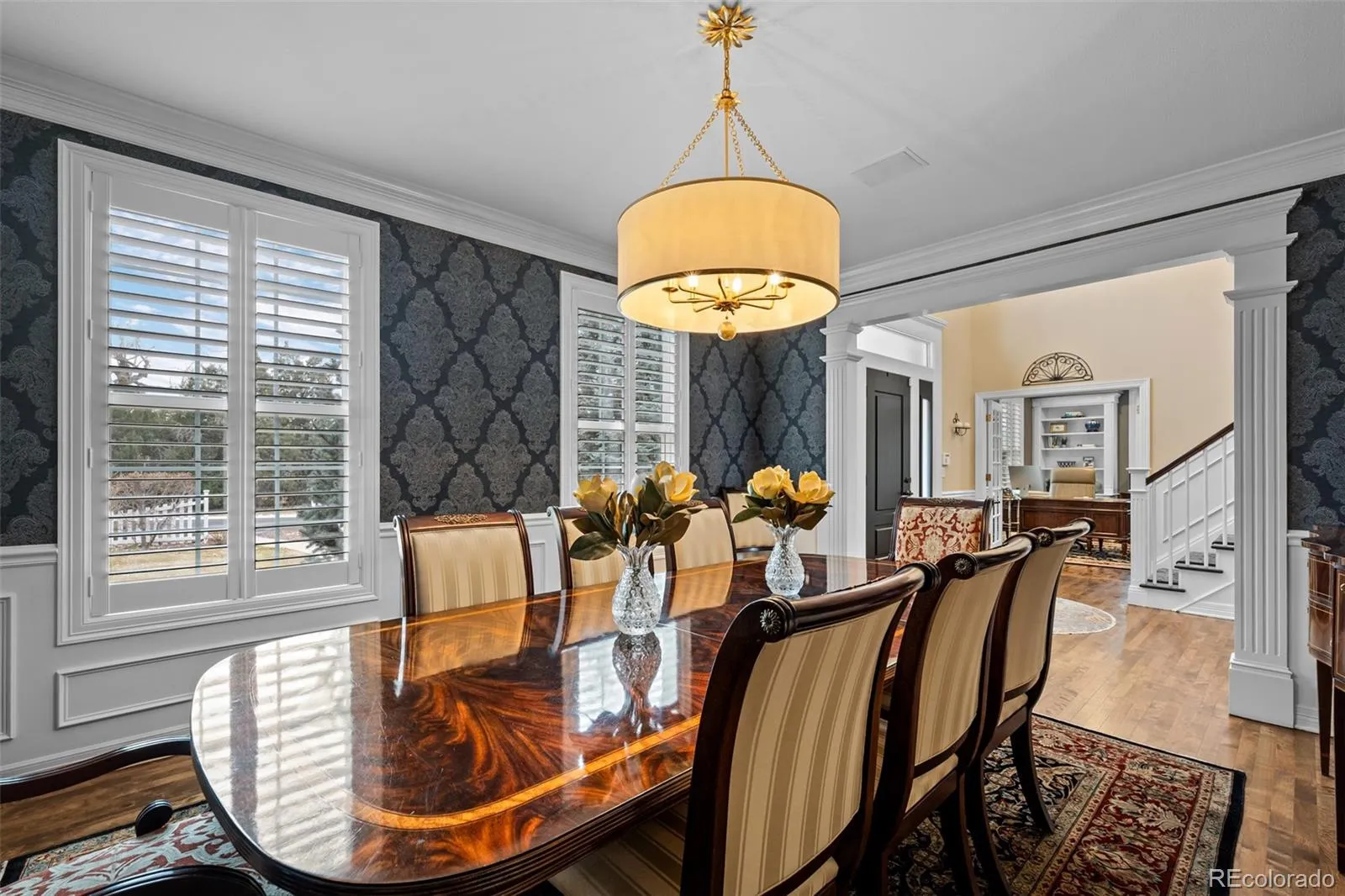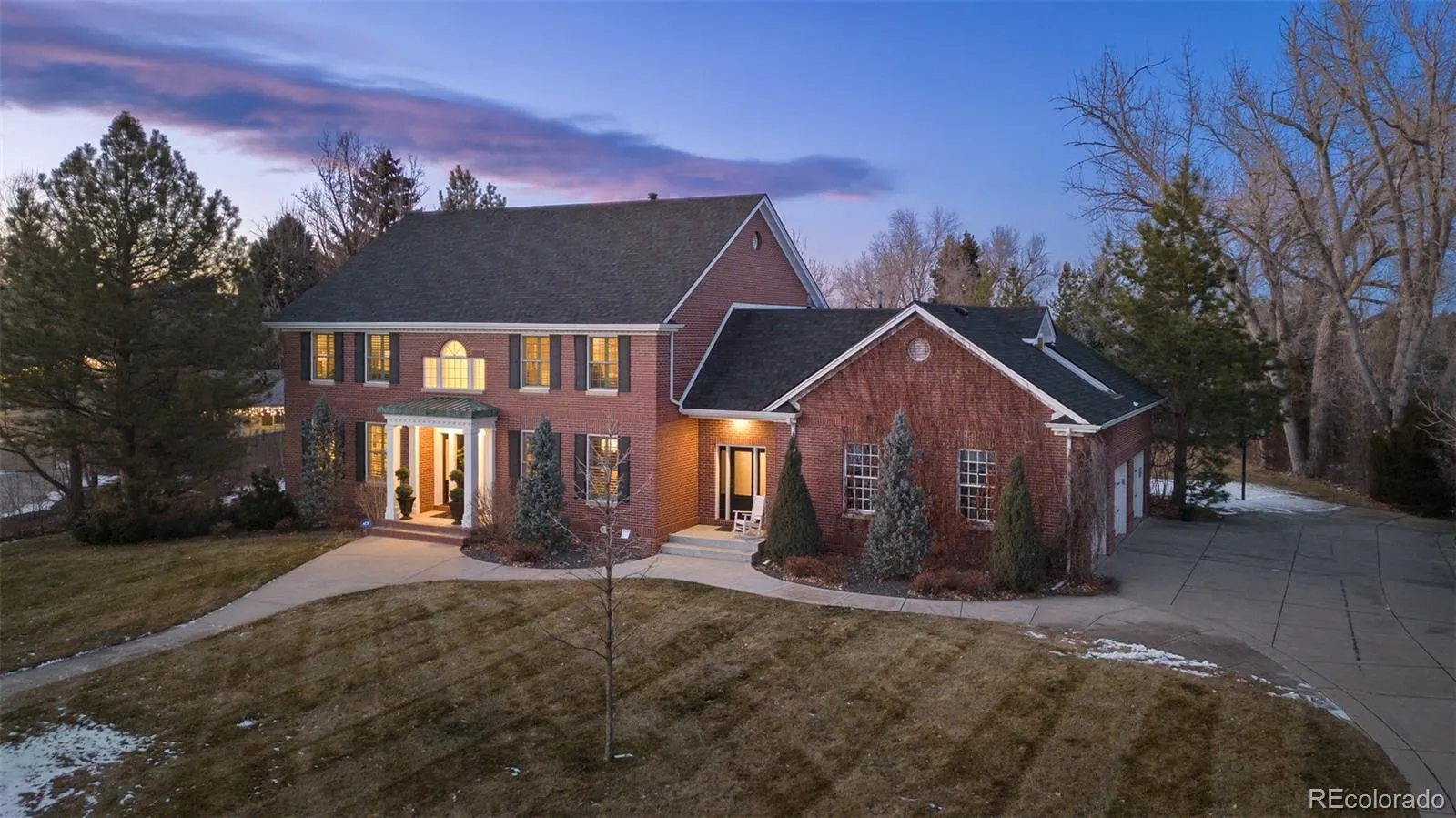Majestic colonial-style 2-story home on a generous 1.1-acre lot on Front Range Road—an enclave known for large estate properties and custom homes. Enjoy the tranquility of a rural setting among mature, tree-lined streets, while just one mile south of Downtown Littleton and historic Main Street, offering privacy and convenience. Inside, sunlight streams through expansive windows and high ceilings in the great room. Elegant wood flooring flows throughout, enhancing the sense of space and luxury. The kitchen, featured in 5280 Home Magazine, boasts a massive island, quartz countertops, a 6-burner Wolf stove, stainless appliances. Adjacent, the open dining area with bench seating and a hearth room includes a matching bar. The main level also has a versatile office with french-doors, spacious guest suite, and a palatial formal dining room—ideal for gatherings. Retreat to the remodeled primary suite with wood flooring, built-in cabinetry, and luxurious lighting. The five-piece ensuite bath is set upon gorgeous marble with a soaking tub, large, glass-enclosed shower, and dual vanities (and a private Toto washlet water closet). 3 more bedrooms and 2 bathrooms (ensuite and Jack-and-Jill), a laundry room, and a landing overlooking the great room reside upstairs. A back staircase connects to the mudroom and kitchen. The finished basement offers a family room with gas fireplace, an impressive bar with copper counters, an additional bed and bath, plus bonus space for media, gaming or home gym. Outdoor living is equally impressive, featuring lush landscaping that surrounds a hardscaped patio with pergola, built-in fireplace, grilling station, fenced pool, hot tub, planter boxes, and a welcoming firepit courtyard. This rare property is just moments from Historic Littleton, Southglenn, Aspen Grove, Blvd hotspots; Lightrail, plus trails galore…making it a truly special opportunity in the prestigious Front Range Road neighborhood.
