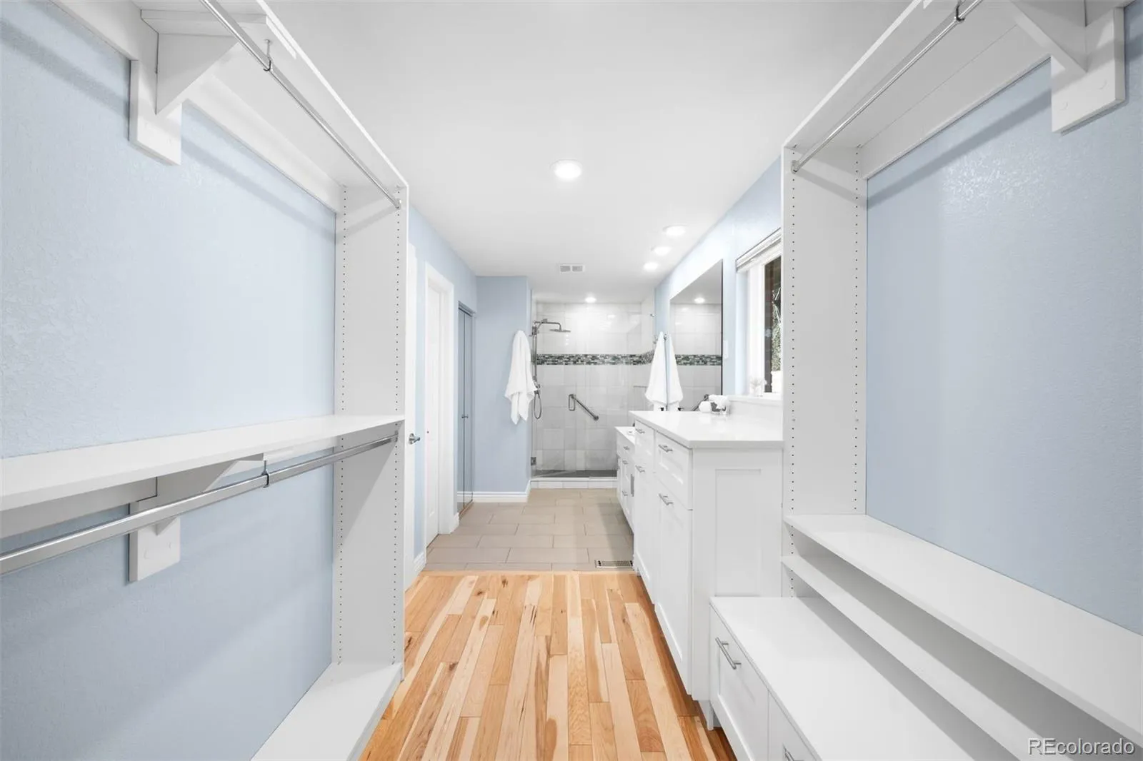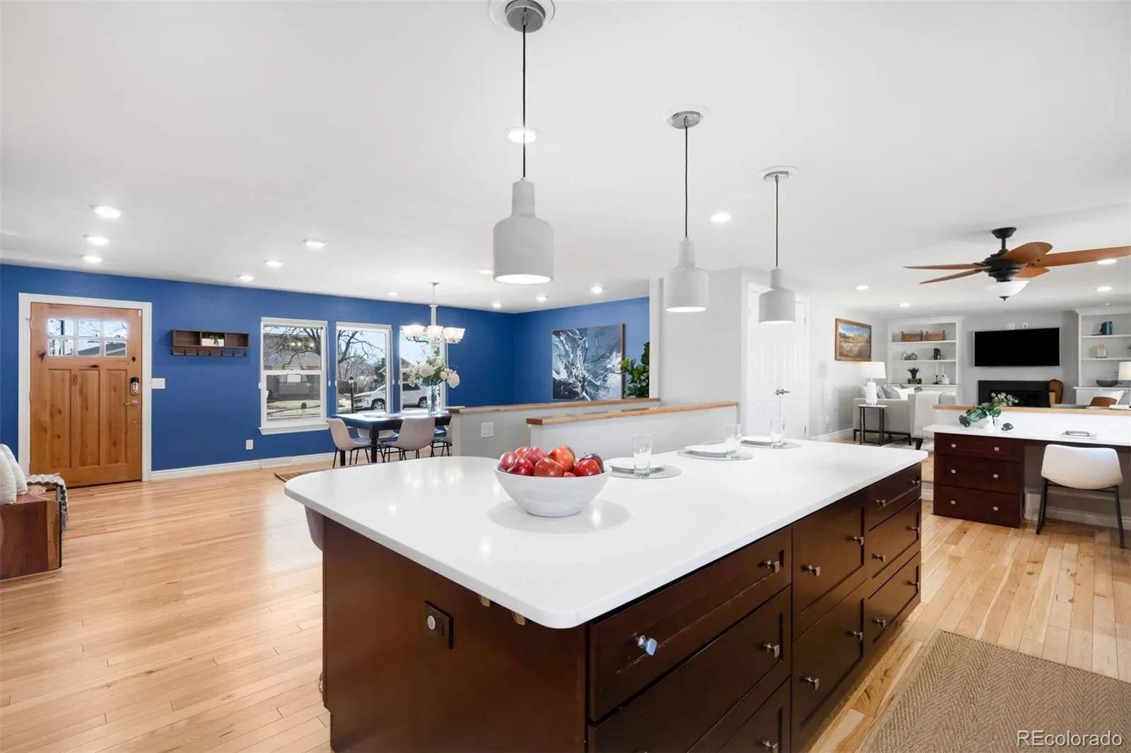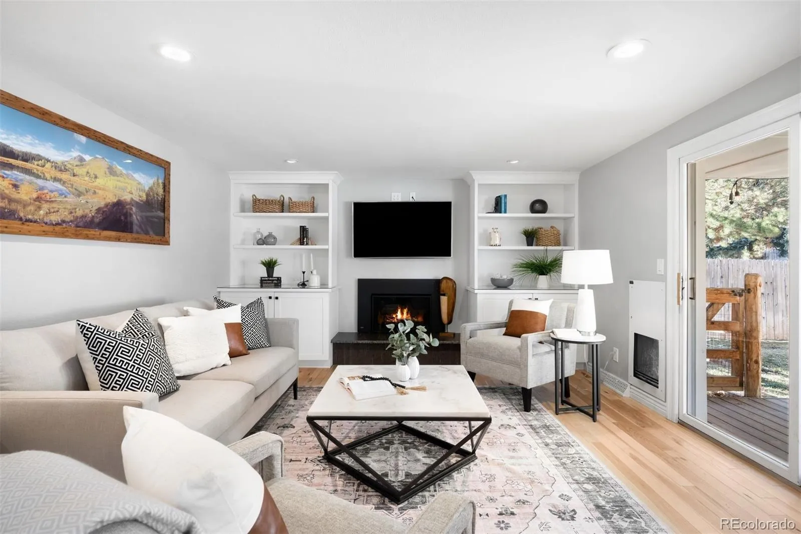 The open main level is filled with natural light and intentional design. The kitchen is a standout, seamlessly connected to the dining and living areas and built for both function and flow, featuring a large island, quartz countertops, stainless steel appliances including a JennAir dual-fuel gas range, abundant cabinetry, and a built-in desk. Just off the kitchen, the living room provides a cozy gathering space with a fireplace, built-in cabinets, and direct access to the back patio for effortless indoor-outdoor living. The spacious main-level primary suite has been recently remodeled and includes a heated-floor en-suite bathroom, custom walk-in closet, new vanity, and built-in storage. An additional bedroom and full bathroom complete the main floor. The finished basement adds versatility with a large family room with custom built in cabinets, space for a gym or play area, two conforming bedrooms, an updated guest bath, and a new laundry center with custom shelving. Storage is plentiful throughout the home. Recent upgrades include a new whole-house humidifier, fresh interior paint, and a new roof installed in 2024 with a transferable warranty and 10-year waiver. Outside, the fully fenced quarter-acre lot offers a private retreat with a covered patio and expansive grassy front and back yards, perfect for entertaining, play, or simply enjoying Colorado living.