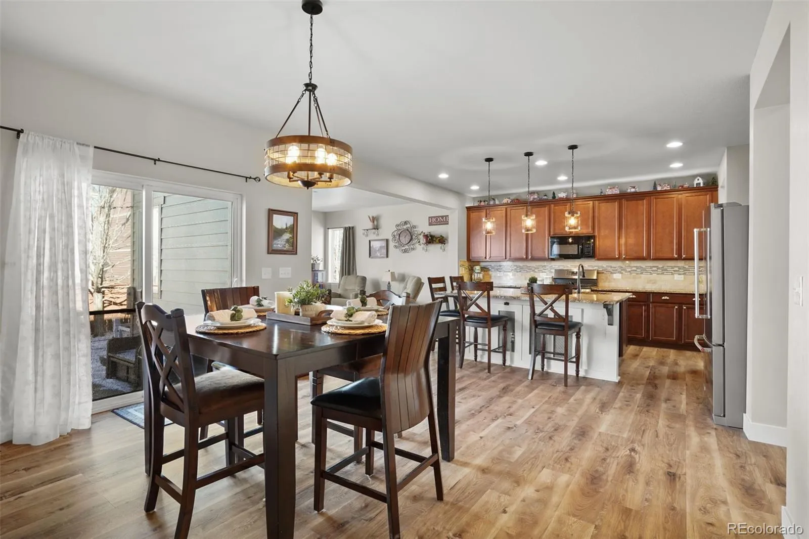 The open main floor showcases new LVP flooring and trim, flowing through the entry, kitchen, dining, and family room. The kitchen offers upgraded 3 cm granite counters, backsplash, gas range, double ovens, updated pendant and dining lights, cabinet hardware, and a wrapped island with board and batten and corbels. The main level bedroom is complete with ensuite bath and updated finishes. All baths feature taller toilets.