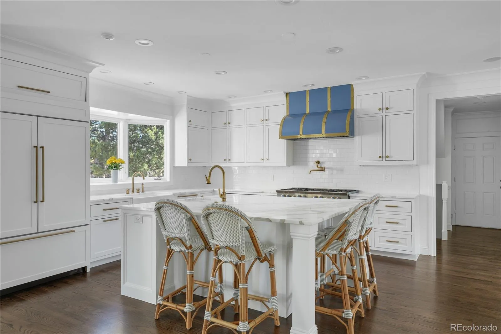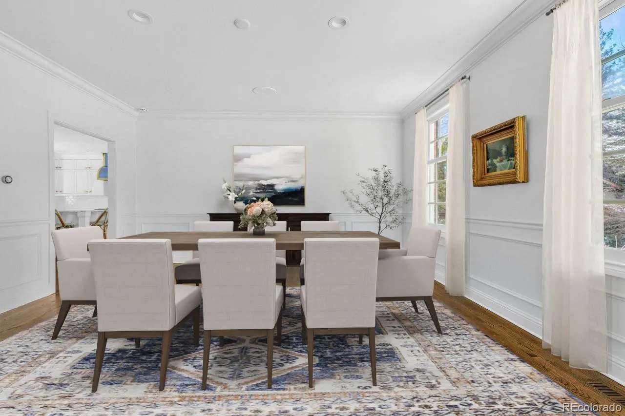 www.4600SColumbine.com. Discover the perfect blend of classic charm and timeless luxury in this stunning red brick home, located in desirable Cherry Hills Farm. Adjacent to the scenic bridle path on a 1.2+ acre private lot, this residence sits at the end of a quiet cul-de-sac with a welcoming circular drive. Upon entry, the two-story foyer features new paint and designer fixtures, along with refinished hardwood flooring throughout. The inviting living room includes a dual-sided fireplace shared with a home office featuring built-in cabinetry. A dedicated music room flows from the living room, ideal for entertaining and relaxation. The heart of the home is the renovated kitchen, elegantly appointed with marble countertops, white cabinetry, and a striking Blue Star range, complemented by a spacious center island and a walk-in pantry. An informal eating space includes built-ins and a bay window. An open design connects to the family room where a wet bar, along with built-ins, benches, and walls of windows enhance the ambiance and provide easy access to the spectacular outdoor space. The main floor features a mudroom, a 3/4 bath, a designer powder room, and a generous three-car garage with EV charging. Retreat upstairs to the primary suite, highlighted by a fireplace and a private deck surrounded by trees. The primary bath features skylights and a luxurious 5-piece layout, along with a spacious walk-in closet. Two additional bedrooms share a Jack and Jill bathroom, while the 4th bedroom has access to a hall bath. An enormous laundry room adds to the home’s practicality. The finished basement is versatile, with a media area, wine room, two conforming bedrooms, a full bath, and a dedicated gym. Set on an incredible lot, the professionally designed landscape features a patio with a built-in grill, fire pit, and fountain—ideal for outdoor entertaining amidst mature trees. This exquisite residence is located within the award-winning Cherry Hills school district.