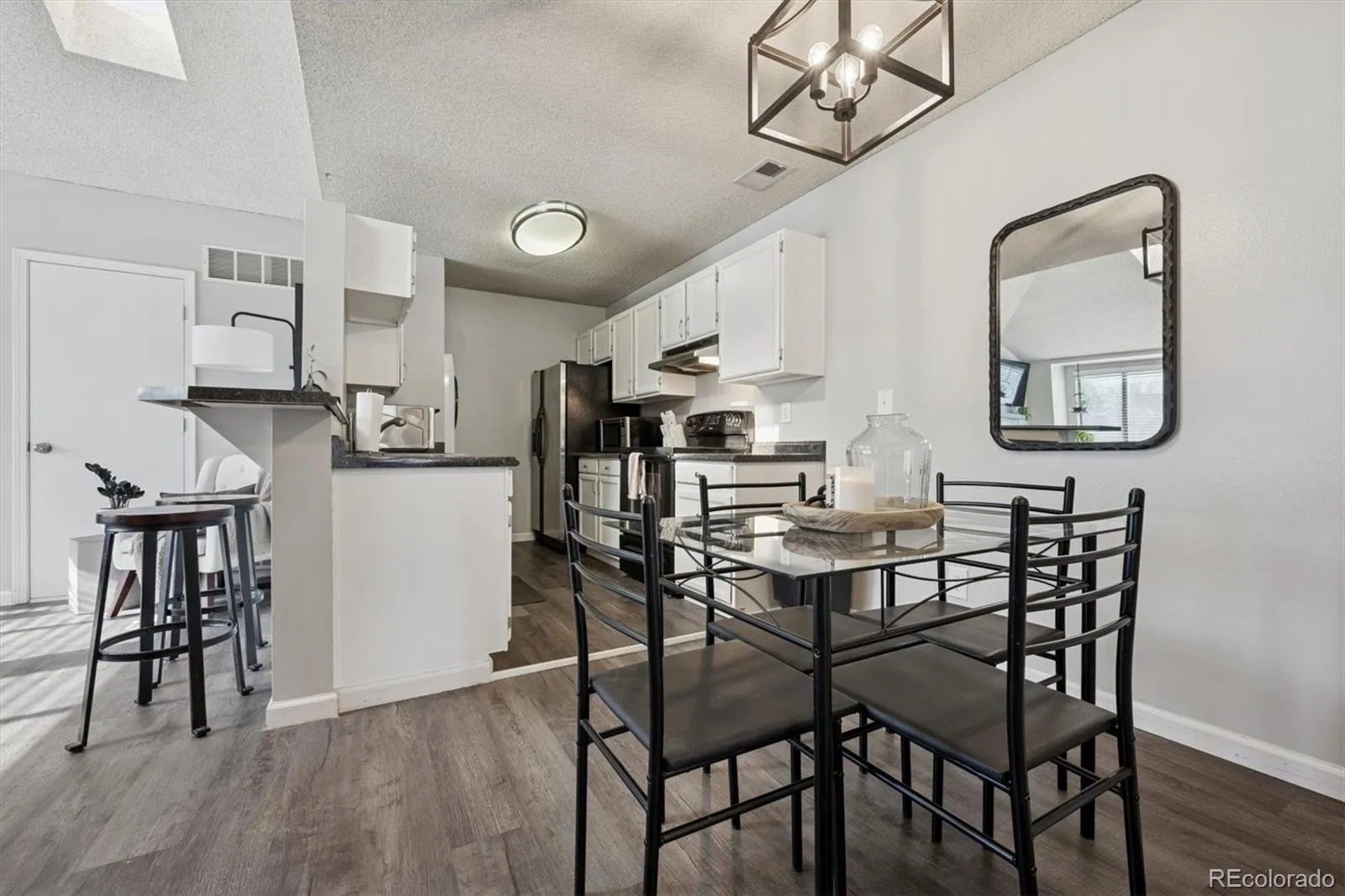 This bright and inviting 2-bedroom, 1-bath condo offers a thoughtfully designed open-concept layout filled with an abundance of natural light with new sleek grey laminate flooring throughout. As a second-story end unit, it enjoys added privacy and extra windows that create an airy, welcoming feel throughout the home. The spacious living room features a vaulted ceiling and a wood burning fireplace surrounded by tile, creating a warm and welcoming focal point. The kitchen provides ample counter space, white cabinetry, and black & stainless steel appliances, seamlessly flowing into the dining area—ideal for everyday living and entertaining. A convenient in-unit washer and dryer location add to the home’s functionality. Both bedrooms are well-proportioned and offer nicely sized closets. The full bath is conveniently located offering a shower/tub combo, spacious sink, and toilet. Enjoy comfort, style, and low-maintenance living in this light-filled end unit.