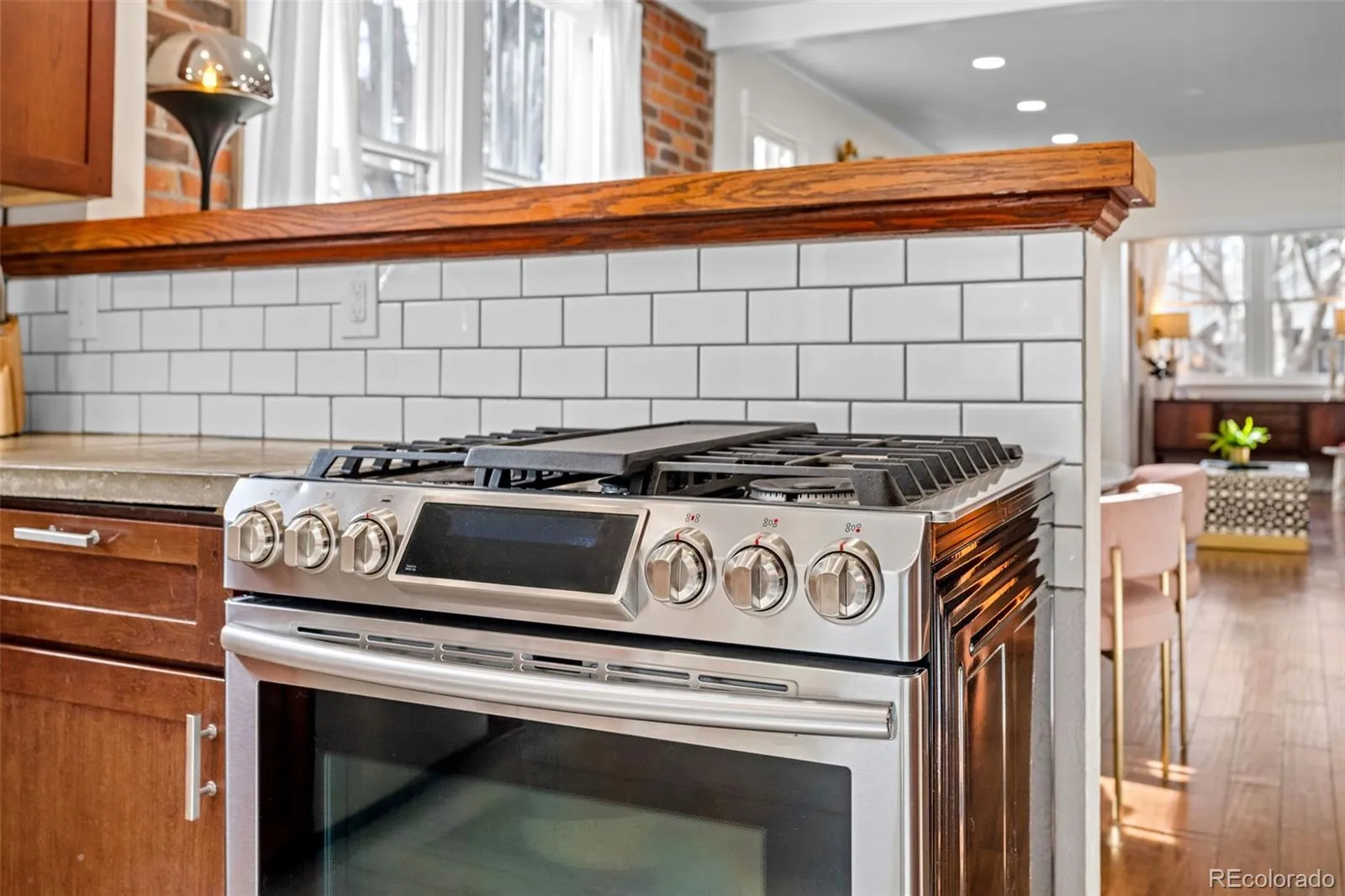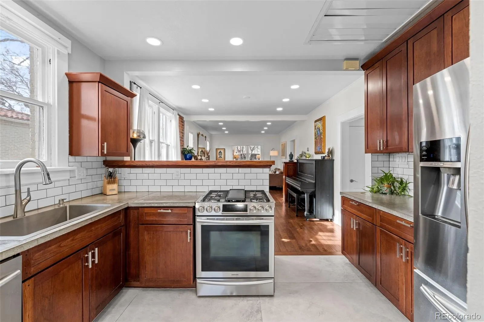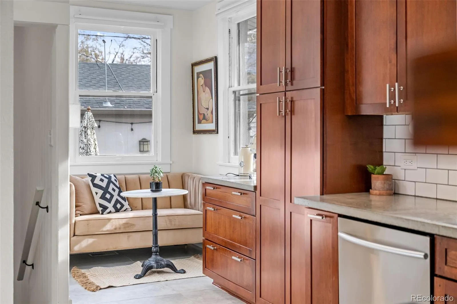 Thoughtfully remodeled throughout, this rare 3-bedroom, 2-bath main-level layout offers an airy open floor plan, plank flooring, and a sun-filled entry/foyer perfect for morning coffee and quiet moments. The living room features a marble-tile fireplace with a warm wood mantel and flows seamlessly into the dining room and kitchen. The kitchen includes a breakfast nook, wood cabinetry, concrete countertops, stainless steel appliances, and a stylish tile backsplash.