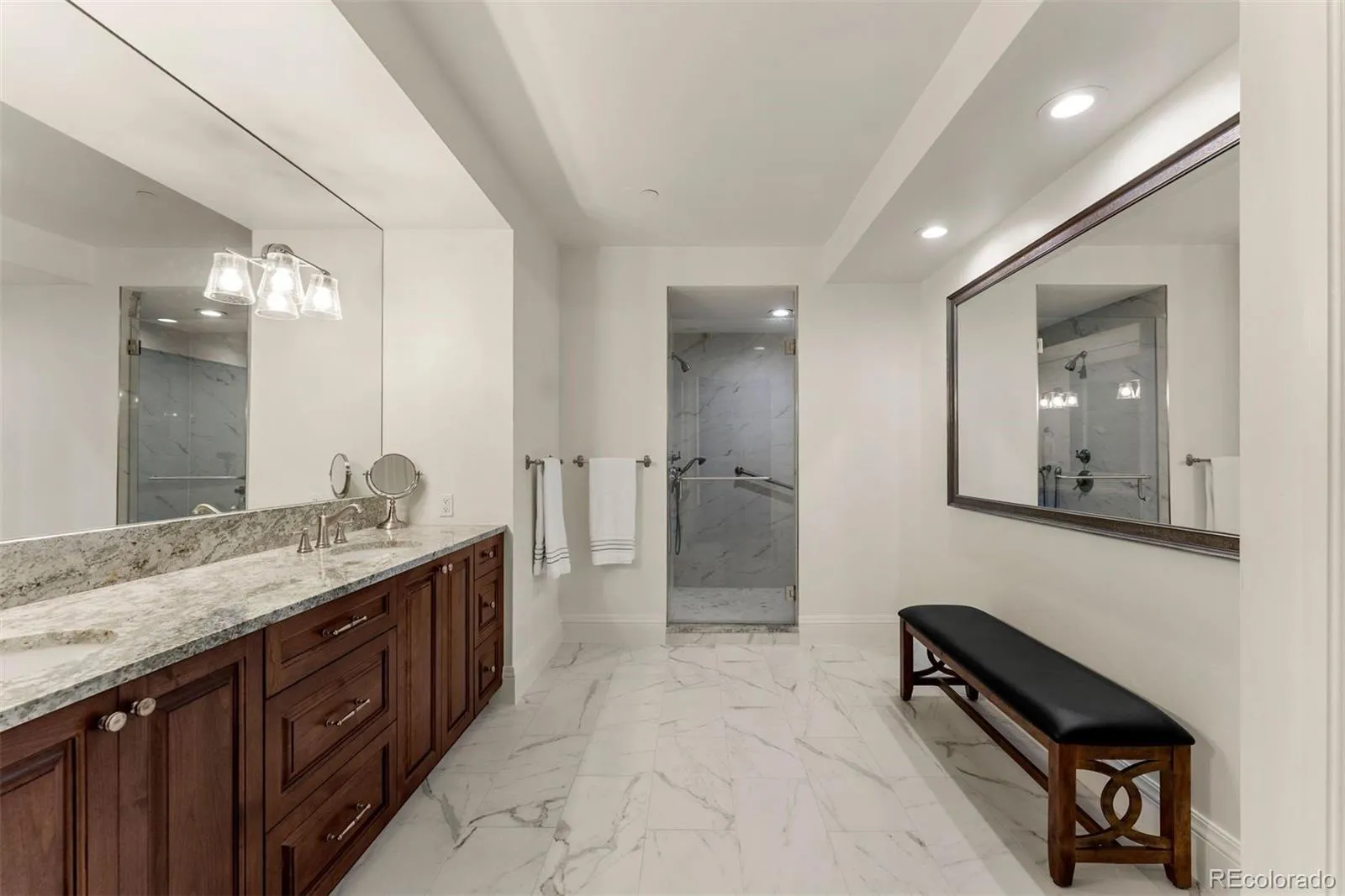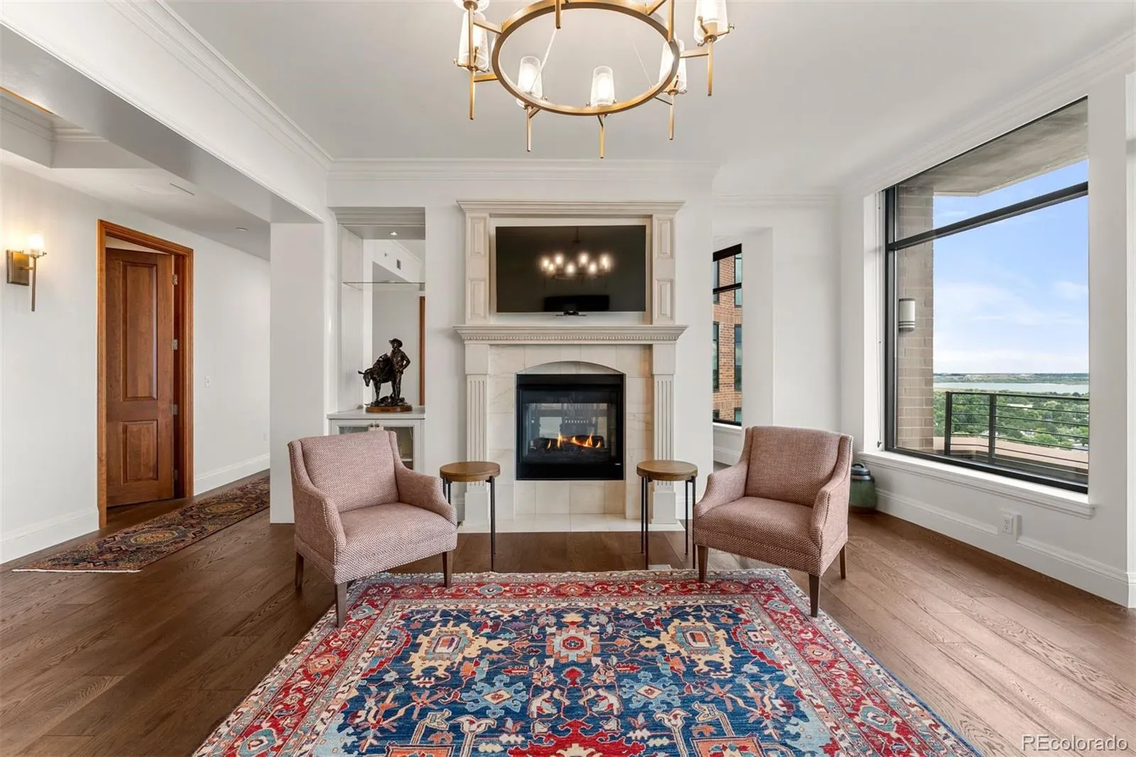 Soaring high above the Denver Tech Center, Residence 2301 at Penterra Plaza offers a rare blend of refinement, prestige, and elevated condominium living. This southeast-facing corner residence is framed by floor-to-ceiling windows with sweeping views of Cherry Creek Reservoir and beyond. Morning light fills the interiors while the southern and eastern exposures keep the home naturally cool throughout the day. An extensive renovation elevates the home with wide-plank Walnut hardwood flooring, designer lighting, fresh paint, and UV-protective shades with blackout screens in the bedrooms. The chef’s kitchen is both elegant and functional, showcasing striking new countertops and backsplash, premium appliances, updated fixtures, and a converted walk-in pantry. The primary suite is a serene retreat with a private sitting area, an oversized walk-in closet, and a spa-inspired bath reimagined with custom cabinetry, a glass shower, and luxury finishes. Expansive living and dining rooms, each anchored by a fireplace, connect seamlessly to a warm family room and private office, while the living room opens directly to a private balcony where views stretch endlessly across Cherry Creek Reservoir and the eastern plains. Residence 2301 includes two deeded parking spaces and two storage units. Penterra Plaza stands as the premier high-rise in DTC, offering unmatched amenities including a state-of-the-art business center, fully equipped fitness center, elegant community room with catering kitchen, and an expansive party terrace. Residents enjoy concierge service, secured parking, guest suites, and upcoming enhancements, including a redesigned lobby, new elevators, and a signature on-site restaurant. With effortless access to the area’s best dining, shopping, and entertainment, this home delivers the perfect blend of privacy, prestige, and ease.