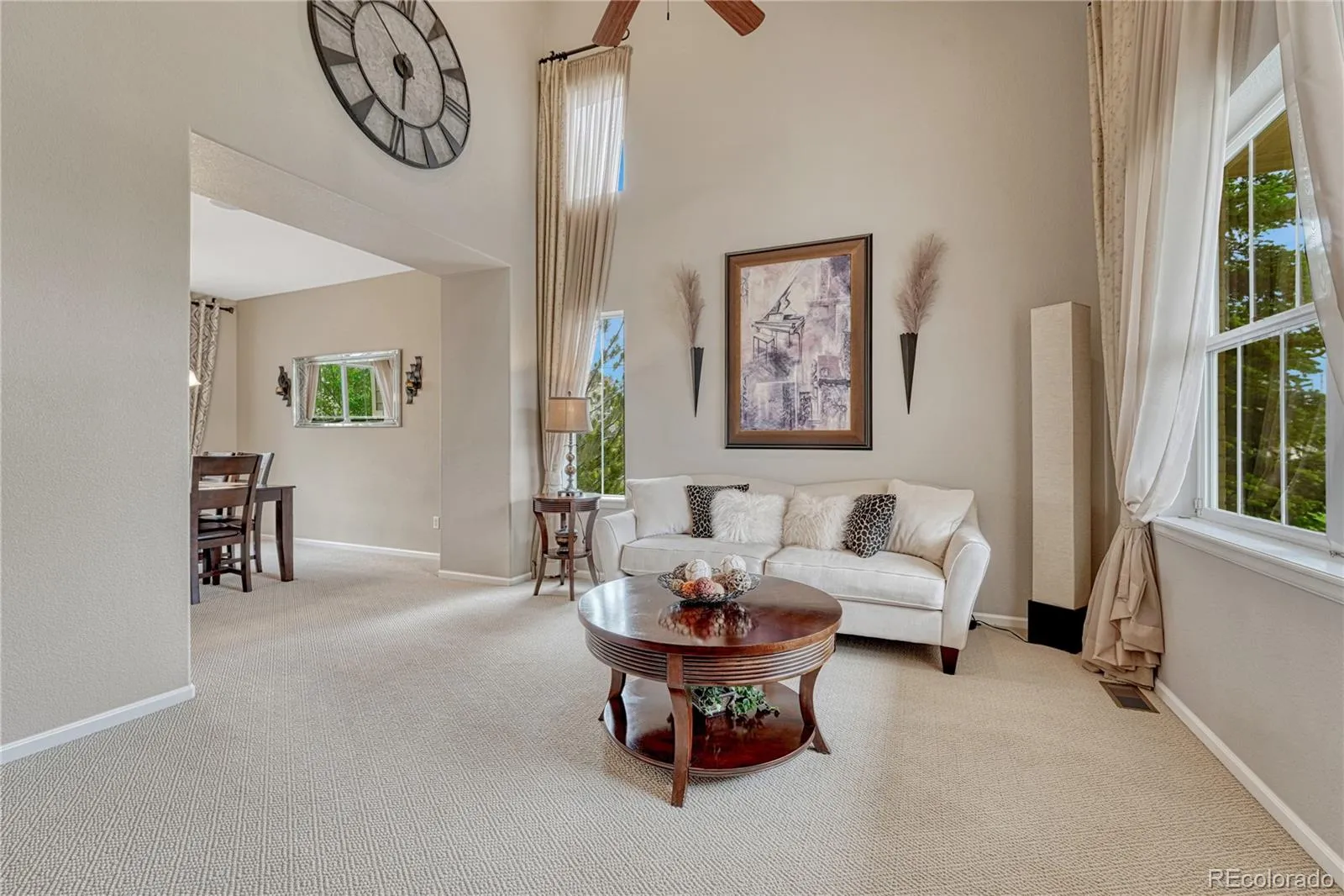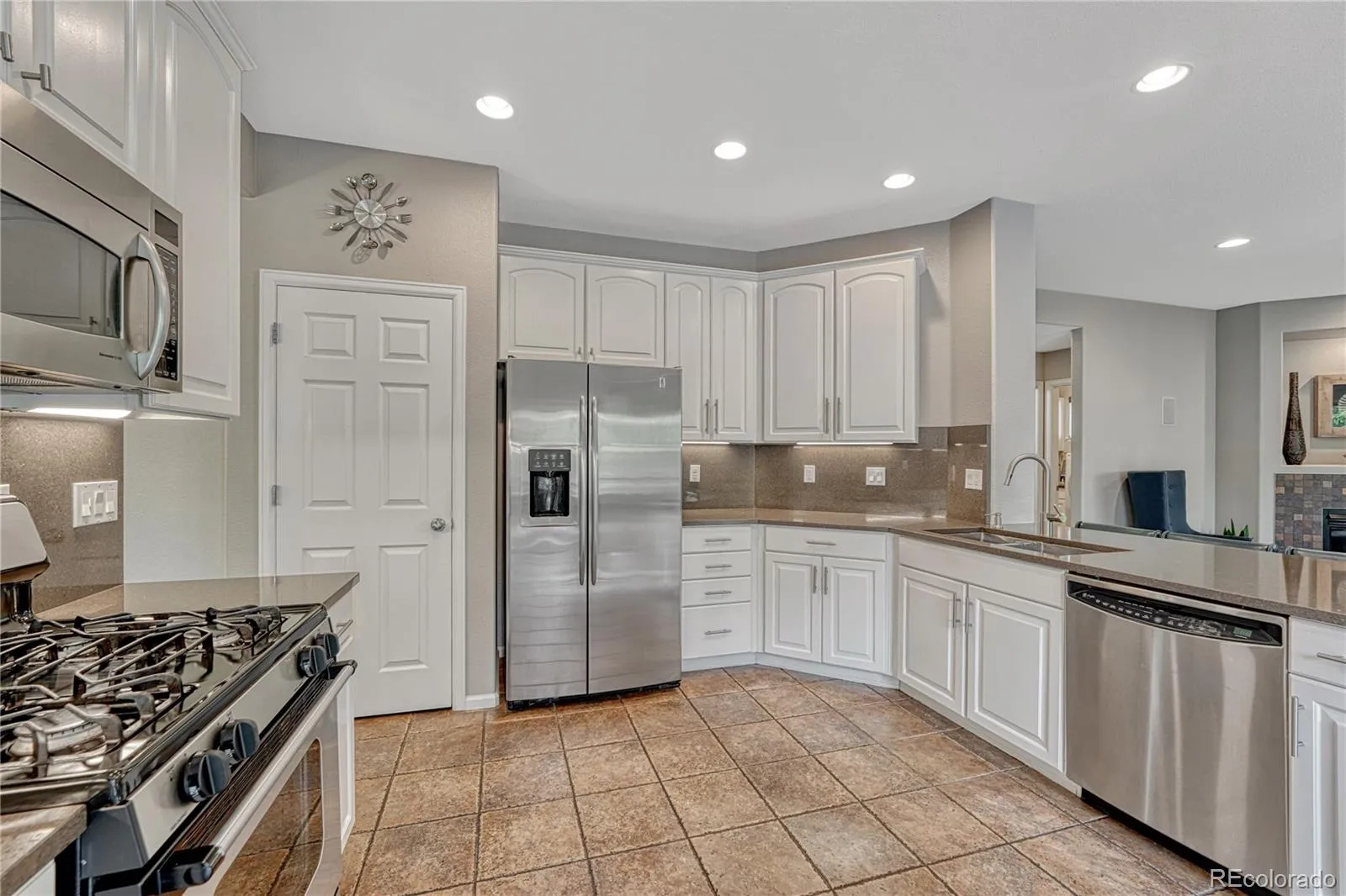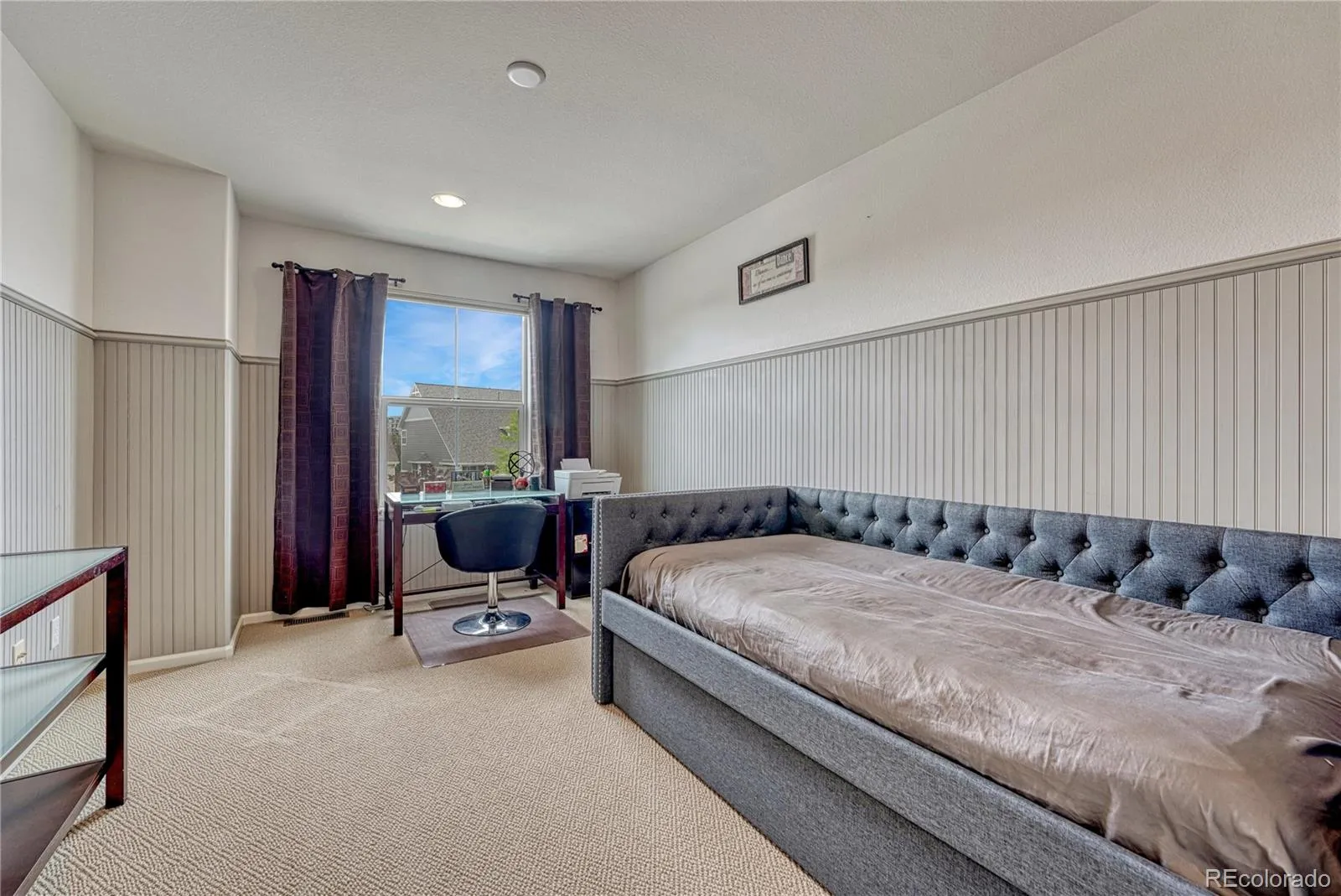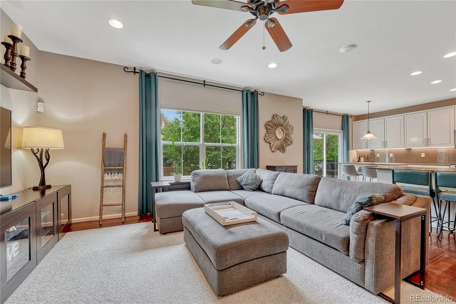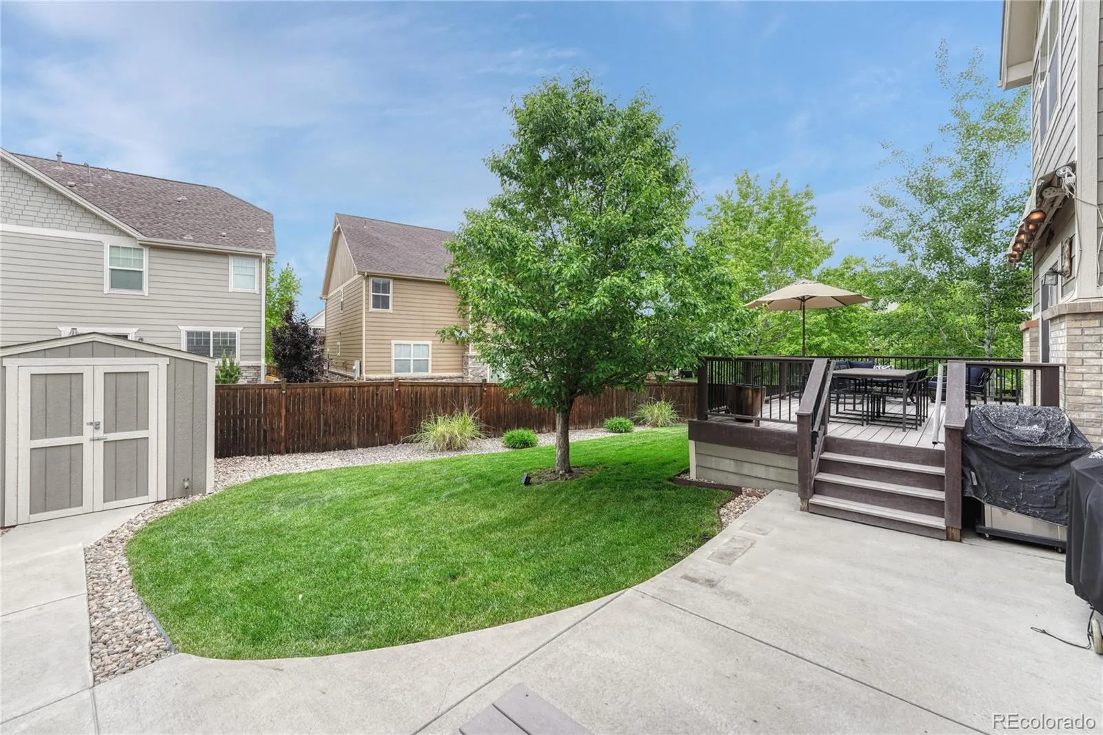 The backyard is ideal for outdoor enjoyment, a spacious deck with a remote-controlled retractable awning, mature trees, and a matching storage shed. Ideally located near a community park, shopping centers, Southlands Mall, and offering easy access to E-470 and DIA, this home truly has it all.