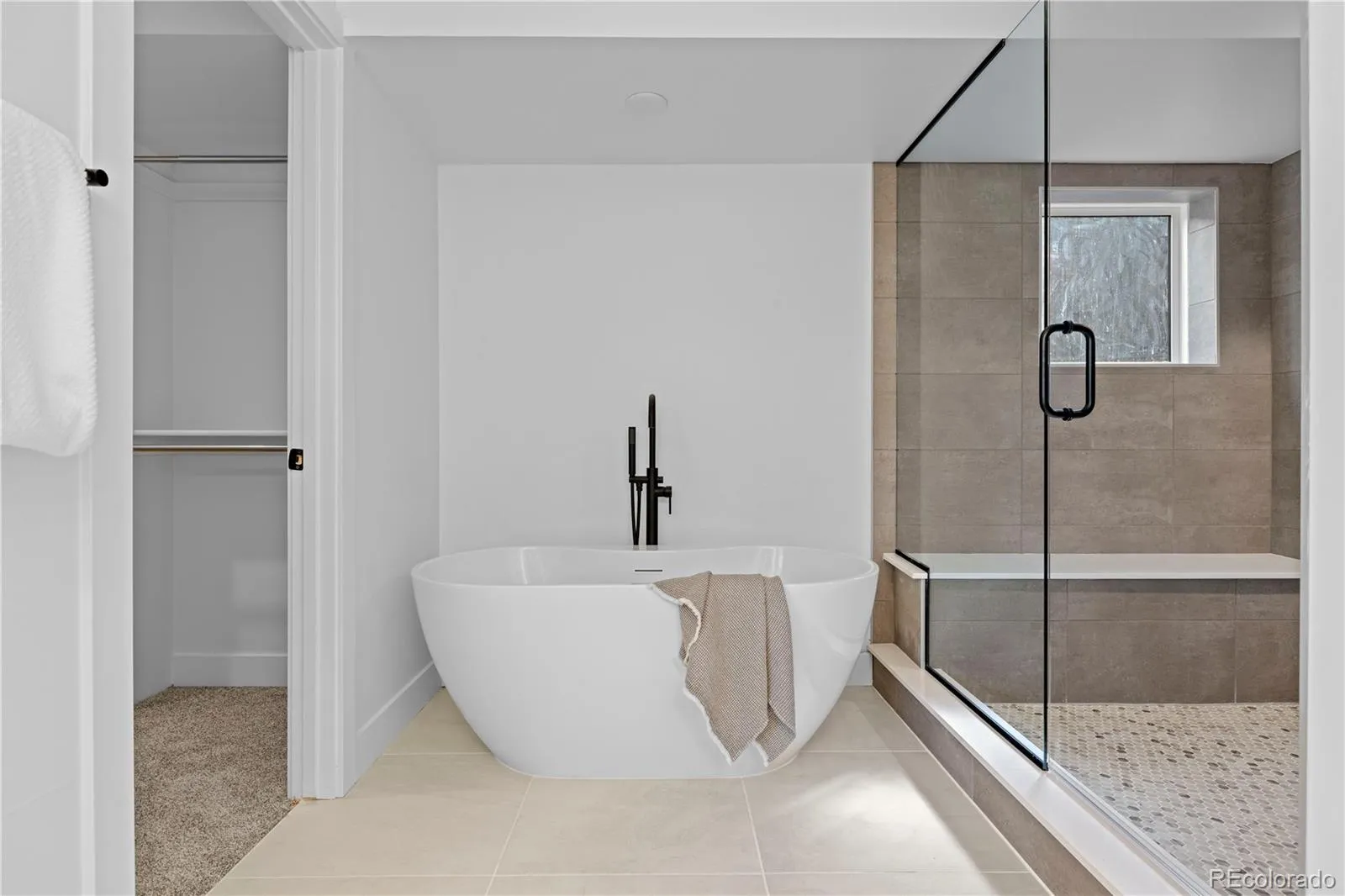 The second floor is dedicated to the primary suite, complete with a west-facing balcony, an en suite bathroom featuring a walk-in shower, stand-alone soaking tub, and an enormous walk-in closet.