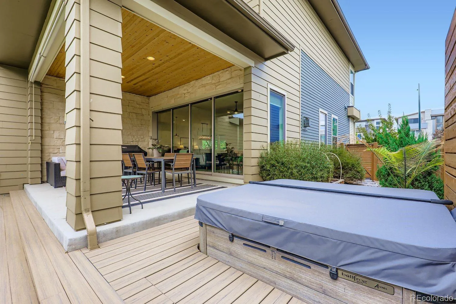 The airy open floor plan effortlessly merges indoor and outdoor spaces, featuring a grand great room complete with built-in speakers and a secluded backyard paradise. Indulge in leisure with the 6-person Bullfrog hot tub, set amidst a professionally landscaped haven that includes a charming veggie garden and a generous covered patio, perfect for both relaxation and entertaining. The main floor delights with a large walk-in pantry, a custom mudroom bench, and a chic custom-built office/playroom designed for both comfort and productivity.