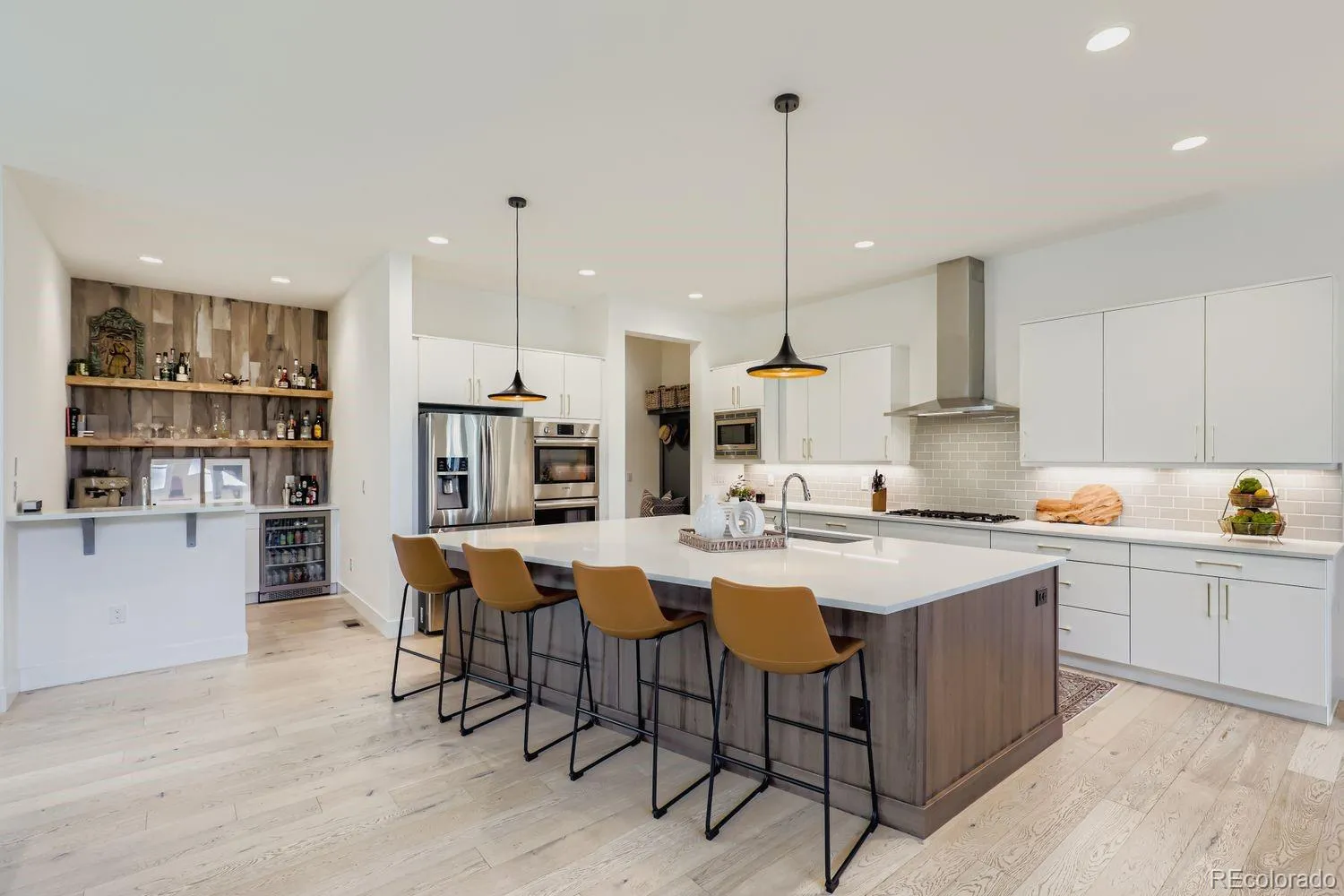 Host gatherings with ease at the stylish custom-built wet bar and bar area, while the gourmet kitchen dazzles with spacious quartz dine-in counters, sleek 42-inch upgraded cabinetry, and premium stainless-steel appliances. Ascend to the upper level to find four expansive bedrooms, including a breathtaking primary suite featuring a spa-like bathroom that offers a tranquil escape. Enjoy the perfect blend of functionality and luxury with a custom-built-in primary closet that complements the home’s sophisticated design.