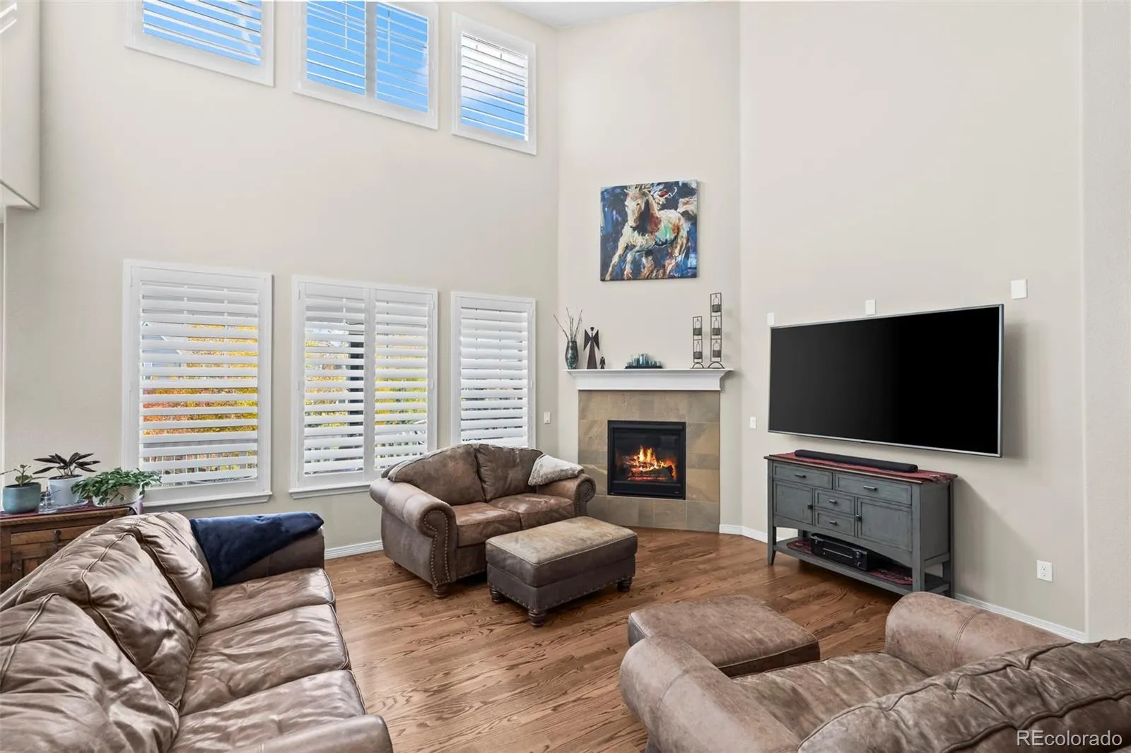 Perfectly situated in the heart of Arvada’s acclaimed Leyden Rock, this beautifully maintained home offers the rare advantage of being just a short, easy stroll from the community park, clubhouse, and pool amenities. Designed to impress, the main level welcomes you with soaring vaulted ceilings that create an immediate sense of grandeur and scale. At the heart of the home, the expansive kitchen centers around a large island, perfectly designed for morning coffee or hosting evening gatherings. Throughout the entire home, custom plantation blinds provide a sophisticated touch of privacy and style.