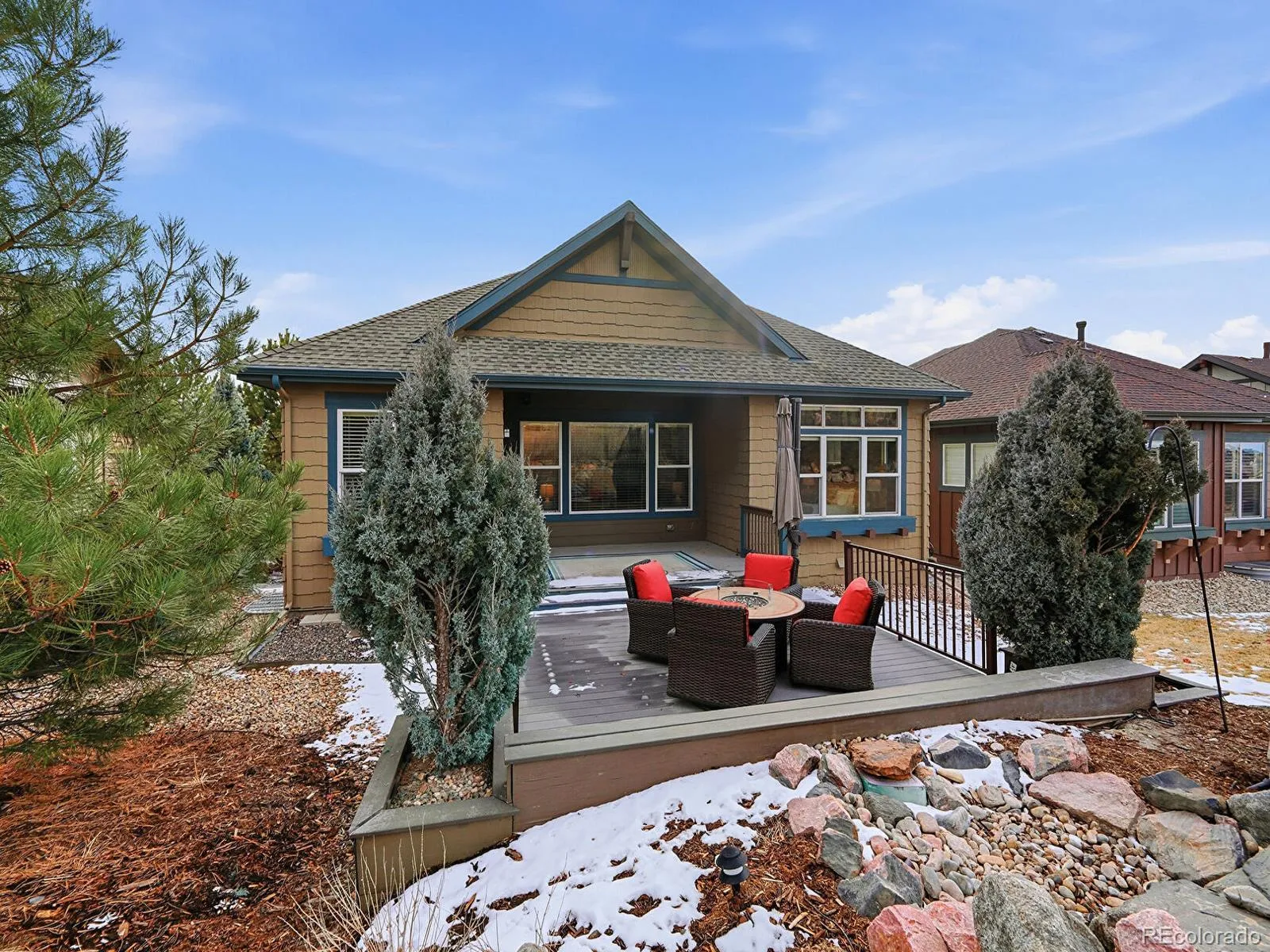 Supremely private Tallyn’s Reach ranch with a finished basement, tucked into a quiet cul-de-sac backing to private hill space! Made for effortless main-level living, enter this 3-bed, 3-bath gem through a welcoming covered front porch into high ceilings and bright windows that span the main floor. Just off the foyer sits a flex space, currently a home office, that could easily become a formal dining room, playroom, or second living space. Enjoy movie nights or game days in the living area, boasting a cozy gas fireplace and dramatic picture window with backyard views. Make meals or memories in the adjacent kitchen, featuring granite countertops, stainless steel appliances, alongside a generous island with bar-height seating, dedicated pantry, and window-wrapped breakfast nook with deck access. Unwind in the private, main-level primary suite, where a full wall of windows and 5-piece en suite bath create a spacious retreat. The five-piece en suite includes a seated vanity, deep soaking tub, standing shower, and a walk-in closet with built-ins. A nearby main-level powder bath and a laundry/mudroom with cabinetry add everyday practicality. Downstairs, the finished basement is ready for memorable nights or relaxed weekends, complete with a rec room, finished bar, wine fridge, mini fridge, cabinetry, and a second gas fireplace. Two additional bedrooms, a full bath, and generous unfinished storage offer room to grow, host, or create. In the backyard, a covered patio with built-in sound system and an extended deck back to a gentle hillside, where a cascading water feature and local wildlife sightings create a space that feels quiet, green, and wonderfully private. Whether you’re in the mood for spotting owls and deer in the backyard or enjoying amenities right in the heart of Tallyn’s Reach, this home is set just minutes from Red-Tailed Hawk Park, Southlands Mall, and the Aurora Reservoir.