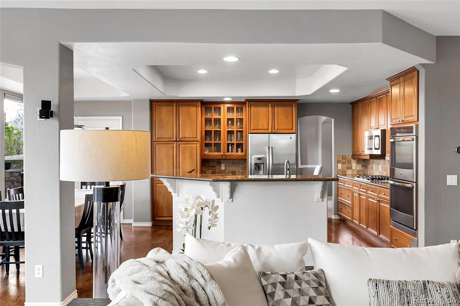 microwave with ample cabinetry and bar seating. Natural sunlight floods in through the numerous windows, and the space