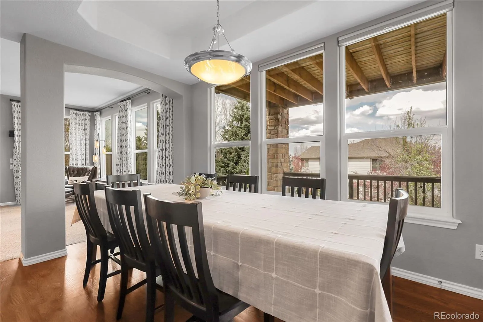 the private and expansive wrap-around upper deck. The family room, adorned with a wall of windows, high ceilings, and a