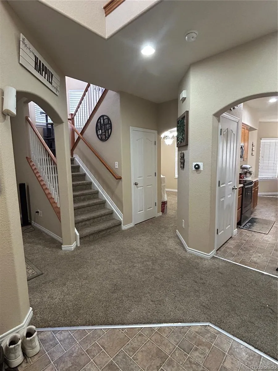 Beautiful well maintained two story home ready for immediate occupancy. Located on a peaceful dead end street. Open spaced floor plan with many windows and natural sunlight. Boasting a formal dining room & living room with beautiful arches and coffered ceiling details. Generous storage and cooking space in the kitchen with stainless steel appliances & large pantry. Room for fun and entertaining or curl up to a cozy fireplace and enjoy the peace. Master bedroom with a huge walk in closet & 5 piece en suite bath. 3 additional good size bedrooms, main bath with double sinks. 2nd level loft flex space. Oversized 2 car garage offers you plenty of storage and parking space. Seller has finished the garage walls beautifully with dry wall and texture. The basement is unfinished. Walking distance to the popular and beautiful open spaced Frontera Park established in 2015. 7.2 miles to Denver International Airport. This is a very nice home