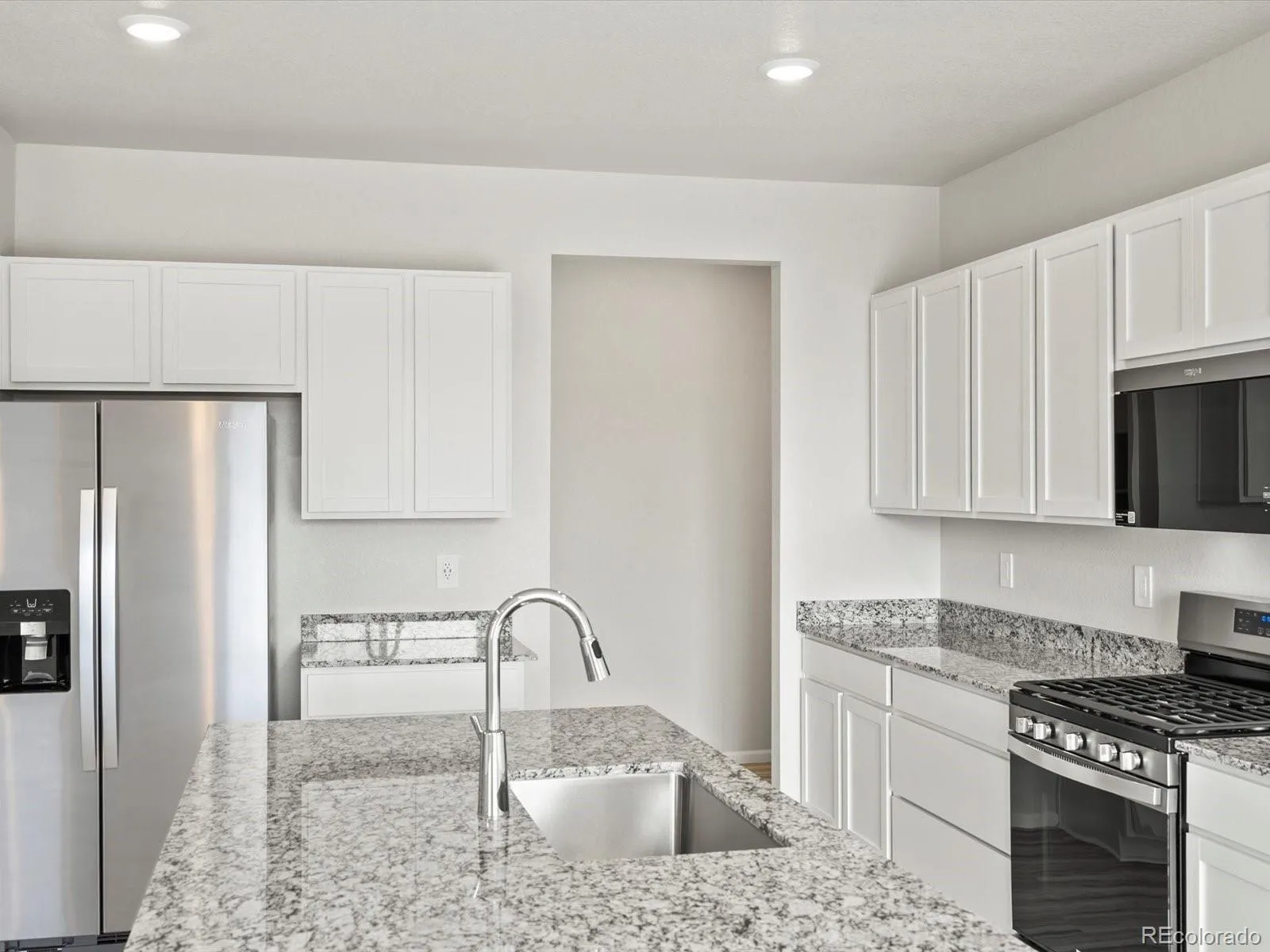 Open concept kitchen with granite countertops and white cabinets!