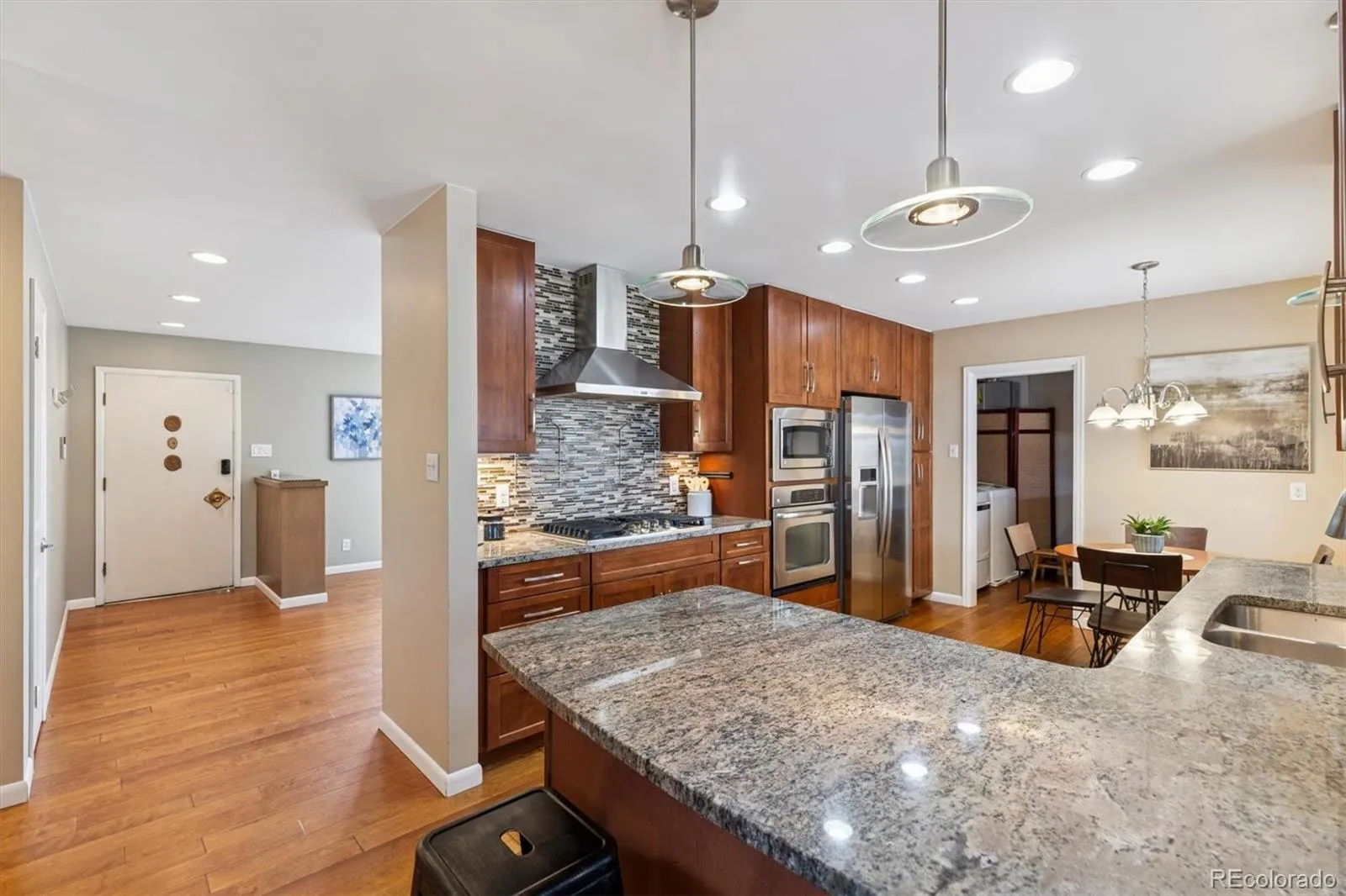 Located in the highly desired Melrose Manor neighborhood of Wheat Ridge on a .34-acre lot, this all-brick mid-century ranch is perfect for those looking for one-level living! You’ll be wowed by the generous room sizes not typical of homes built in this era. Walk through the front door into the spacious living room that flows to the family/dining room with a floor-to-ceiling brick surrounded gas fireplace. The updated kitchen has a breakfast nook, newer cabinetry, sleek granite countertops, and stainless-steel appliances including a 5-burner gas cooktop. The kitchen and dining room are off the partially covered back patio making entertaining, indoors and out, a delight! The primary bedroom has 2 closets, and an updated en-suite 3/4 bath. 2 additional nice-sized bedrooms share a vintage original mint green and yellow full bath. The laundry room with washer & dryer, and an entertaining bar with beverage cooler have access to the back patio. You’ll love spending time outdoors on the partially covered back patio with party string lights that overlooks the huge back yard with fenced in gardening area and garden shed. There is plenty of room for your cars and toys in the 539 sqft 2 car oversized attached garage and the extra-long driveway. Evaporative cooler. Tankless water heater. Vinyl windows. Radon mitigation system. Conveniently located to “Ridge at 38” featuring multiple restaurants, lounges & boutique shopping experiences, 3rd Shot Indoor Pickleball, Wheat Ridge Rec Center, Jeffco schools, highway access, the RTD bus line, and much more!
