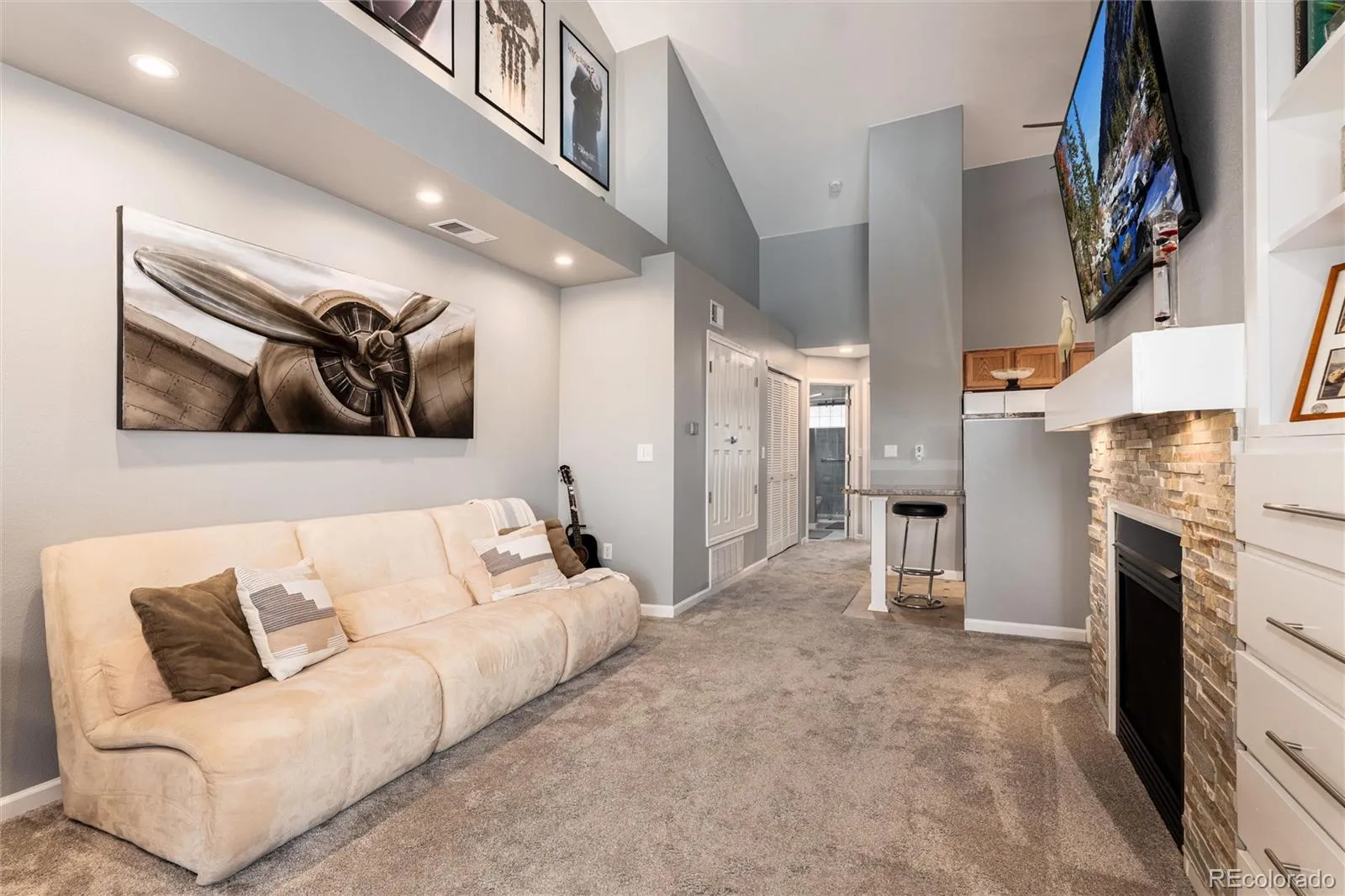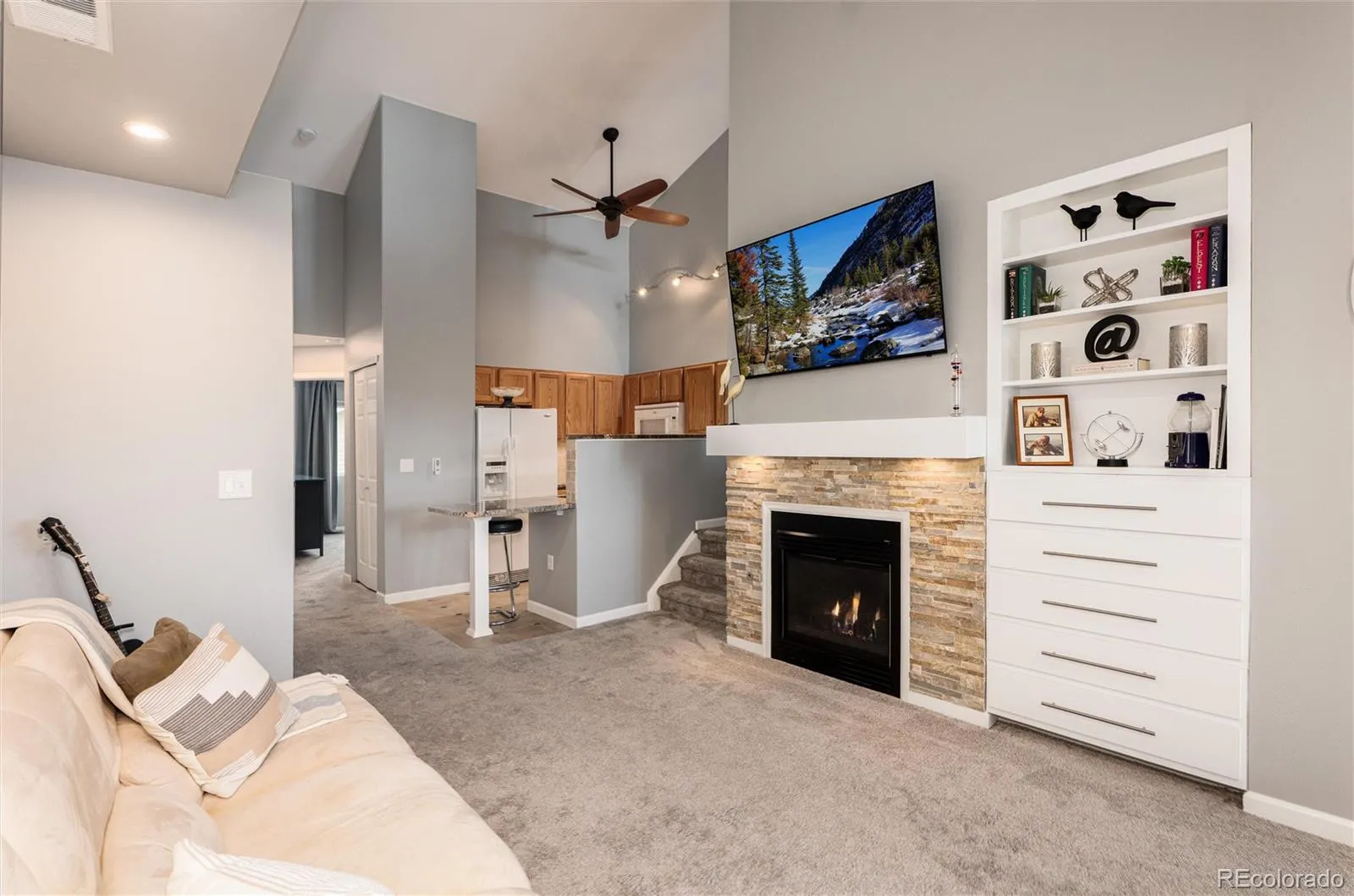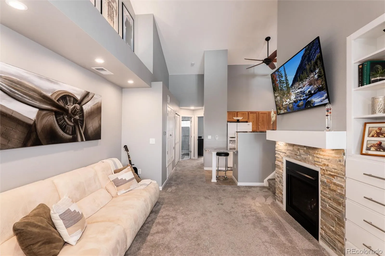 Welcome to this special condo offering a spacious feeling with two story and vaulted ceilings. You have a covered front porch or direct garage access. The living area features a stacked stone gas fireplace and custom cabinetry, open to the kitchen with granite counters and a custom eating extension. Down the hall, you’ll find a spacious bedroom with vaulted ceilings, a remodeled bathroom with the best shower you have ever seen. Washer and dryer are nearby and included. Upstairs, a versatile loft offers endless possibilities—use it as a second bedroom, office, or additional living space. No worries about needed upkeep- the windows were repalced in 2024 and the furnace, air conditioner and hot water heater were replaced in 2025. The water heater is tankless – providing an endless supply of on-demand hot water. A private stairway from the entry provides direct access to the attached 1-car garage. The pool is conveniently just out the front door. Unobstructed view to the mountains in the west. Walking distance to King Soopers, shops and restaurants. This is a meticulously kept unit in a prime location within Stone Canyon.