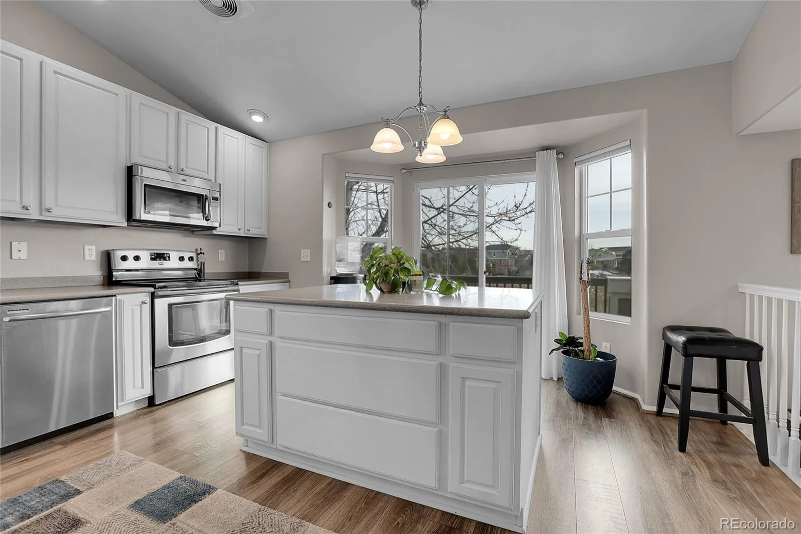 Inside, the home is filled with natural light and vaulted ceilings, creating an open, inviting atmosphere. The kitchen is both functional and stylish with white cabinetry, stainless steel appliances, and a spacious center island, ideal for everyday living and entertaining. The main living area is anchored by a gas fireplace, adding warmth and charm.