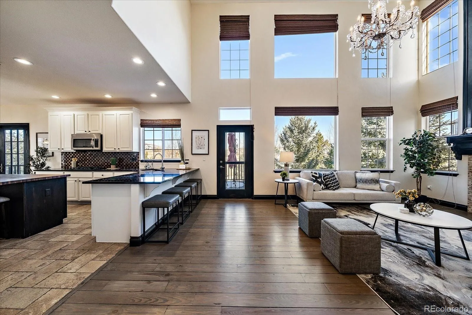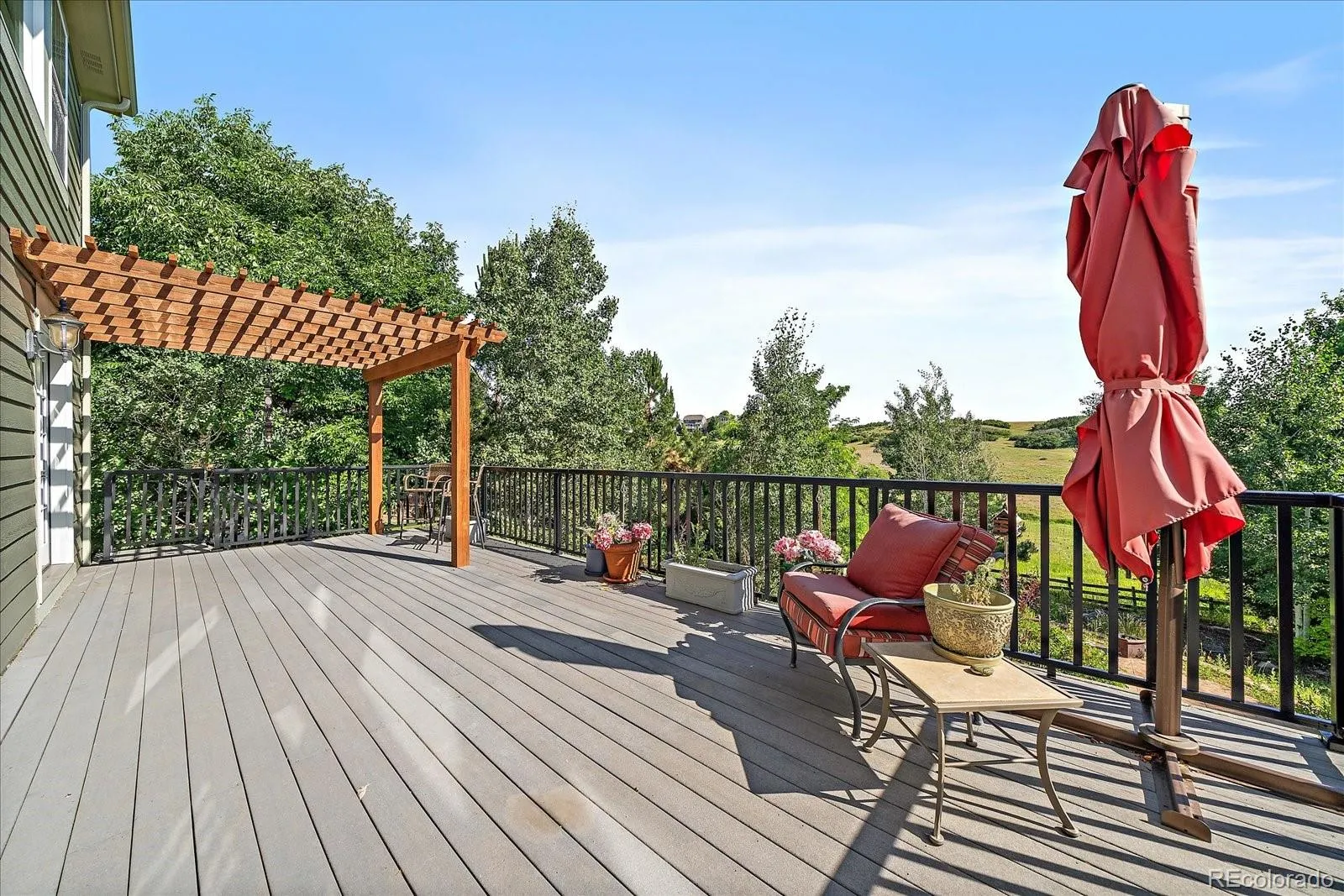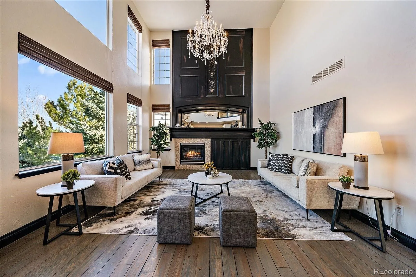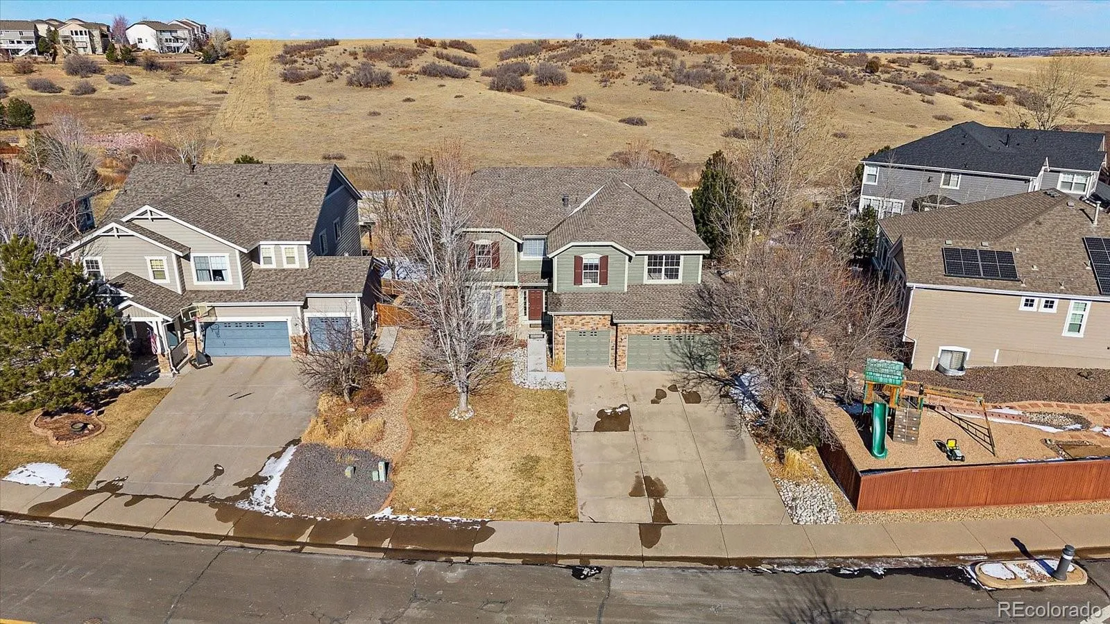 Designed for space, flexibility, and connection to the outdoors, this custom Sapphire Pointe home offers scenic open space views and multiple areas to gather or unwind. Recent updates include a new roof and elegant 5-inch trim, while custom skip-trowel wall texture throughout adds warmth and character. The welcoming entry features a vaulted ceiling, travertine tile inlay, and a dramatic spiral staircase that sets the tone for the home’s thoughtful design. A classic floor plan offers formal living and dining rooms filled with natural light, along with a private study behind French doors—ideal for working from home or creative pursuits. The vaulted family room is anchored by a grand fireplace and expansive windows that frame the open space beyond. At the heart of the home, the kitchen is designed for both function and entertaining, featuring granite countertops, a butcher block island, gas cooktop, double ovens, and generous cabinetry. The casual eating area includes plenty of cabinets, desk space and opens to an oversized deck with pergola—perfect for outdoor dining and summer gatherings. The upper level is highlighted by a spacious primary suite overlooking open space, complete with a sitting area, three-sided fireplace, and a well-appointed five-piece bath with granite counters and inlaid travertine tile flooring. A large walk-in closet with center island and custom built-in adds a touch of luxury. Three additional bedrooms complete the upper level, including one with an ensuite bath and two connected by a shared bathroom. The fully finished walk-out basement adds exceptional versatility, offering a second full kitchen, family room with fireplace, two additional bedrooms, each with a sink, laundry hookups, and flexible living areas well-suited for multigenerational living or extended guest stays. With new carpet, fresh paint, open space views, and room to live and grow, this home offers a distinctive opportunity in a desirable Castle Rock setting.