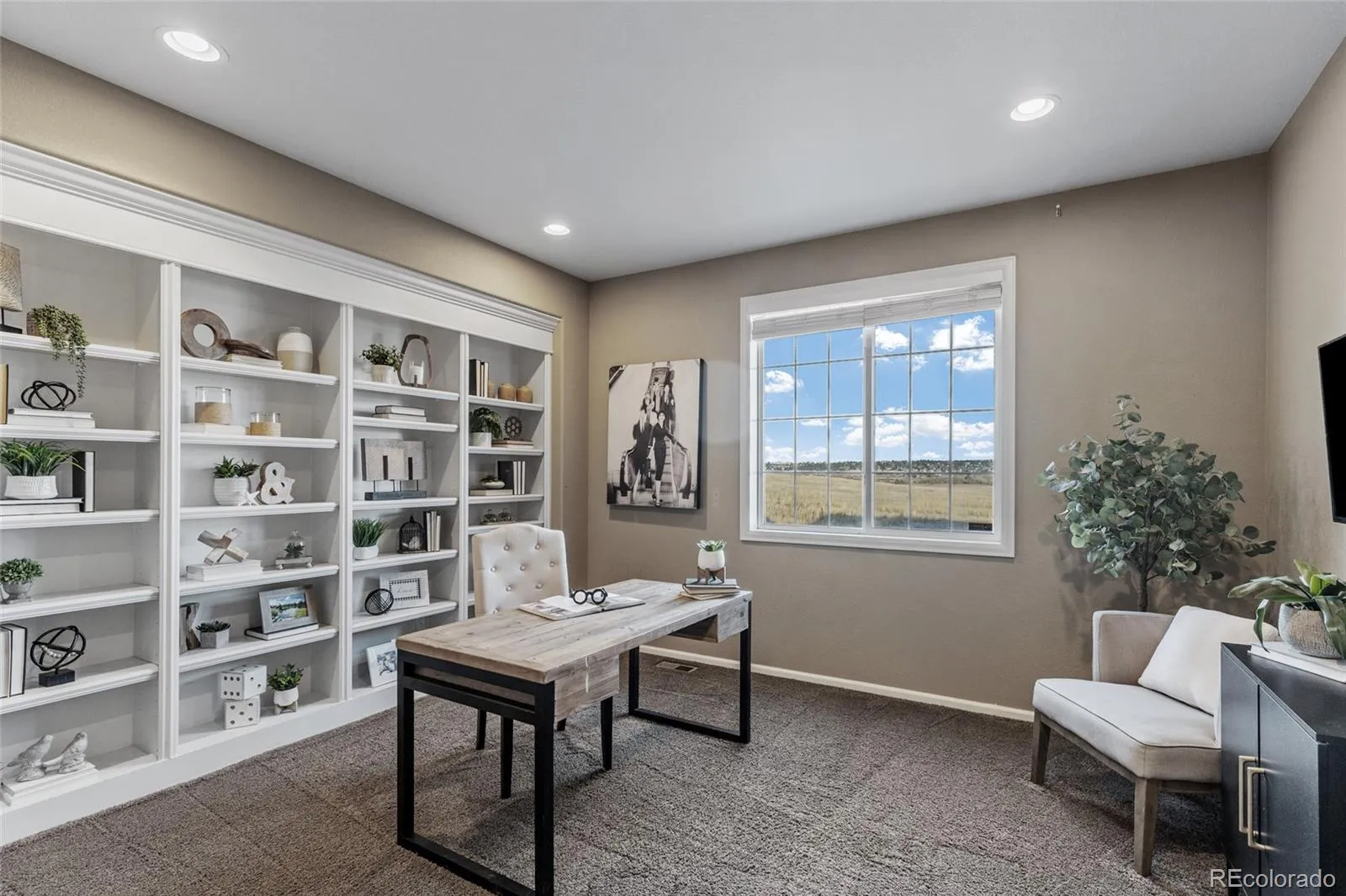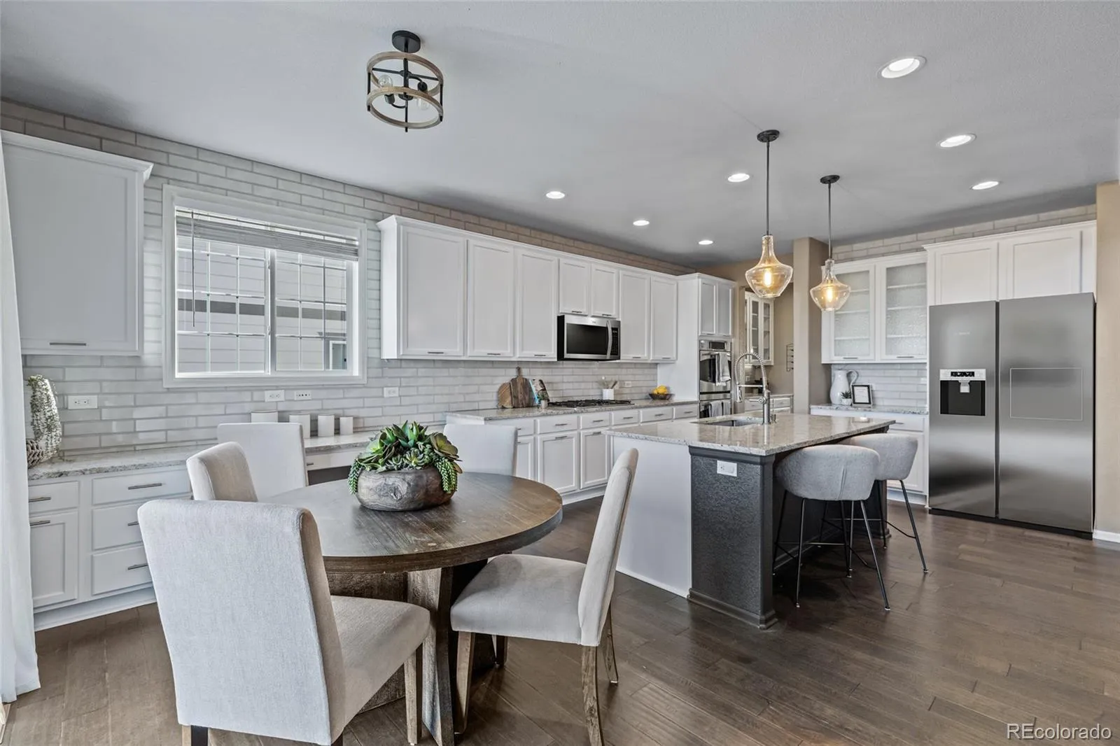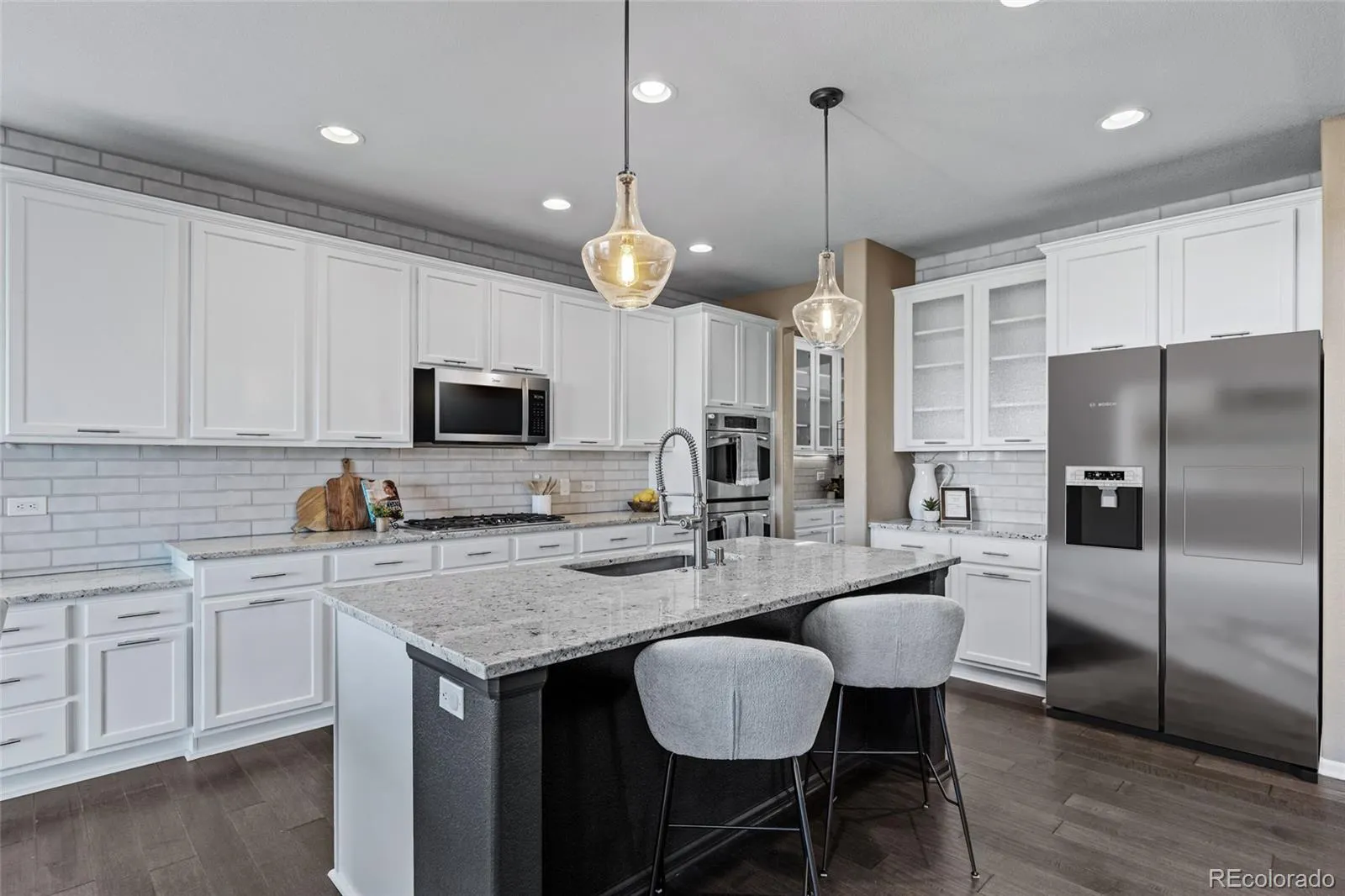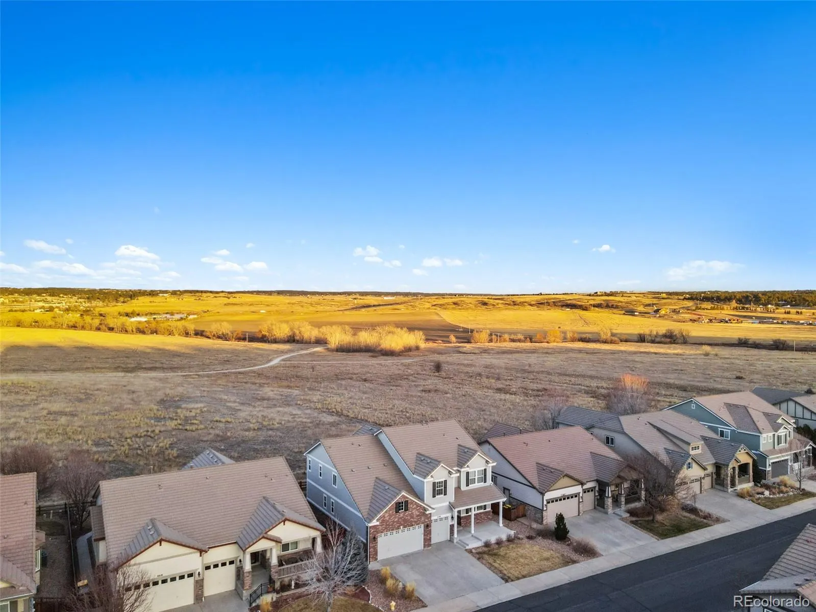 Stunning 5-bedroom, 4-bathroom, 3-car garage home in the highly coveted Cobblestone Ranch community of Castle Rock. Perfectly positioned on expansive open space, this home offers rare privacy, breathtaking views, and a peaceful Colorado backdrop that feels endless. From the moment you enter, you’re greeted by soaring vaulted ceilings, an open-concept layout, and an abundance of natural light that creates a bright, warm, and welcoming atmosphere throughout. Dark hardwood floors provide striking contrast against crisp white cabinetry, elegant wood trim, and clean, modern finishes. The heart of the home centers around a show-stopping fireplace adorned with white stacked stone, a down-lit mantel and rich wood beam above—an architectural focal point that blends timeless elegance with modern design. The kitchen flows seamlessly into the living and dining spaces, ideal for both everyday living and entertaining. Step outside to a covered patio and private backyard, where incredible open-space views create the perfect setting for morning coffee, evening gatherings, or quiet evenings relaxing from your busy day under the unmatched Colorado sky. The finished basement elevates this home even further, offering a versatile golf simulator space that easily converts into a private movie theater, along with a dedicated workout room, bringing luxury, recreation, and convenience together under one roof. Additional highlights include a durable concrete tile roof, brick exterior, and thoughtful design throughout. Residents of Cobblestone Ranch enjoy access to a resort-style community pool, scenic parks, walking trails, and sweeping neighborhood views. Warm, inviting, and filled with incredible energy, this home offers the perfect balance of elegance, comfort, and Colorado lifestyle. Truly a rare opportunity backing to wide-open space in one of Castle Rock’s most desirable communities.