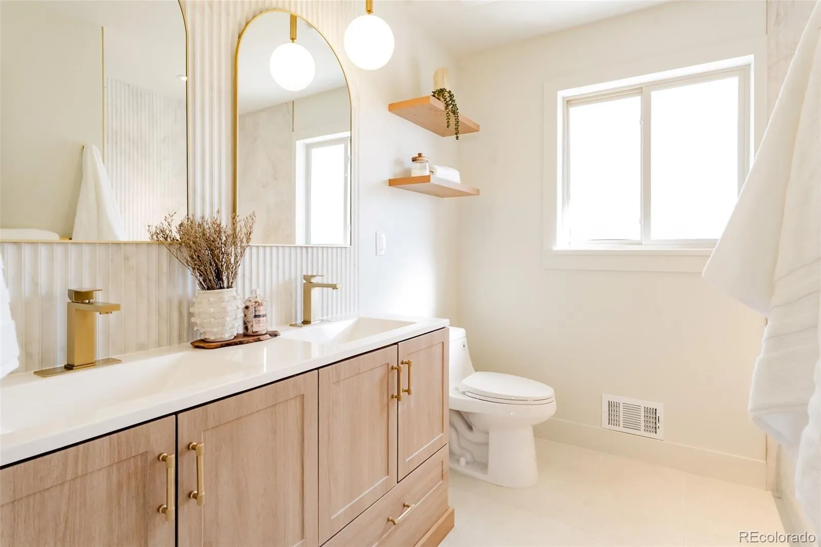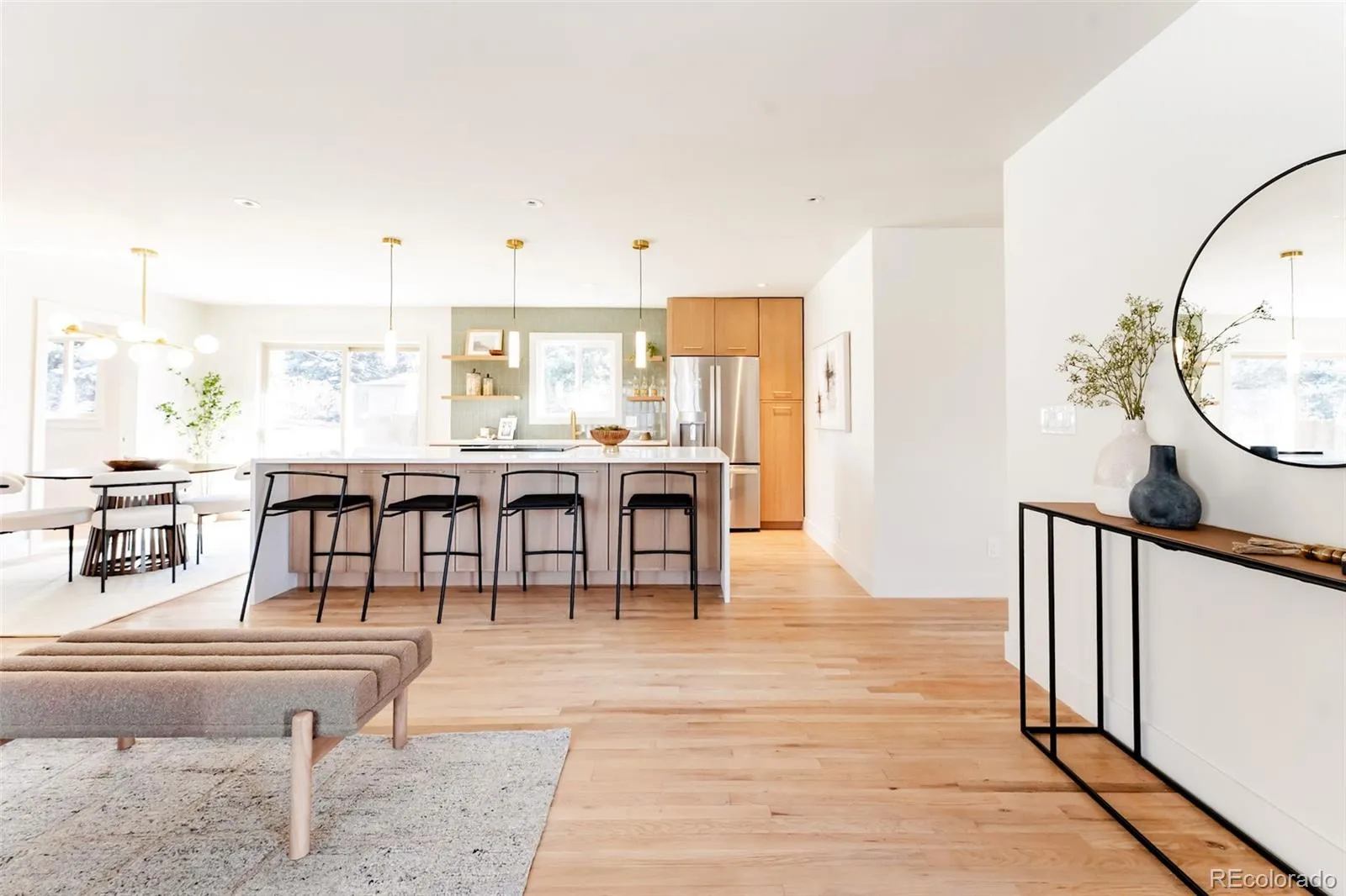 This stunning home features a bright, open floor plan filled with natural light and modern finishes throughout. The sophisticated kitchen boasts a waterfall island, elegant wood cabinetry, pendant lighting, a large quartz countertop, fully tiled backsplash, and tasteful gold accents—perfect for everyday living and entertaining. The main level retains its charm with original hardwood floors and fresh paint, while thoughtfully designed spaces create a warm, contemporary feel the moment you walk in. Enjoy the rare convenience of a primary bedroom on each level, ideal for multi-generational living or guest privacy.