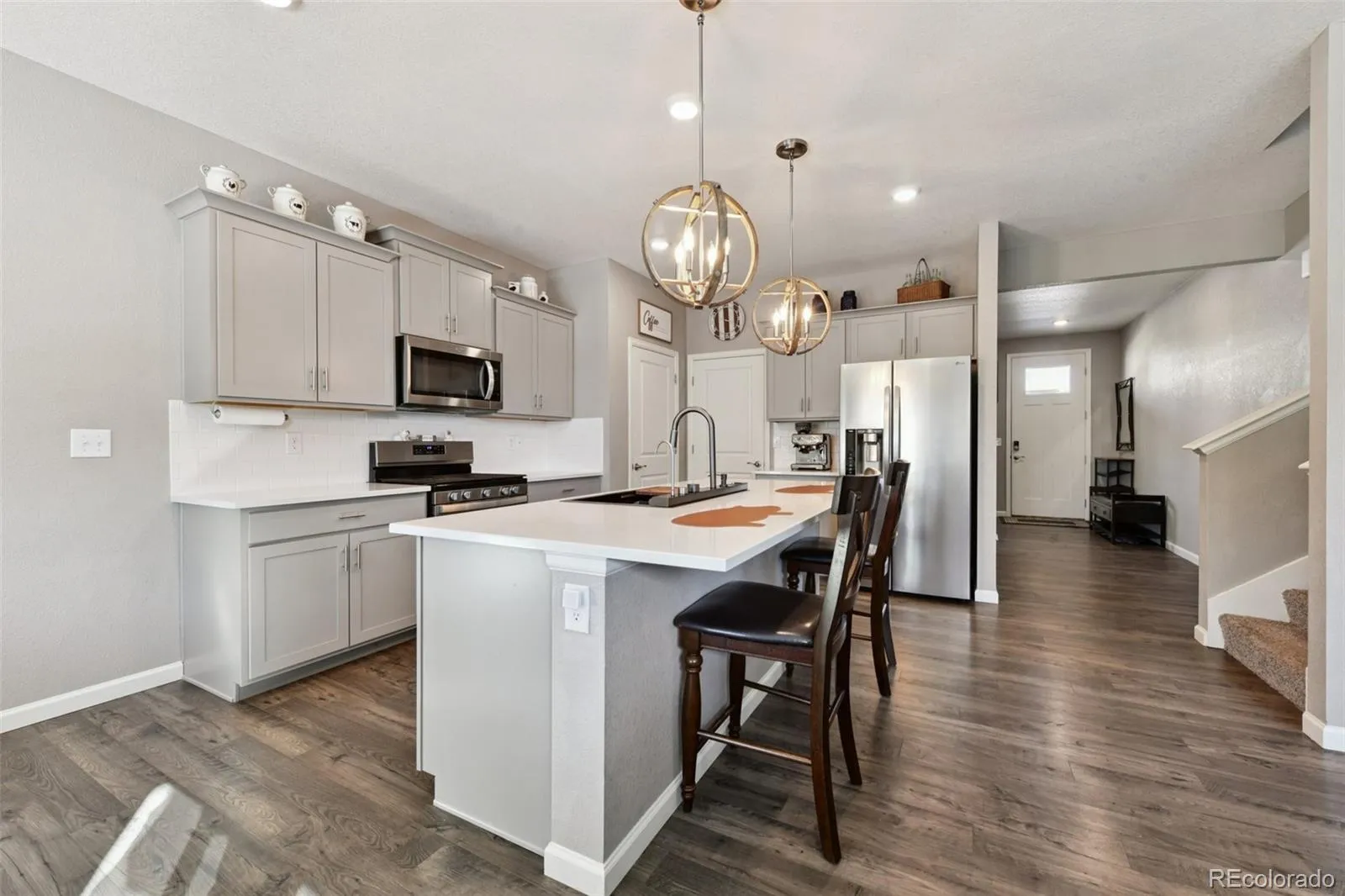 Are you looking for space, flexibility, and long-term potential in Parker? This thoughtfully designed 5-bedroom, 3-bath home offers an open-concept main level that is ideal for everyday living and entertaining. The kitchen is the hub of the home, featuring a large quartz island that flows seamlessly into the family room, where a cozy gas fireplace sets the tone for relaxed evenings. Separate eating & dining rooms add more than enough space for gatherings and celebrations. A main-level bedroom and full bath add valuable flexibility for guests, a home office, or bonus living space.